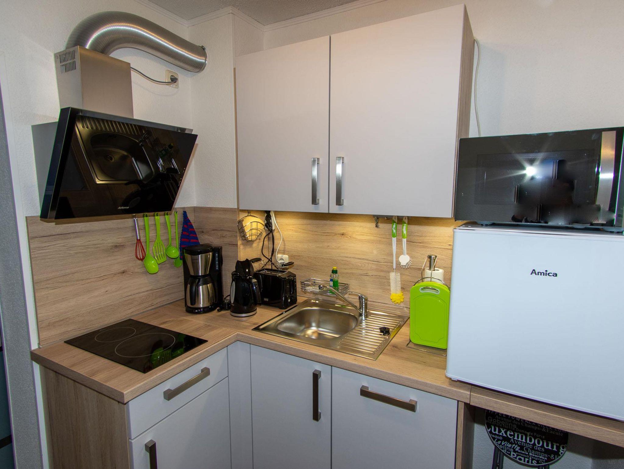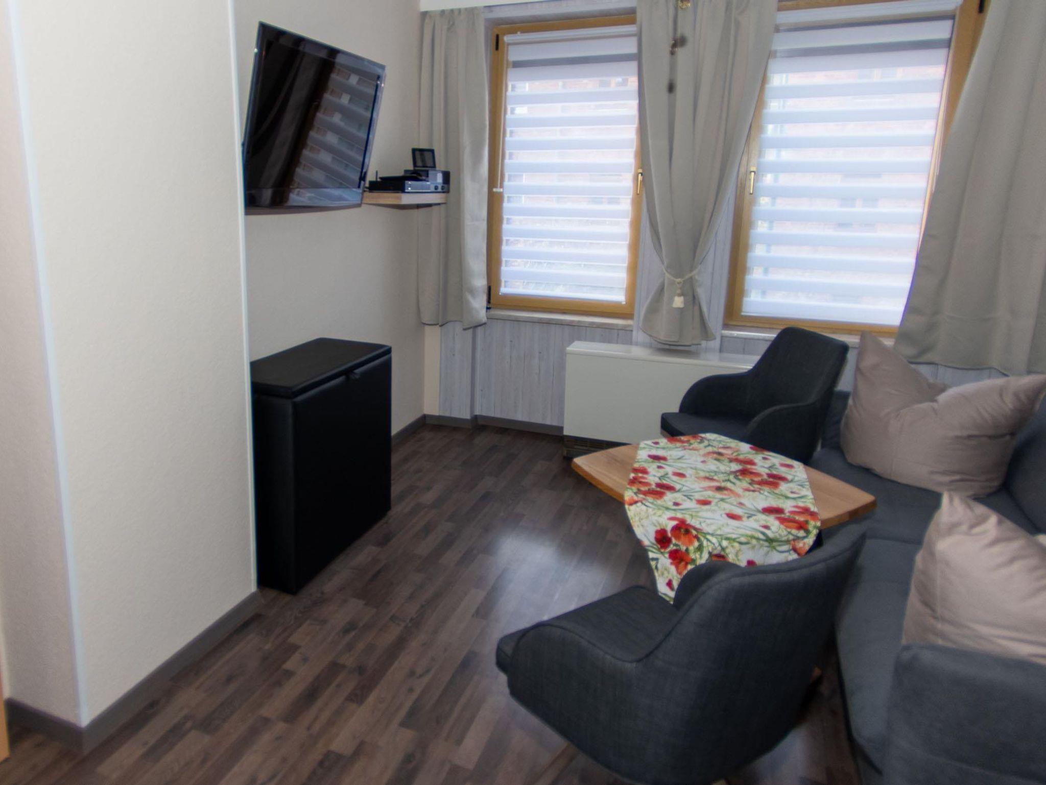 Neu eingerichtete Ferienwohnung mit Wohnschlafzimmer, SAT - TV, kleine Küche mit E-Herd, Kaffeemaschine, Toaster, Wasserkocher,Geschirrspülmaschine. Bad mit DU/WC.