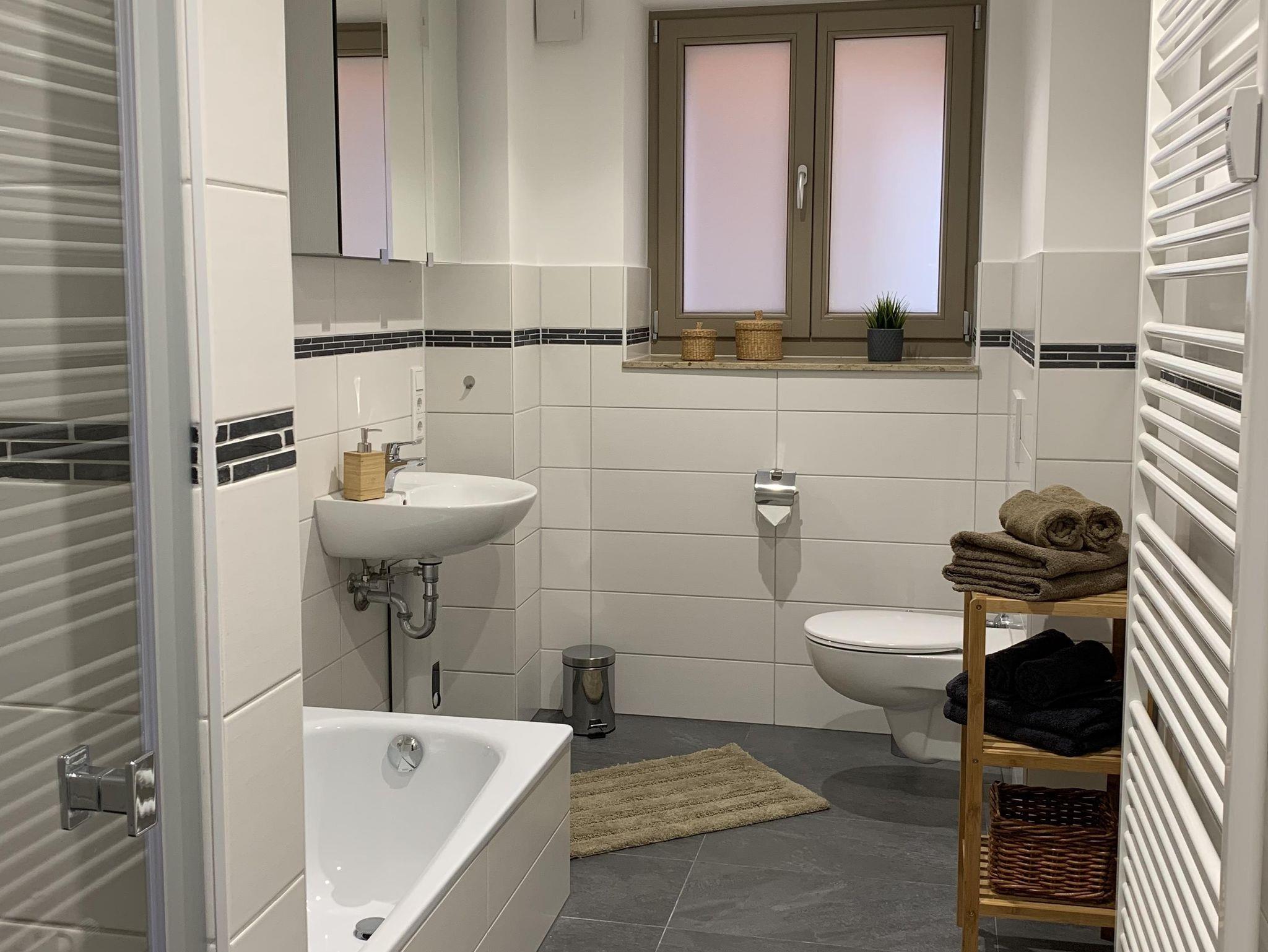 Ferienwohnung Bournville, modern ausgestattet mit Wohnschlafzimmer, SAT-TV, Schlafzimmer, Bad mit Wanne und DU/WC, komplett ausgestatte Küche mit Essbereich und direktem Zugang zur Terrasse, Einbauküche mit E-Herd, Backofen, Geschirrspüler, Kaffeemaschine, Toaster,Mikrowelle, Wasserkocher. Kühlschrank mit Gefrierfach.