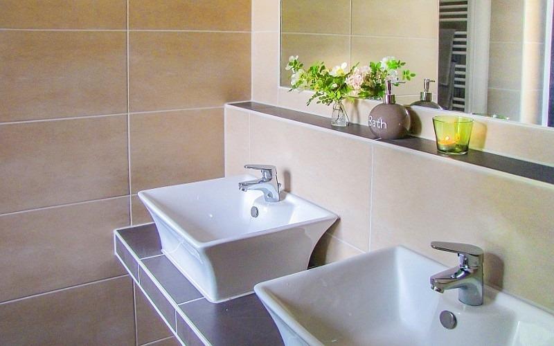 - modernes, ebenerdiges Duschbad mit Fenster. Doppelwaschbecken & WC