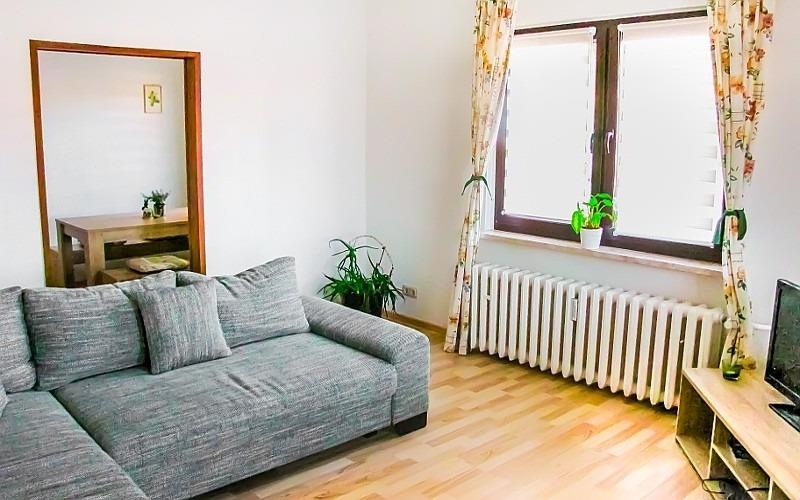 - Wohnzimmer mit Sofaecke und Kuscheldecke. Kabel-TV, Plasma-Fernseher, DVD-Player und Playstation