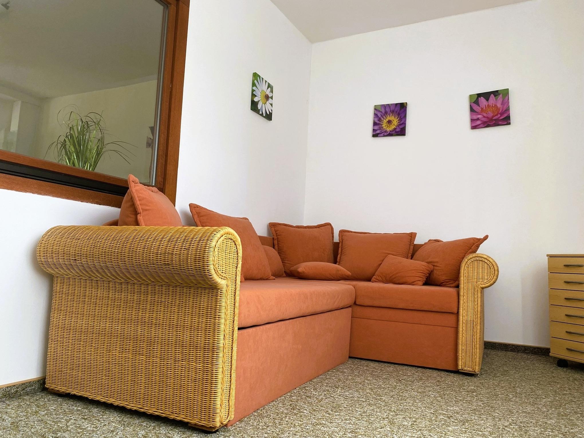 - Wohnzimmer mit großem Ledersofa und Kuscheldecke
