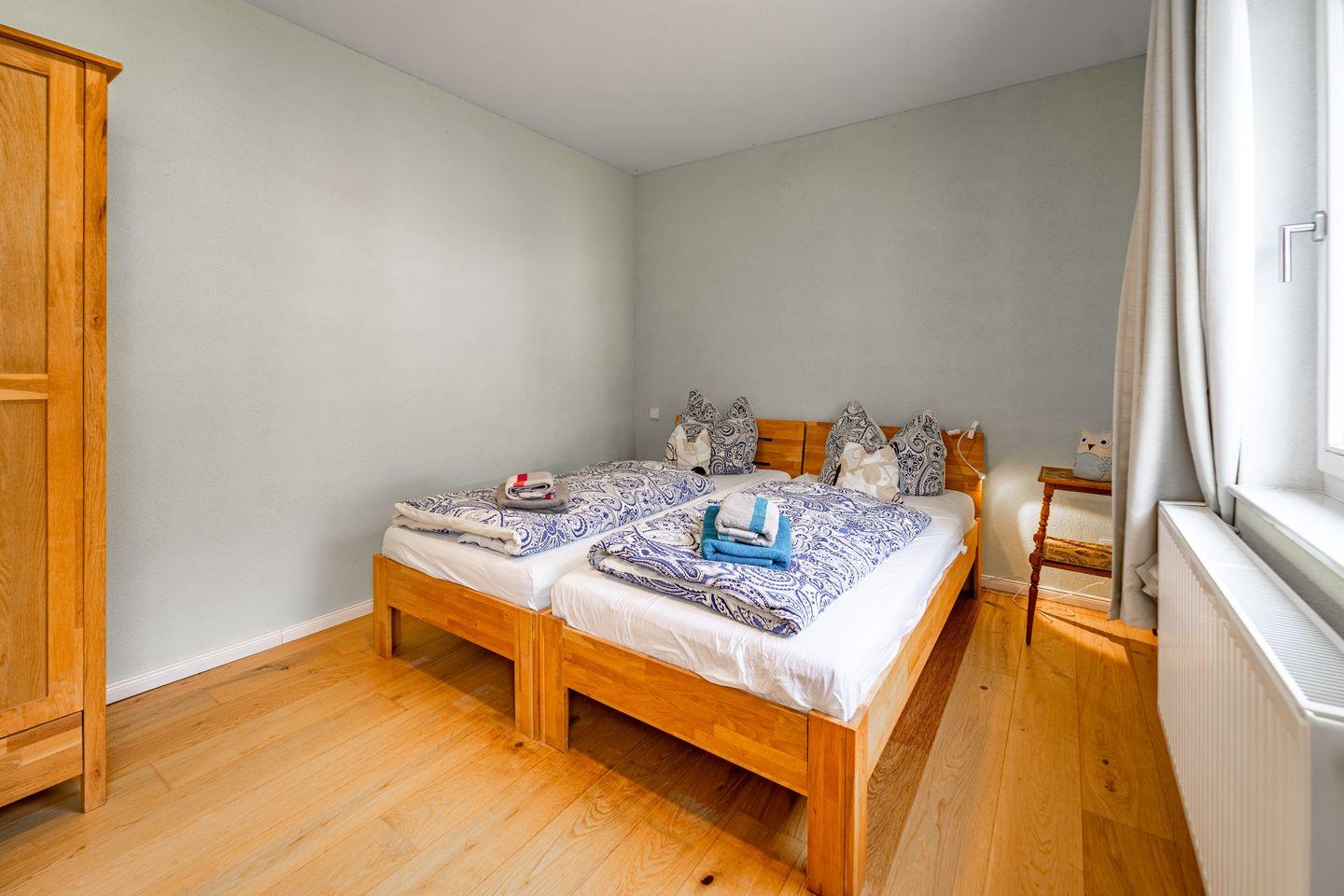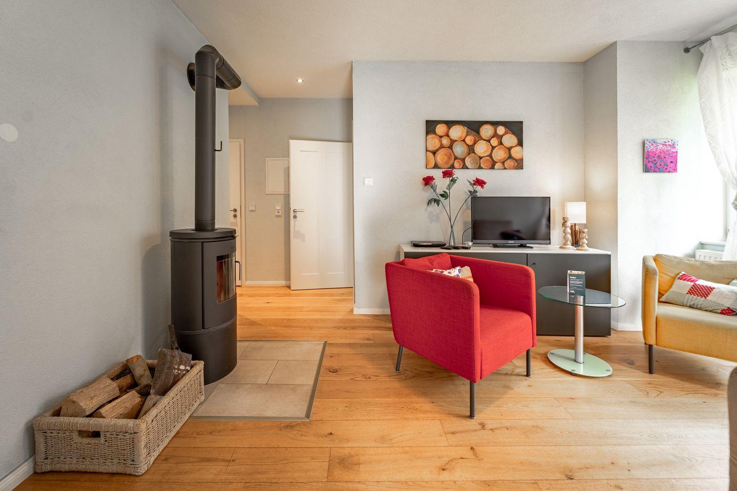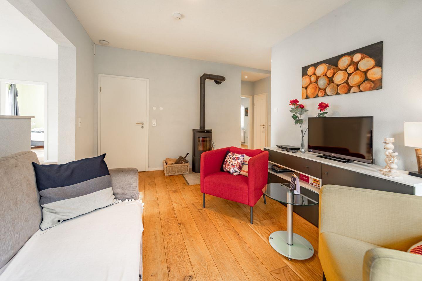 Die Wohnung verfügt über zwei Schlafzimmer – eines mit Doppelbett, eines mit zwei Einzelbetten – sowie ein ausziehbares Schlafsofa im Wohnzimmer. Das große Wohnzimmer mit Kaminofen und Flachbild-Sat-TV lädt zum Ankommen und Wohlfühlen ein, von hier aus gelangst du auch direkt auf die Terrasse mit Blick in den Garten.