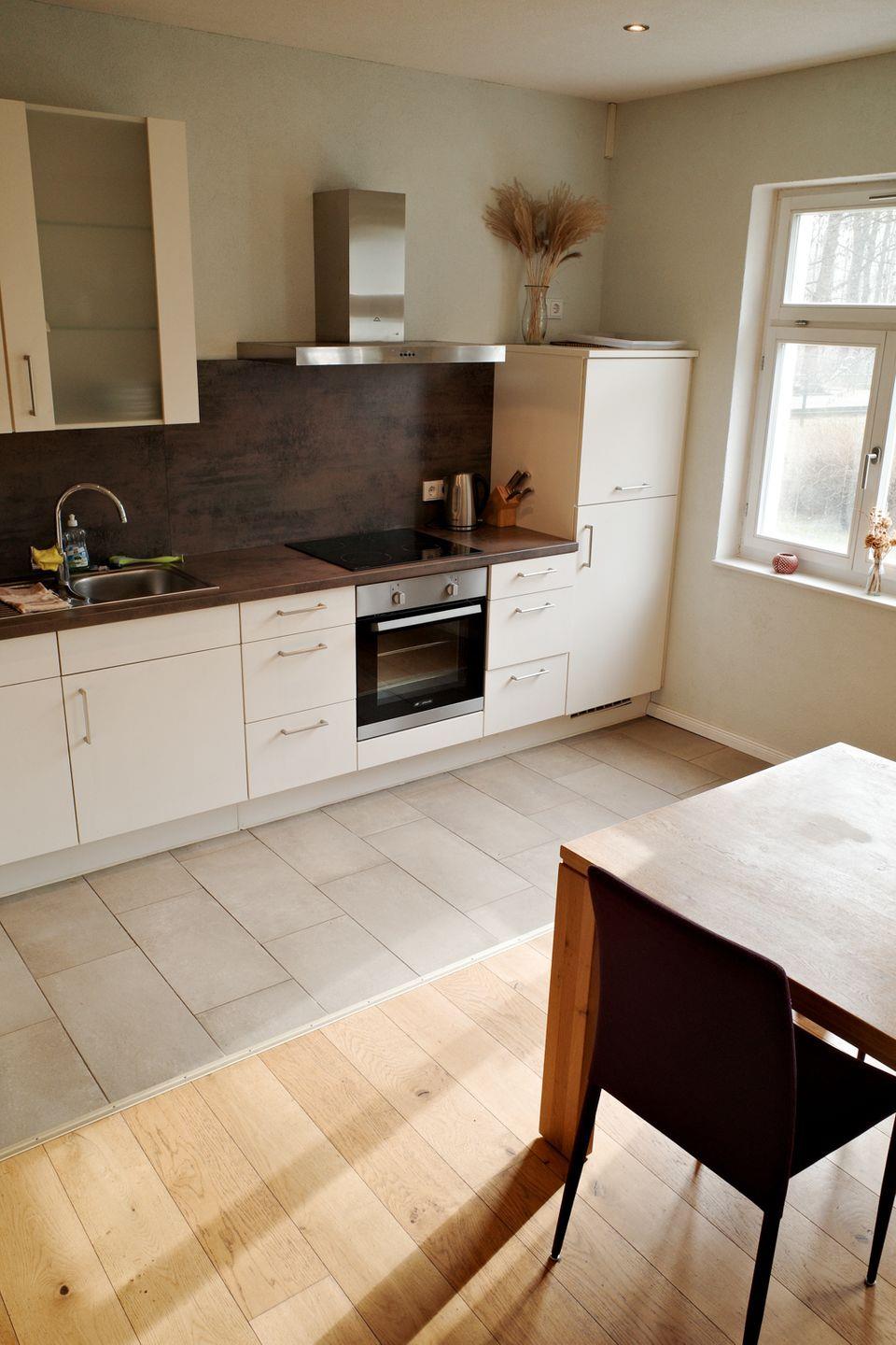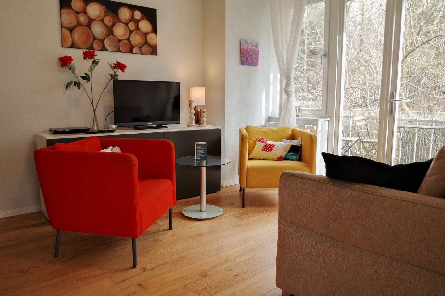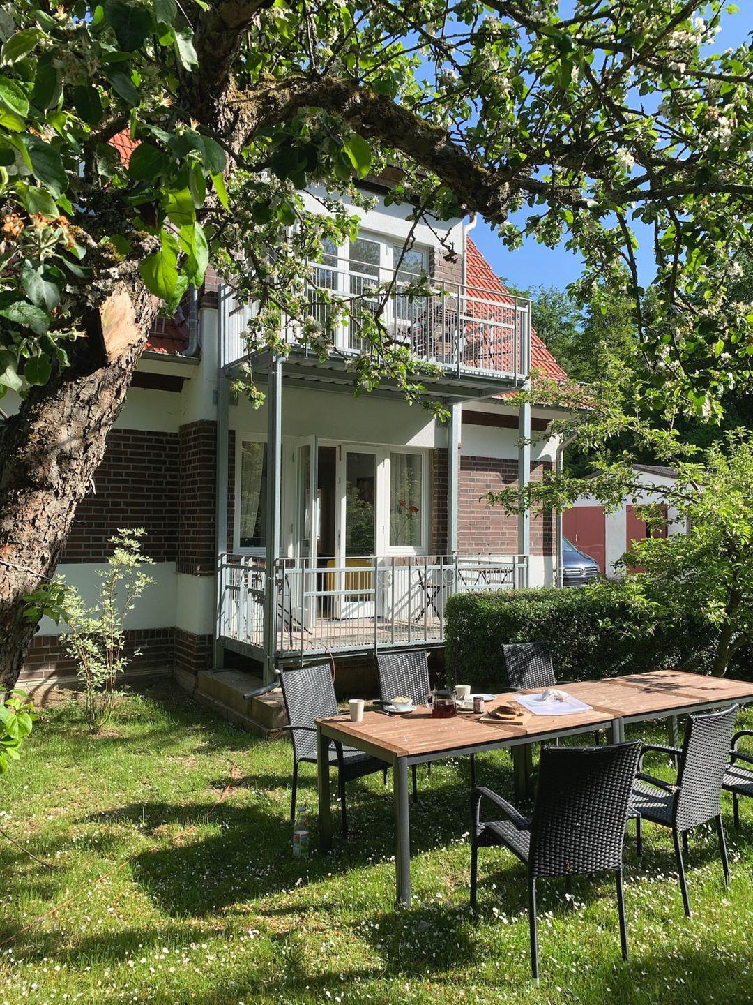 Die Wohnung verfügt über zwei Schlafzimmer – eines mit Doppelbett, eines mit zwei Einzelbetten – sowie ein ausziehbares Schlafsofa im Wohnzimmer. Das große Wohnzimmer mit Kaminofen und Flachbild-Sat-TV lädt zum Ankommen und Wohlfühlen ein, von hier aus gelangst du auch direkt auf die Terrasse mit Blick in den Garten.