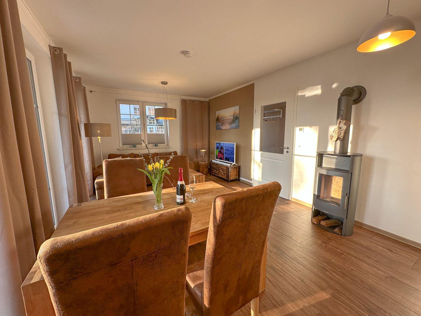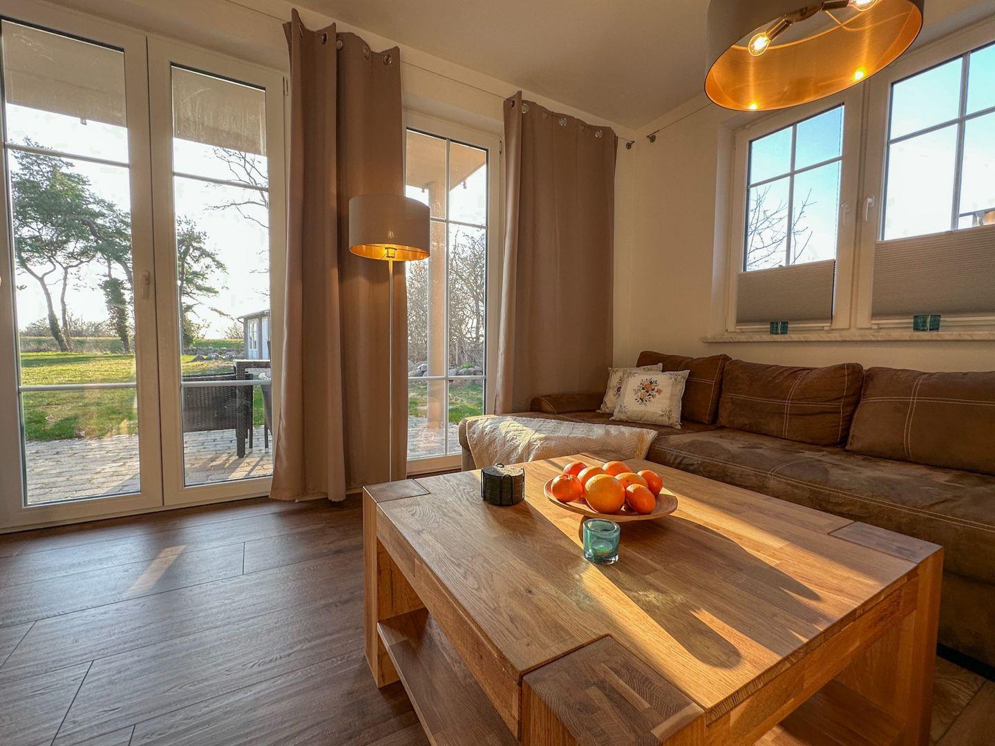 Der großzügige Wohn-/Essbereich verfügt über eine moderne und komplett ausgestattete Küchenzeile mit 4 Zonen-Ceranfeld und Backofen , Geschirrspüler, Kühlschrank mit Gefrierfach, Mikrowelle, Wasserkocher, Toaster, Kaffeemaschine sowie diversen Küchenutensilien. Angrenzend befindet sich ein Esstisch mit vier Stühlen. Der gemütliche Wohnbereich mit Gartenblick bietet Platz für die gesamte Familie. Angrenzend erreichen Sie die großzügige Terrasse. Ein Tisch mit vier Stühlen und ein Sonnenschirm laden zum Verweilen ein.