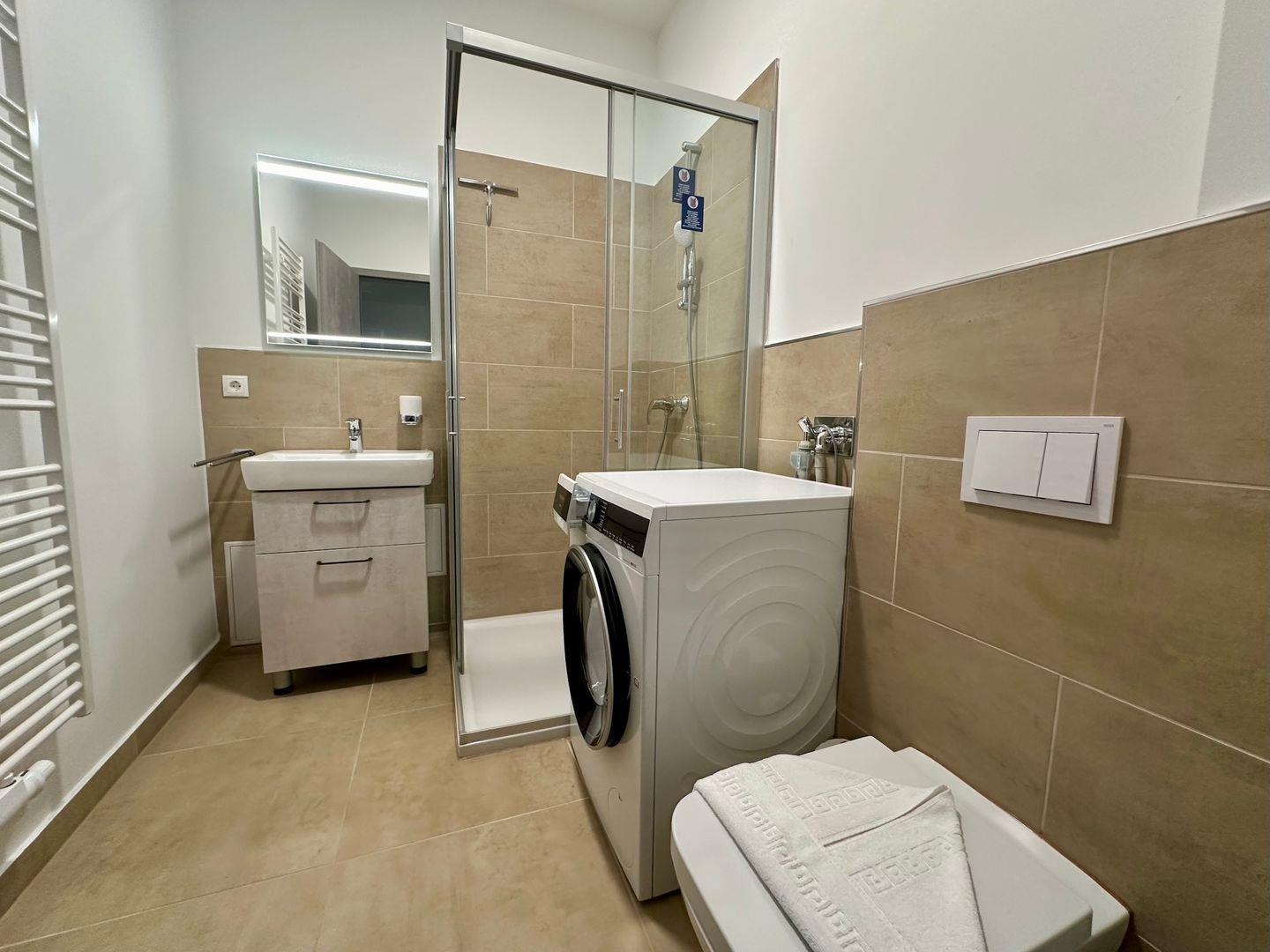 Das Bad mit der Dusche, WC und einer Waschmaschine steht Ihnen auch zur Verfügung.