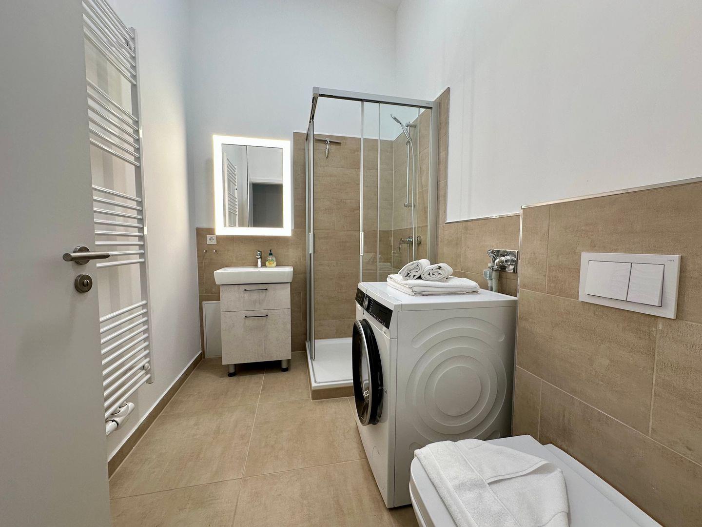 Das Bad mit der Dusche, WC und einer Waschmaschine steht Ihnen auch zur Verfügung.