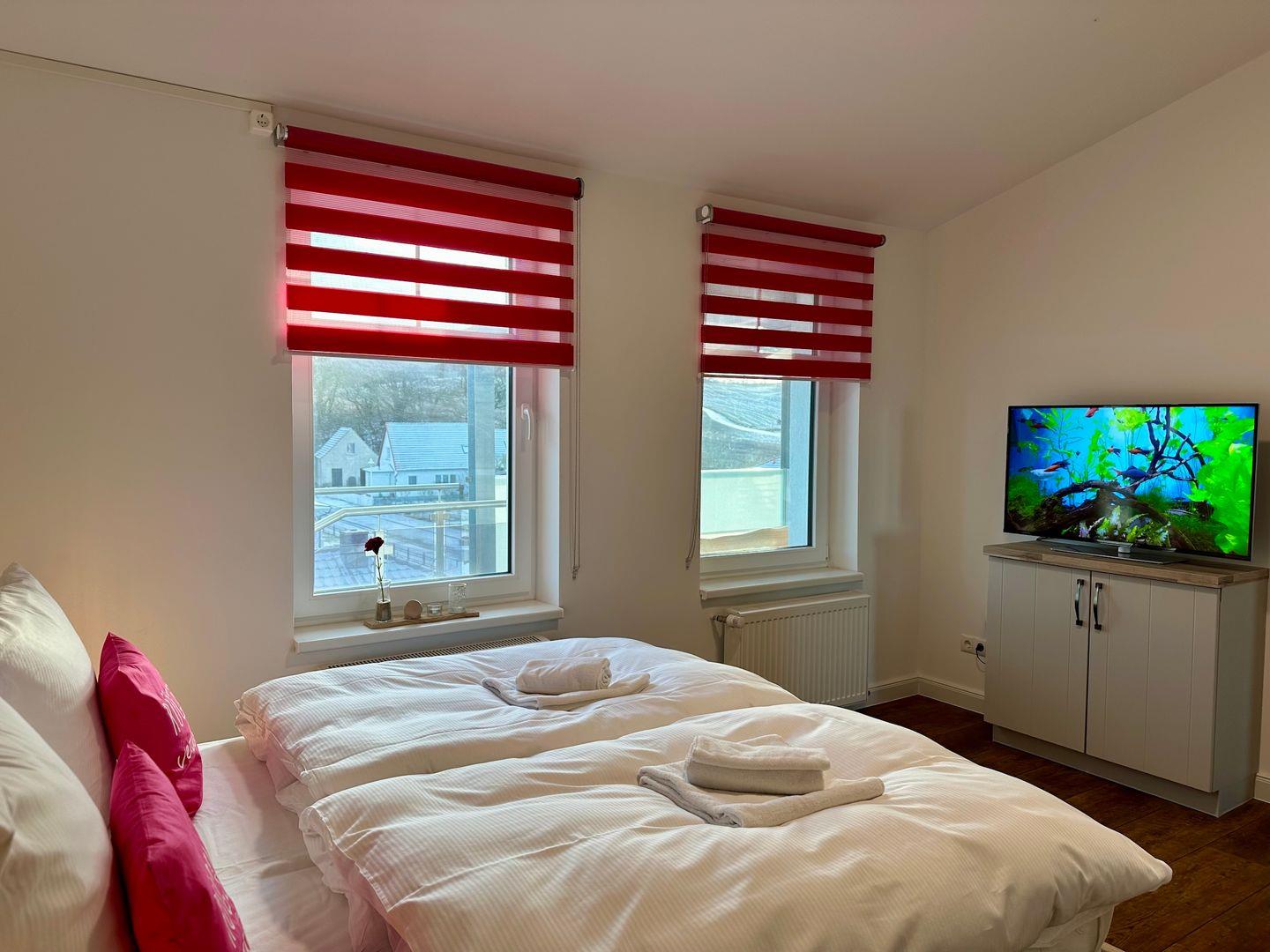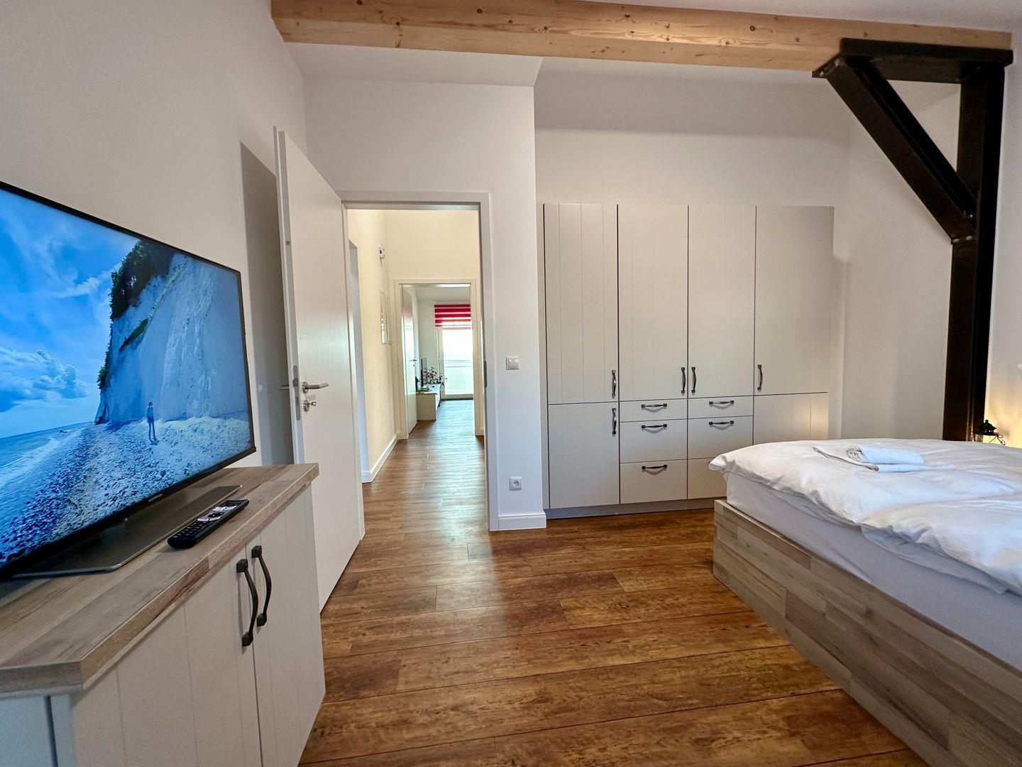 Das Schlafzimmer mit einem Doppelbett (180cmx200cm) bietet Ihnen erholsame Nächte. Beim Aufwachen genießen Sie einen wunderschönen Blick auf Lotsenberg.