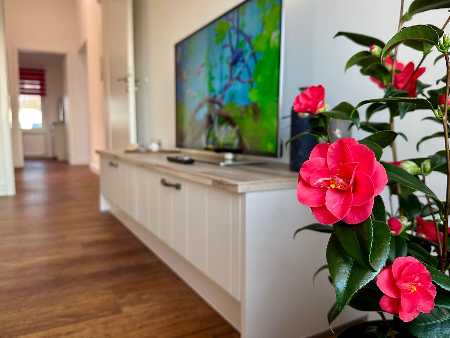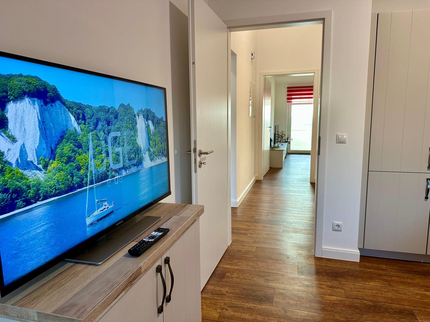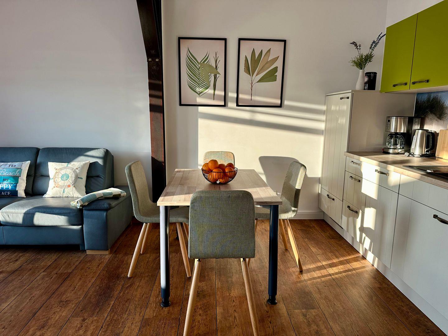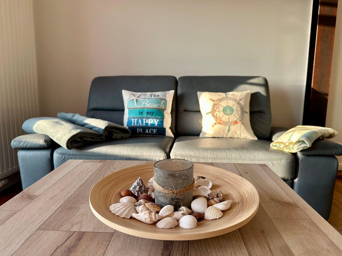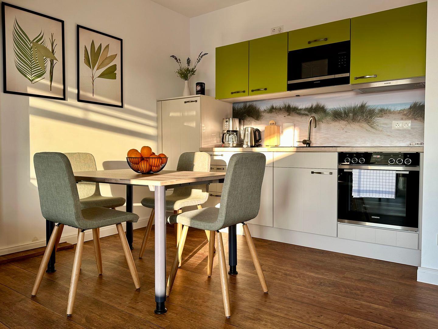 Das Wohnzimmer mit einer gemütlichen Couch bietet Ruhe und Entspannung und ist mit einer Essecke für gemütliche Abende mit der Familie abgerundet. Eine anliegende Küche mit gute Ausstattung, ergänzt den Wohnbereich. Die Spülmaschine erledigt für Sie den Abwasch, während Sie am Strand den Sonnenuntergang genießen können.