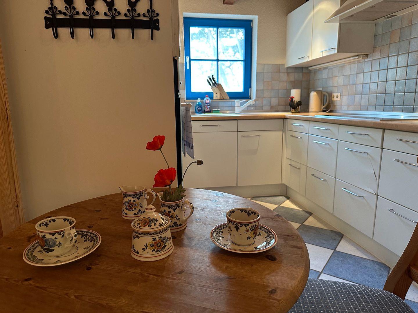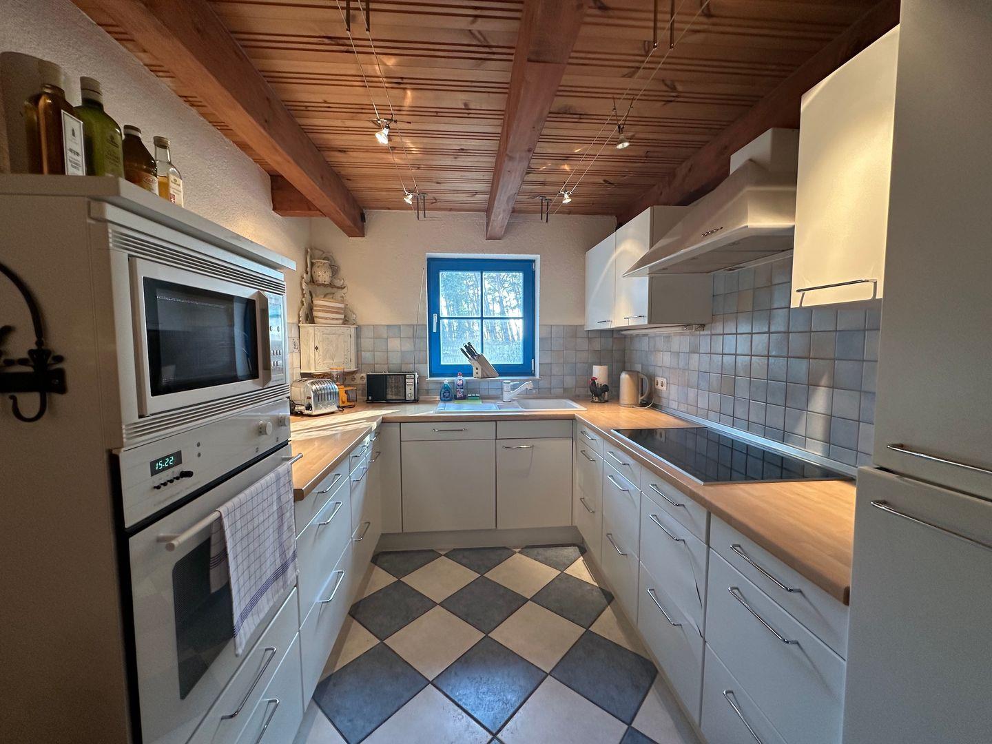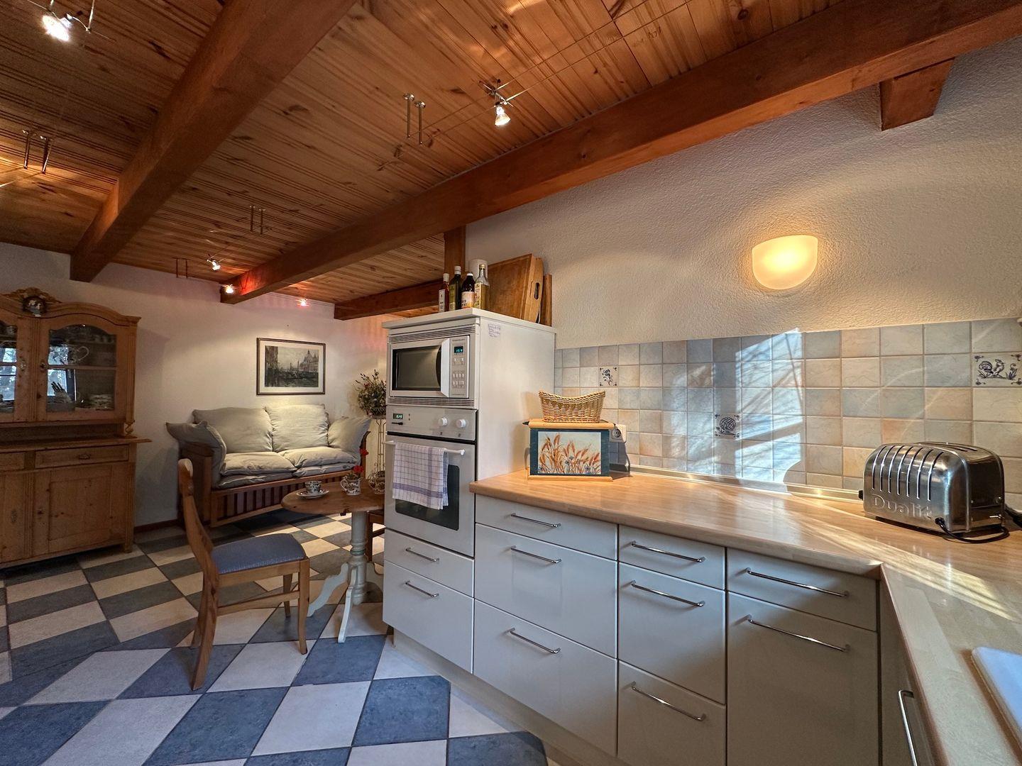 Im Erdgeschoss befindet sich eine große, vollständig ausgestattete Küche, in der man mit Garten- und Waldblick für die ganze Familie kochen kann. Angrenzend liegt ein helles offenes Wohnzimmer mit großer Fensterfront und eigenem Zugang zur Terrasse. Ein ausziehbarer Esstisch bietet Platz für bis zu 10 Personen. Die bequeme Couch kann man auch zum Schlafen nutzen. Gegenüber befindet sich eine Kommode mit Fernseher. Die Terrasse ist mit Gartenmöbeln und einem Grill ausgestattet. Das große Bad mit Fenster zum Garten hat zwei Waschbecken, ein Bidet und eine ebenerdige Dusche. Angrenzend befindet sich ein Hauswirtschaftsraum mit Waschmaschine, Trockner und weiteren Schränken, die als Stauraum genutzt werden können. Über eine antike Holztreppe gelangen Sie in das Obergeschoß wo sich zwei romantische Schlafzimmer befinden.