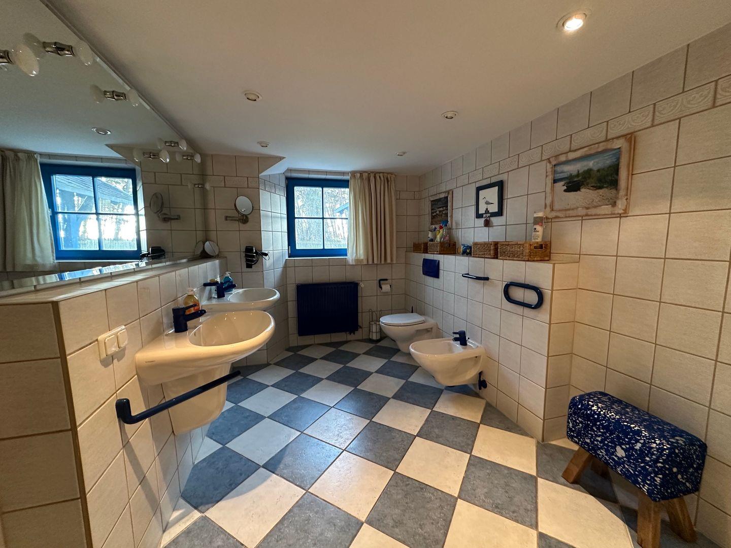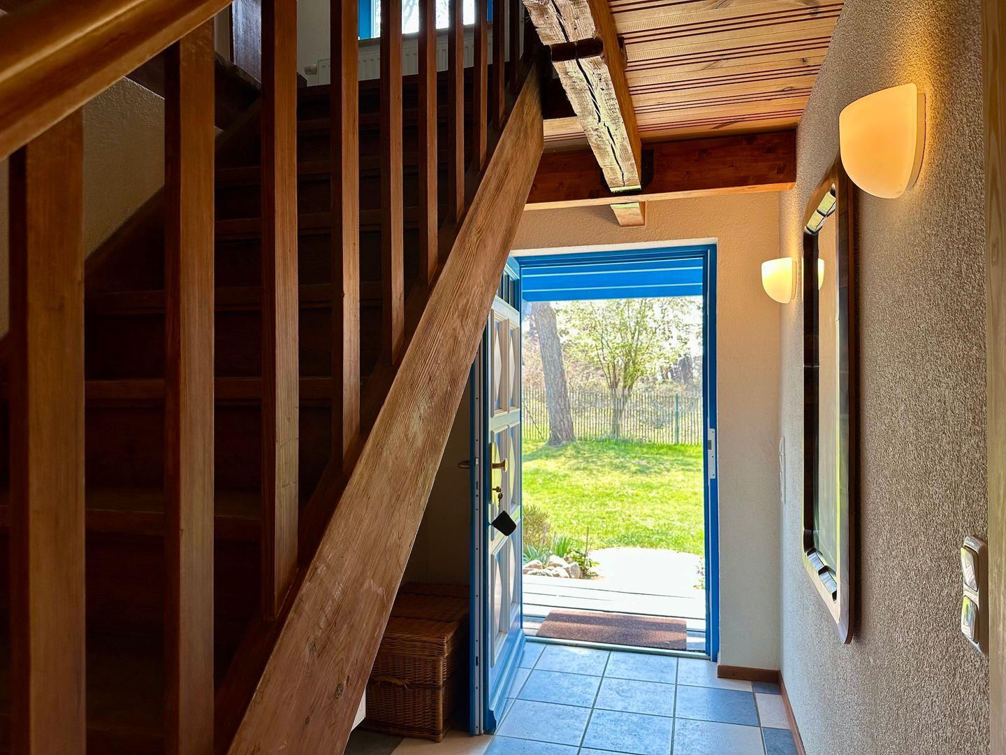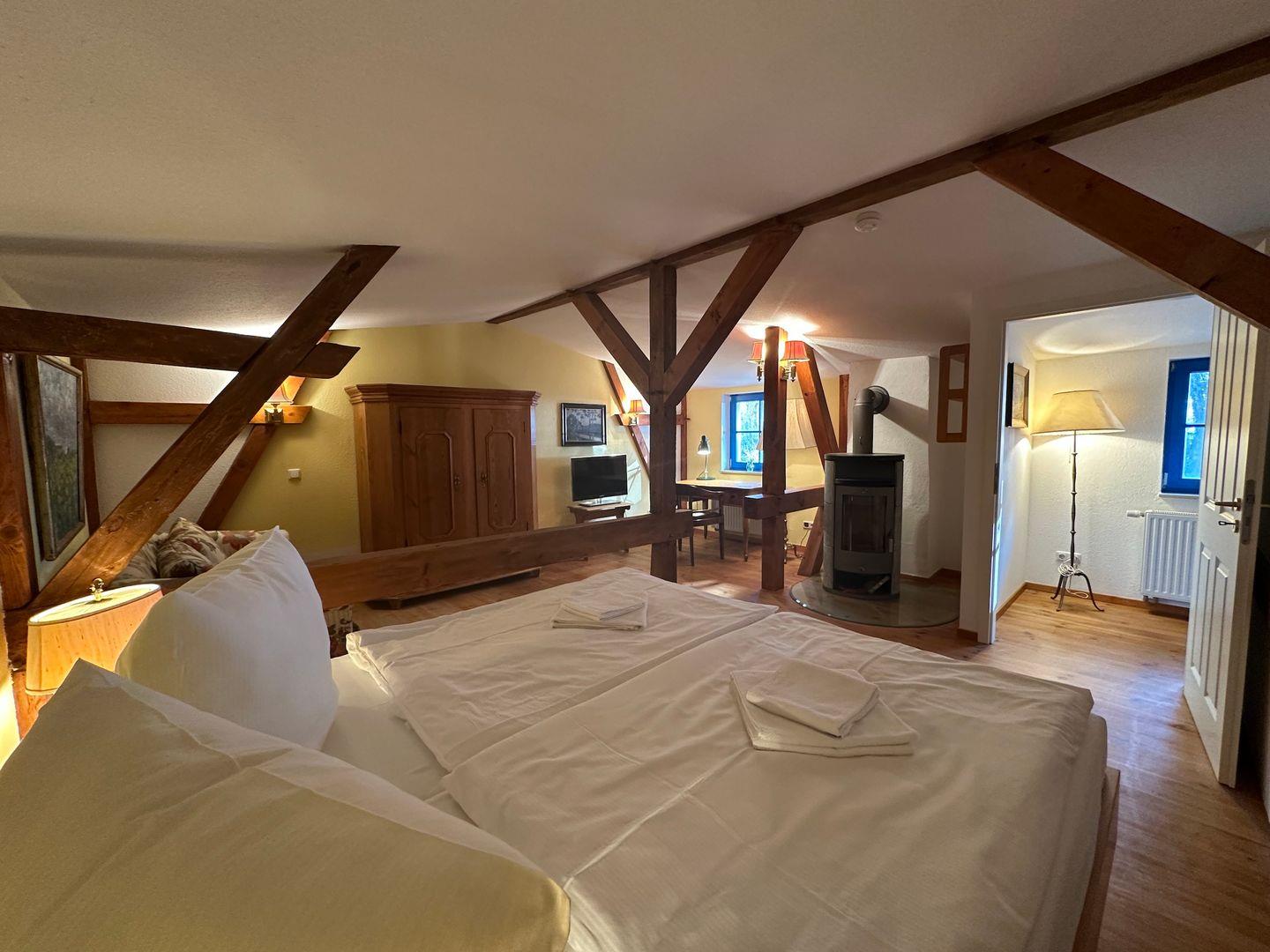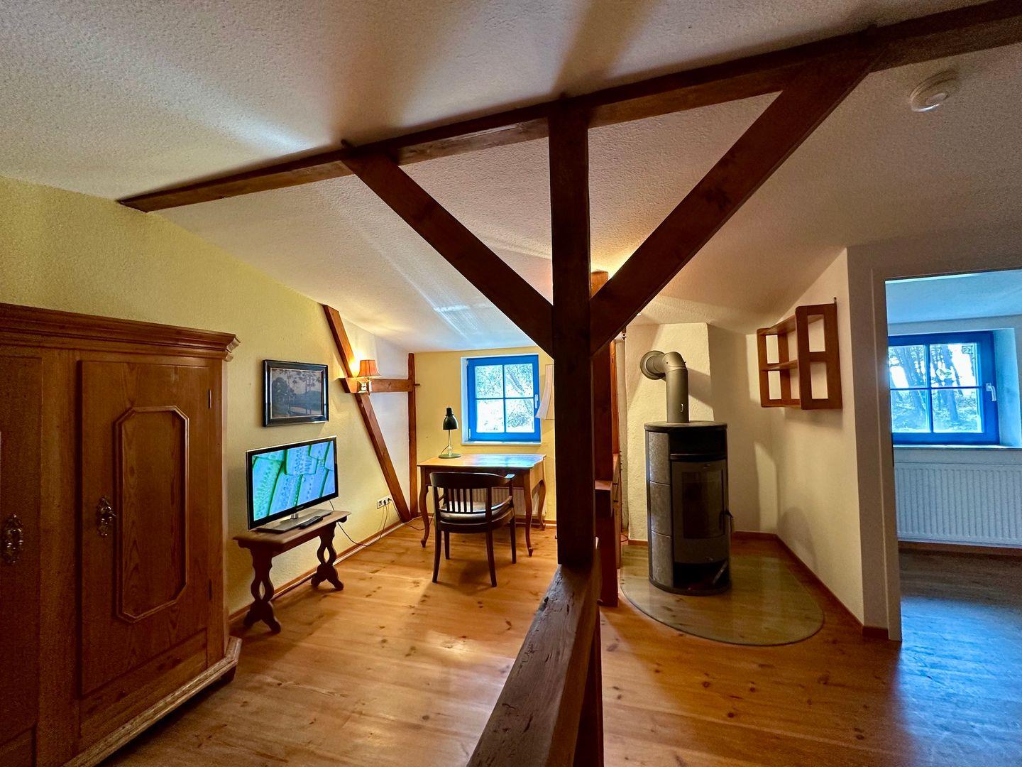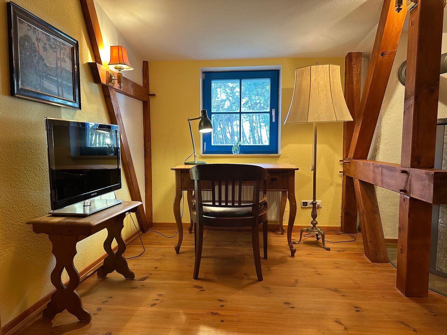 Das Schlafzimmer links von der Treppe verfügt über ein Doppelbett, eine Couch, einen Kleiderschrank, einen Fernseher und einen kleinen Schreibtisch am Fenster, von welchem aus man die Ostsee durch die Kiefernstämme des nahen Wäldchens sieht. Für gemütliche Abende am Holzfeuer, gibt es zusätzlich einen Kamin- genügend Kaminholz finden Sie im Garten.