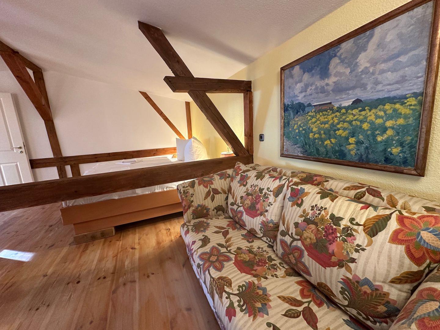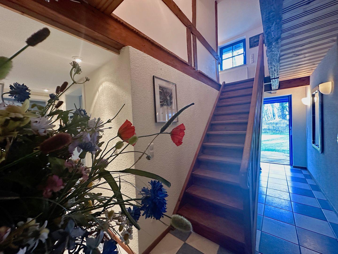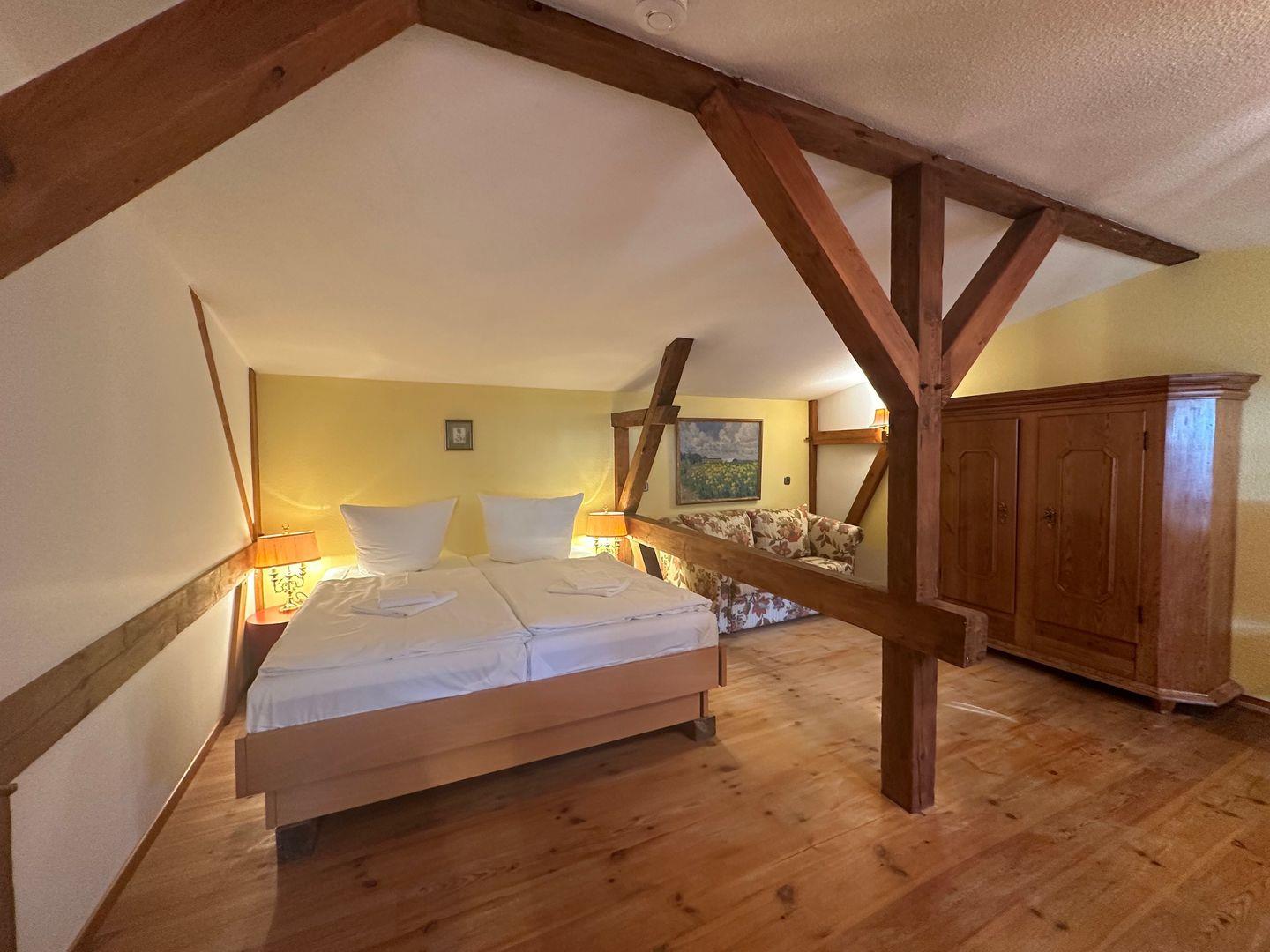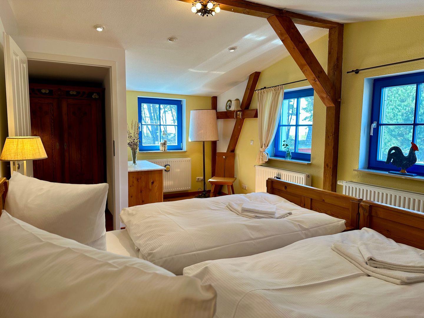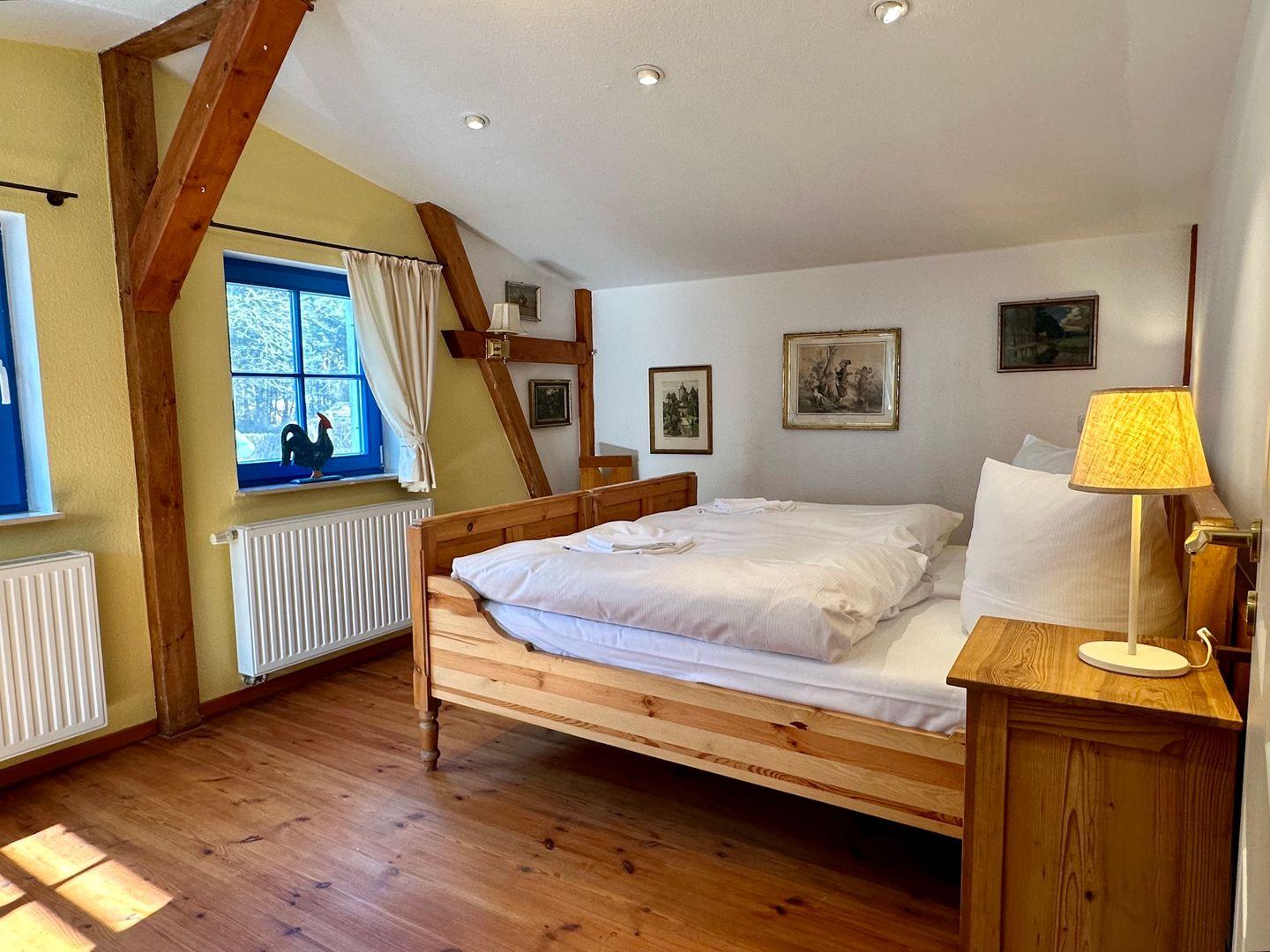 Das Schlafzimmer rechts von der Treppe ist ausgestattet mit einem Doppelbett, zwei Nachttischchen, einer Kommode und einem geräumigen Schrank auf dem Flur. Genießen Sie die gemütliche Atmosphäre zwischen sichtbaren Dachbalken des über 100 Jahre alten Thiessower Hauses.