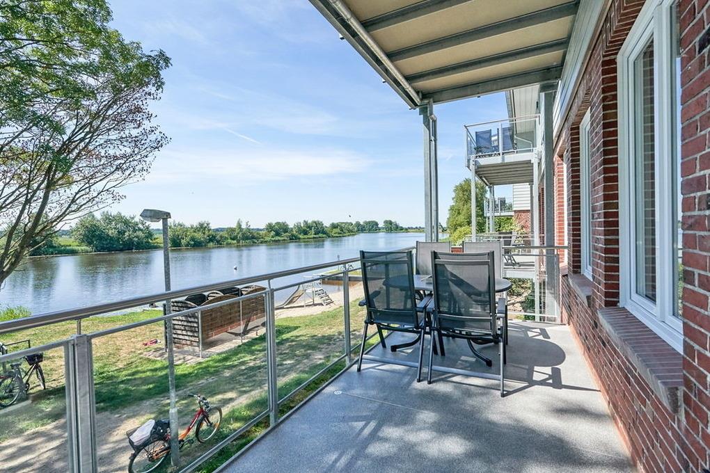 Der könnte sich auch auf dem geräumigen Südbalkon mit leichter Hanglage befinden. Dieser ist ausgestattet mit Tisch und bequemen Gartenstühlen. Eine Glasfront rund um den Balkon schützt vor kühlen Winden und bietet zugleich freien Blick auf die Eider.