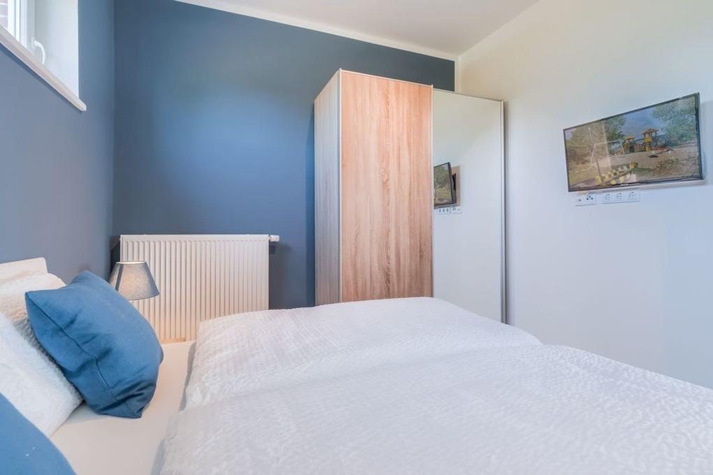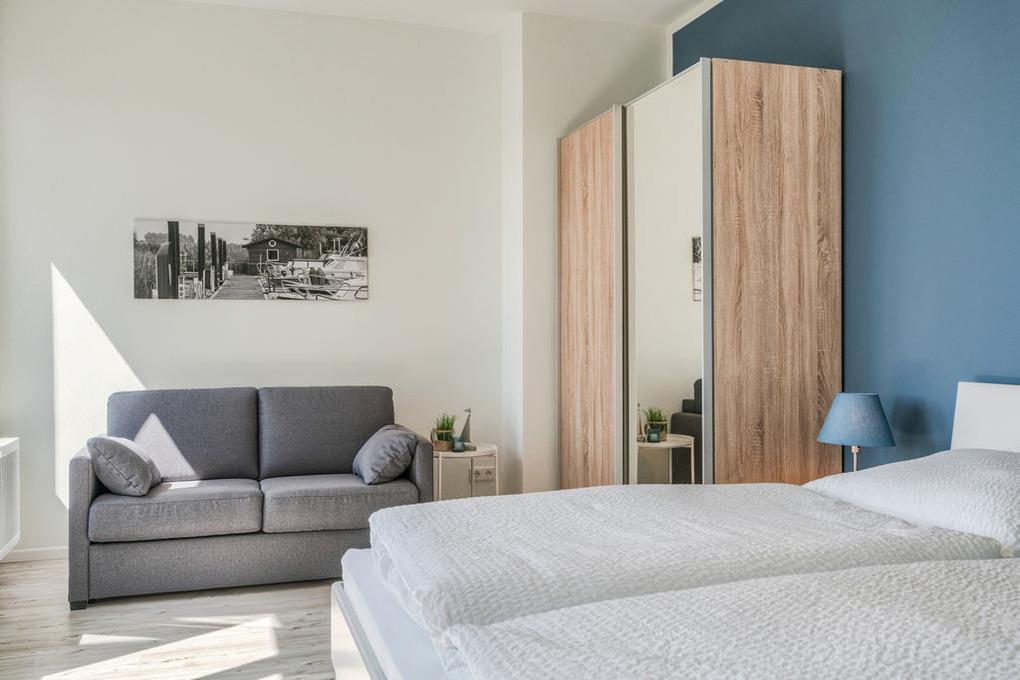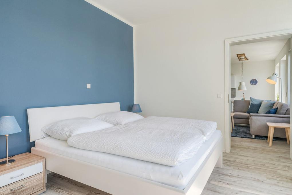 In den Schlafräumen bietet sich Ihnen ein ganz besonderes Raumerlebnis. Das tiefblaue Niagarablau an den rückwärtigen Wänden strahlt in beiden Zimmern angenehme Ruhe und zugleich Kraft aus. So können Sie in den frisch bezogenen Komfortbetten einen tiefen Schlaf finden und gestärkt in den neuen Tag gehen. Der[nbsp] Schlafraum mit Südlage kann aufgrund seiner Größe auch als zweiter Tages- und Spielraum dienen und Ihren Aufenthalt mit Kindern oder innerhalb einer Gruppe zusätzlich entspannen. In diesem Zimmer finden Sie außerdem ein breites Faltbett mit integriertem Lattenrost und Schlafmatratze für eine 5. Person, das Ihnen ebenso als Sofa dienen kann.