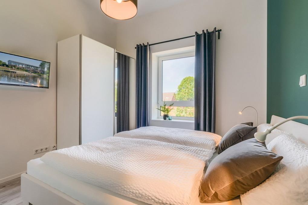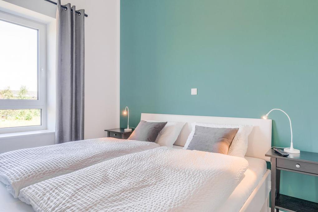Ein besonderer Hingucker ist der zweite Schlafraum. Hier gibt das tiefe Odenwaldgrün der Wand den Ton an, das durch die hellen, freundlichen Möbel aufgelockert wird. In diesem Zimmer wird der Schlaf zum Traum.