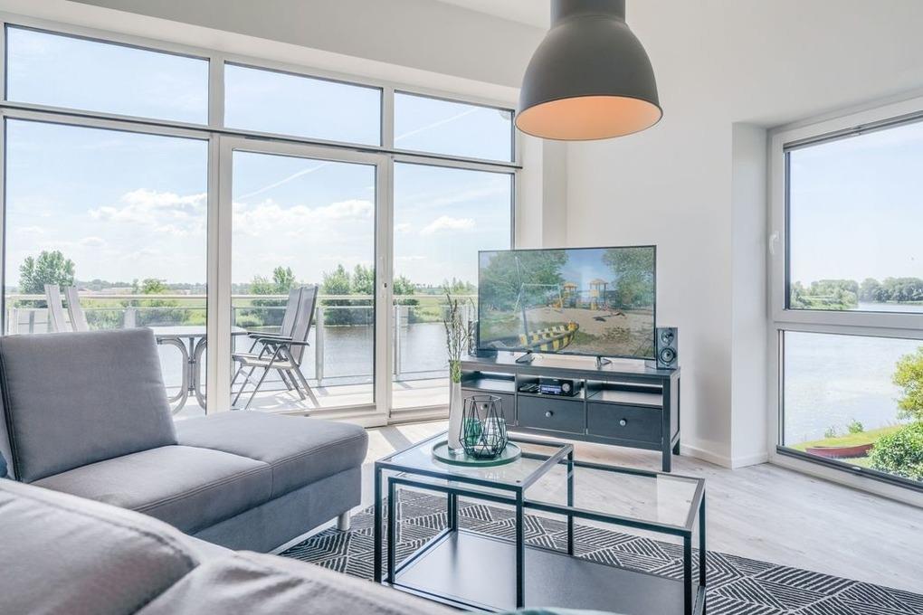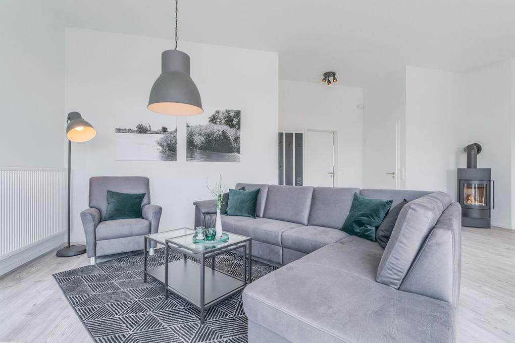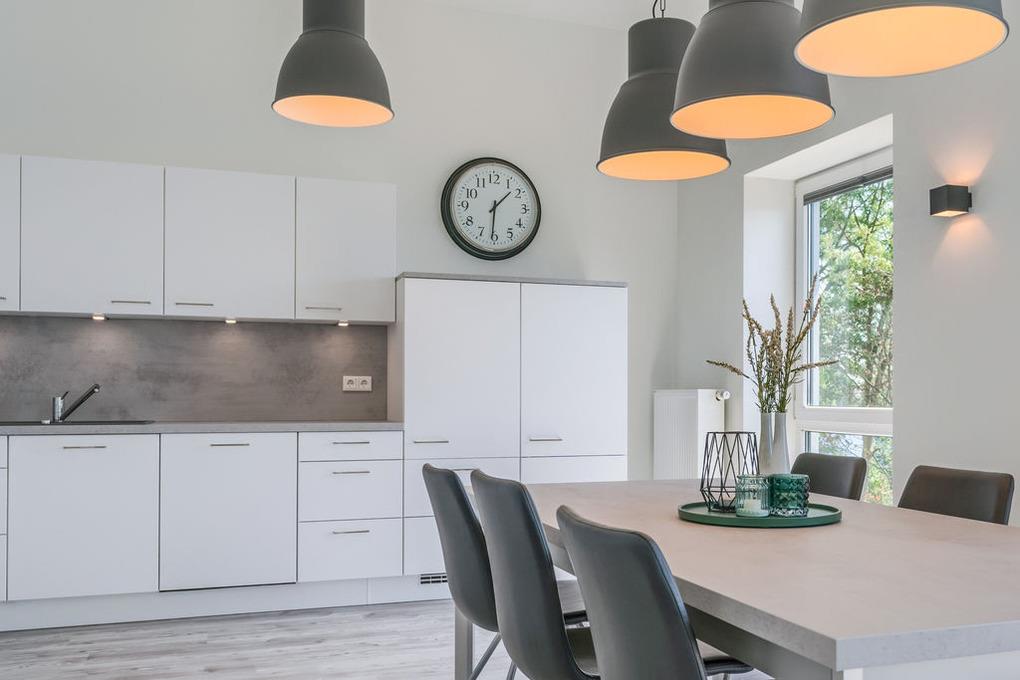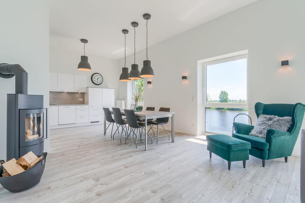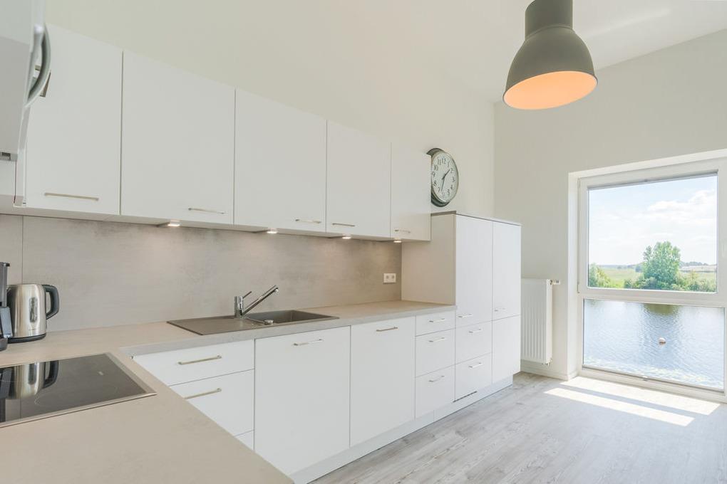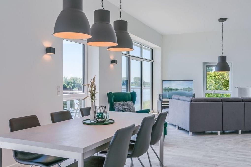 Der gemeinsame Wohn- und Essraum verfügt über eine komfortable Einbauküche mit Geschirrspüler, die alle Wünsche erfüllt. Am großen Esstisch finden Sie für 6 Personen ausreichend Platz. Hier können Sie gemeinsame Spieleabende und ausgedehnte Mahlzeiten verbringen, während Sie draußen auf der Eider die Boote entlang ziehen sehen.