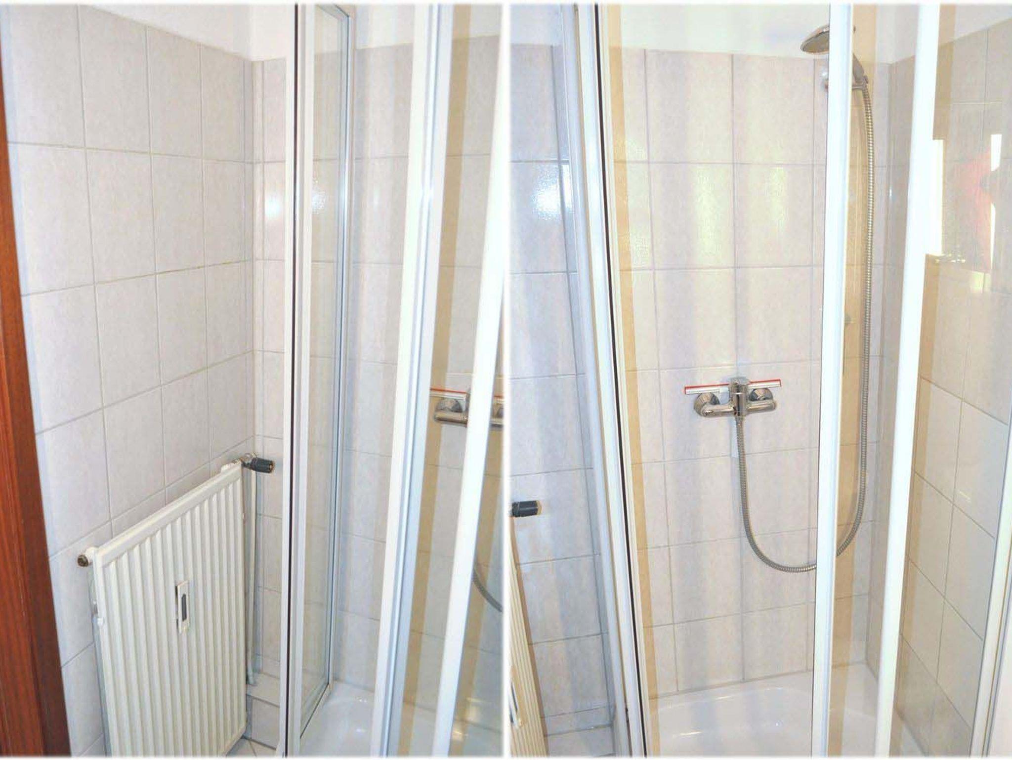 Bad 1: Dusche, Duschkabine, Hängeschrank, Spiegel, Waschbecken, WC