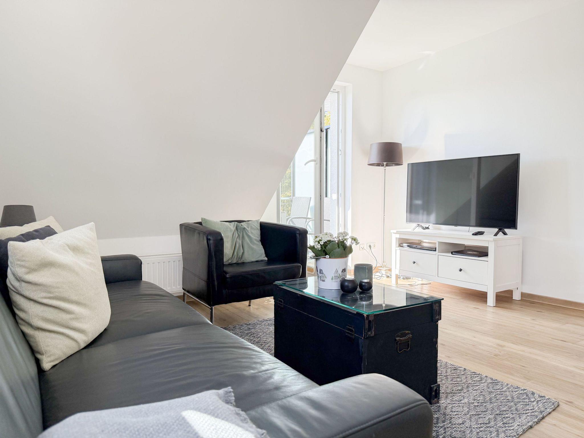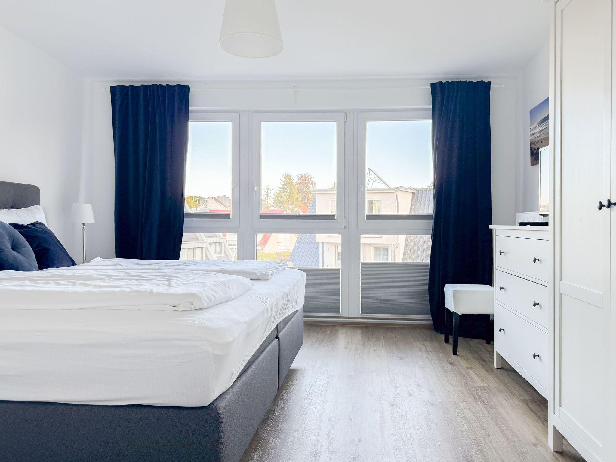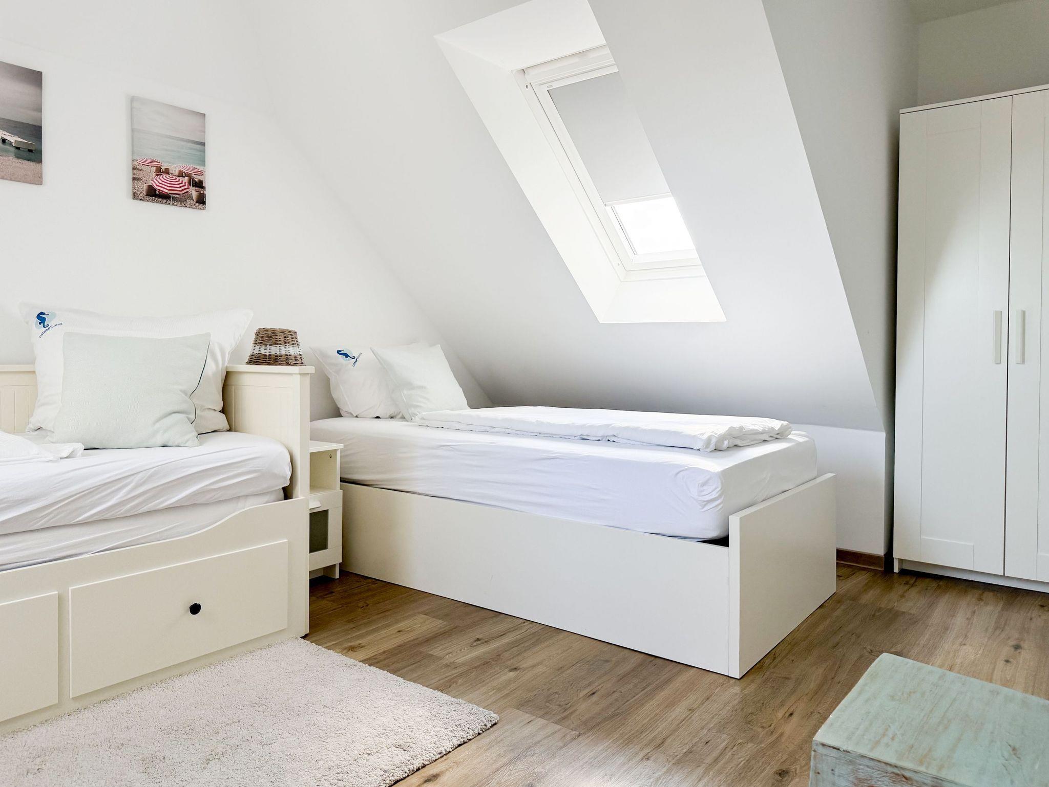 Die Ferienwohnung Magic Eight liegt im ersten Obergeschoss des Hauses 2Seasons und bietet dank toller Lage einen idealen Rückzugsort, ohne auf den besonderen Timmendorfer Lifestyle zu verzichten und abwechslungsreiche Urlaubstage in Strandnähe zu verleben. Die hochwertig ausgestattete Wohnung erstreckt sich über zwei Ebenen und verfügt über einen herrlichen Südwestbalkon mit Blick ins Grüne. Auf der unteren Wohnebene befinden sich ein gemütlicher Wohnbereich mit TV und Balkonzugang, der anschließende Essbereich für vier Personen sowie eine offene, moderne Einbauküche, bestens ausgestattet für gemeinsames Kochen. Das großzügig angelegte und modern gestaltete Bad, ebenfalls auf der unteren Ebene, verfügt über eine XXL Walk-In-Dusche und viel Tageslicht. Die beiden separaten Schlafzimmer der Ferienwohnung sind über eine Treppe aus dem Wohnbereich zu erreichen. Schlafzimmer 1 verfügt über ein Boxspringbett (180x200) TV und Verdunkelungsplissees, Schlafzimmer 2 über 2 Einzelbetten und Verdunkelungsrollos.