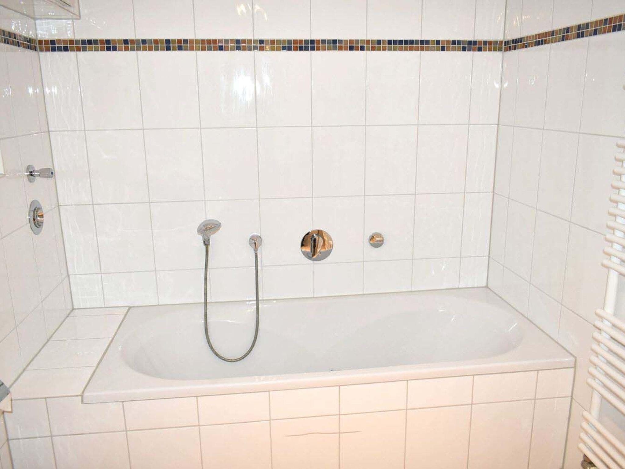 Bad 1: Badewanne, Dusche, Duschkabine, Fön, Hocker, Regal, Spiegelschrank, Waschtisch, WC