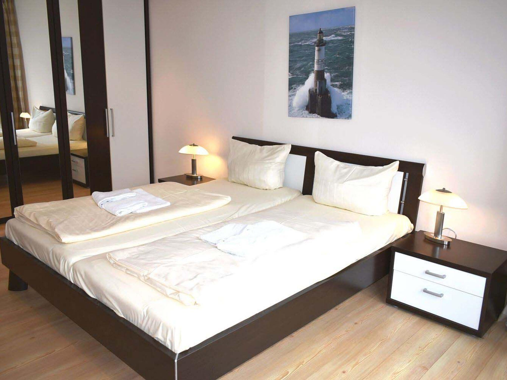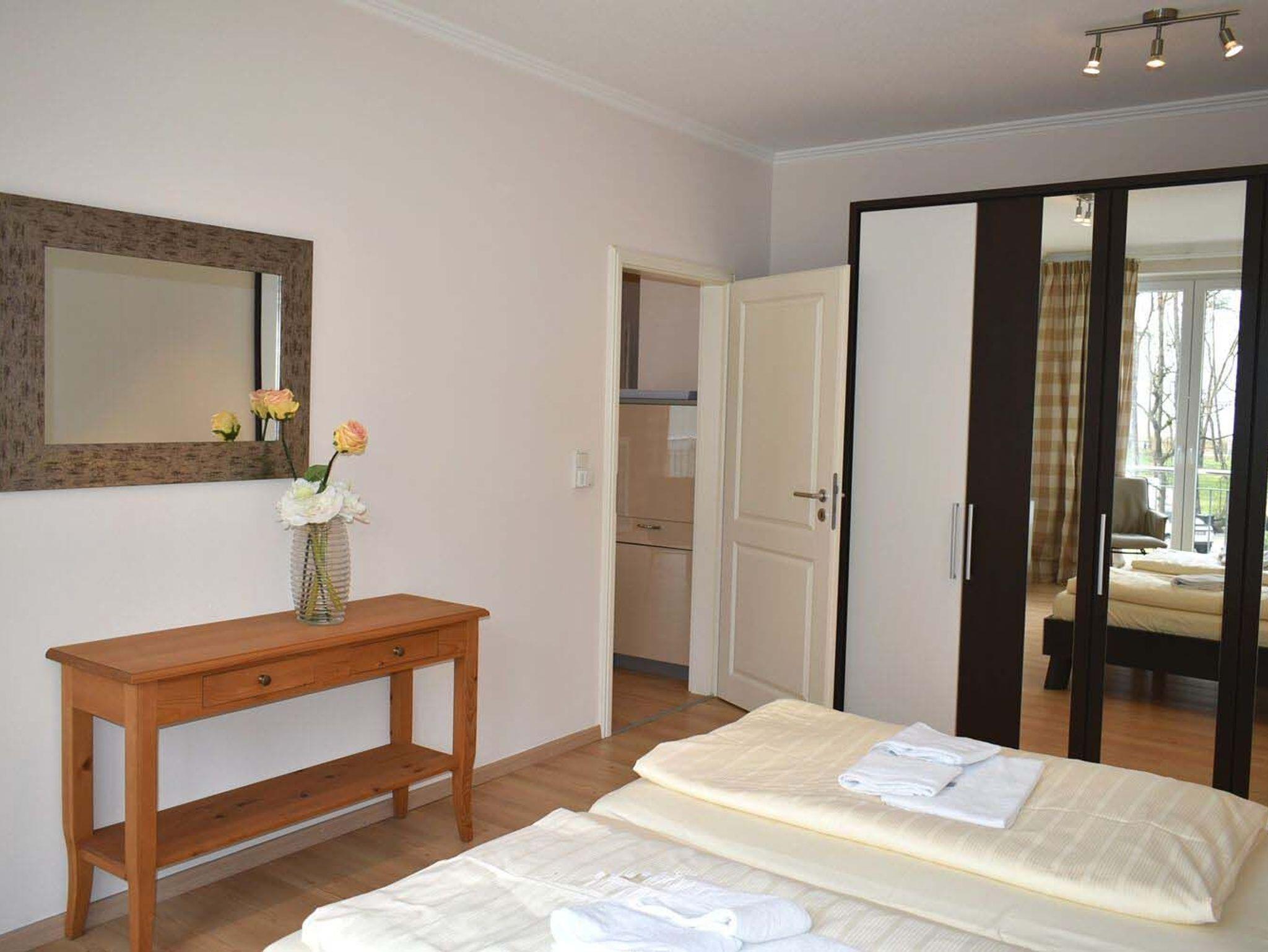 Schlafzimmer 1: 2 Matratzen, 2 Sessel, 2 Spiegel, 3 Nachttische, Anrichte, Doppelbett 2,00 x 1,80 m, Kleiderschrank, Radiowecker, Tischlampe, Verdunklungsstores