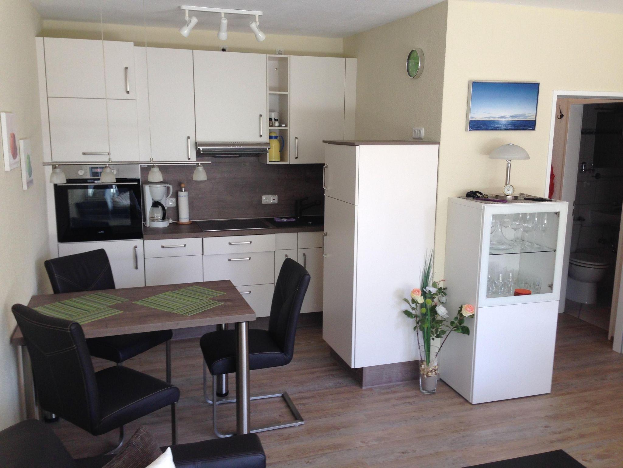 An das Wohnzimmer schließt sich sich der Essplatz sowie die voll eingerichtete Küchenzeile mit Spülmaschine, Backofen, 4-Platten-Ceranherd, Kühlschrank mit separatem Gefrierfach, Kaffeemaschine, Wasserkocher, Toaster und Mikrowelle an. Hier können Sie Ihre Mahlzeiten in aller Ruhe zubereiten und genießen.