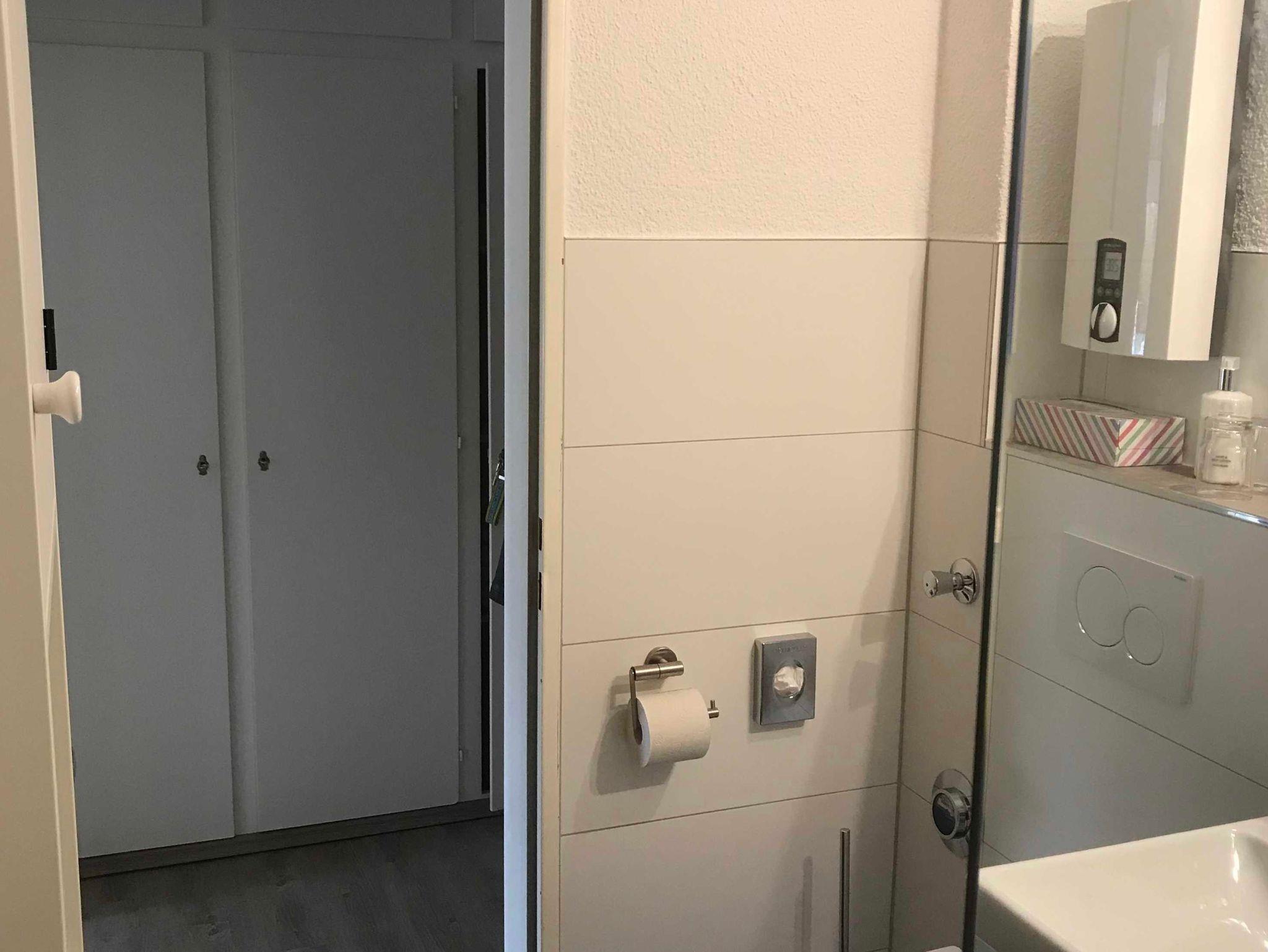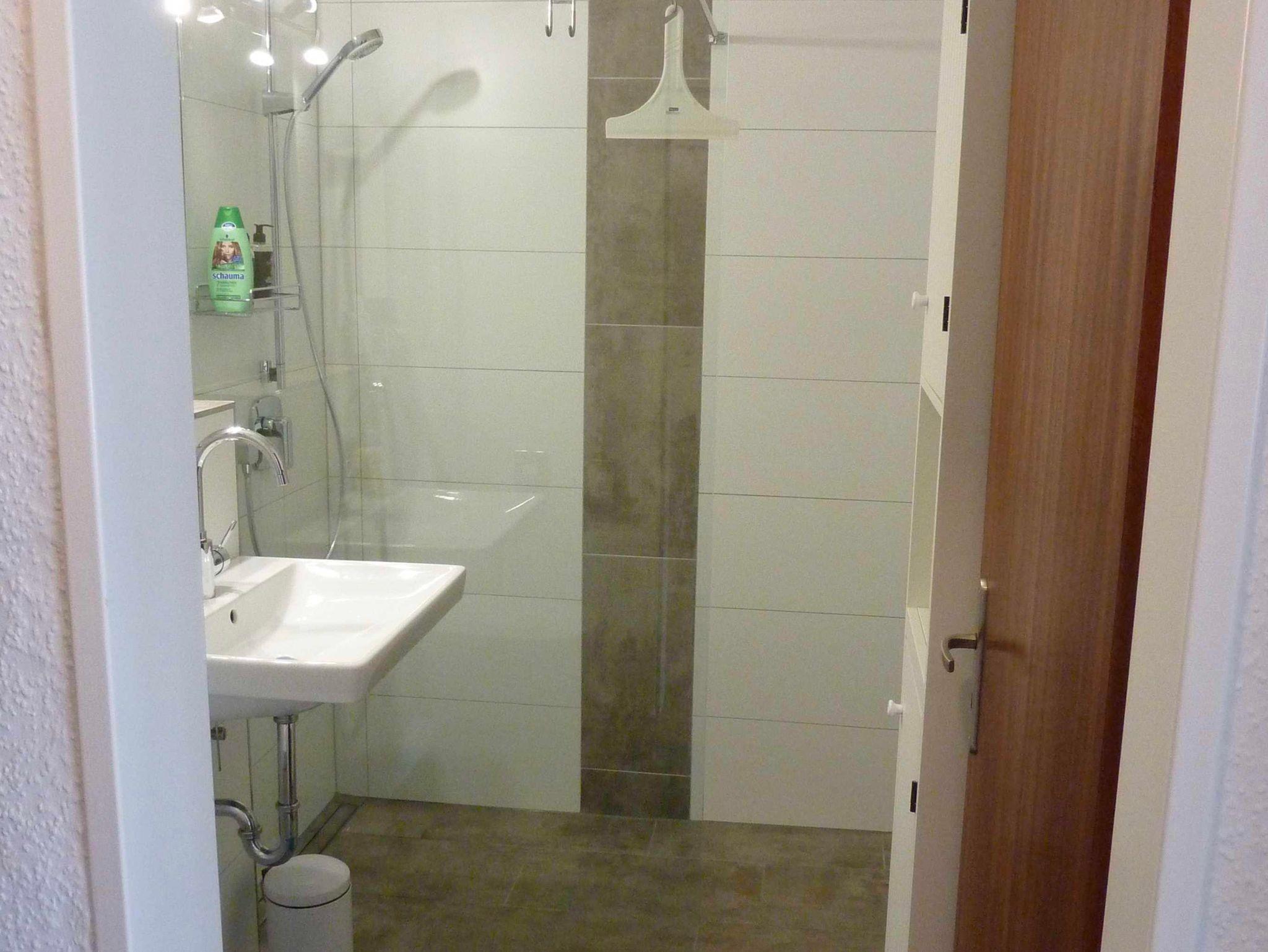 Das gut ausgestattete Badezimmer bietet Ihnen neben Hänge-WC und Waschtisch eine bodentiefe Dusche, einen Handtuchheizkörper sowie praktische Ablagemöglichkeiten.