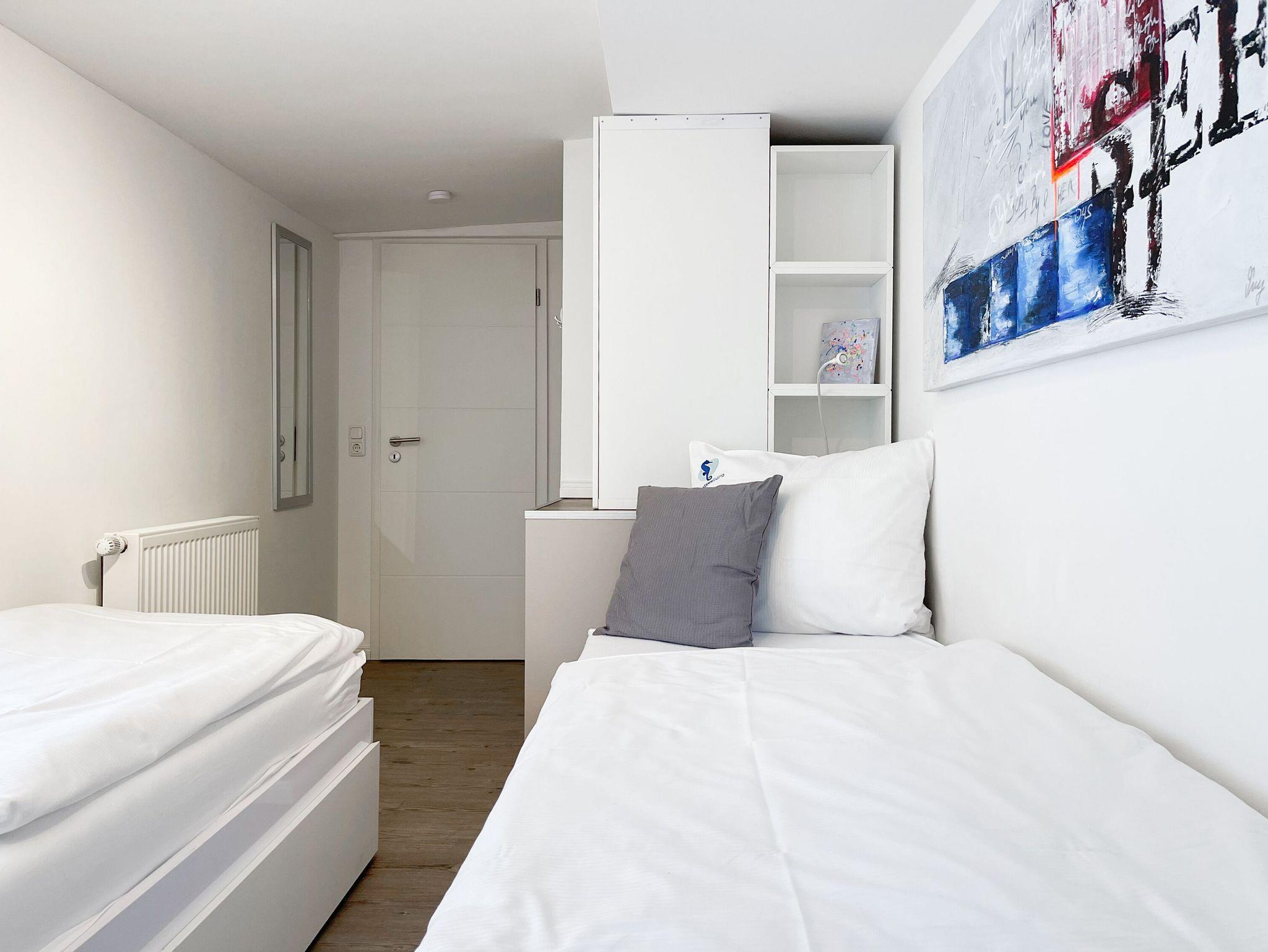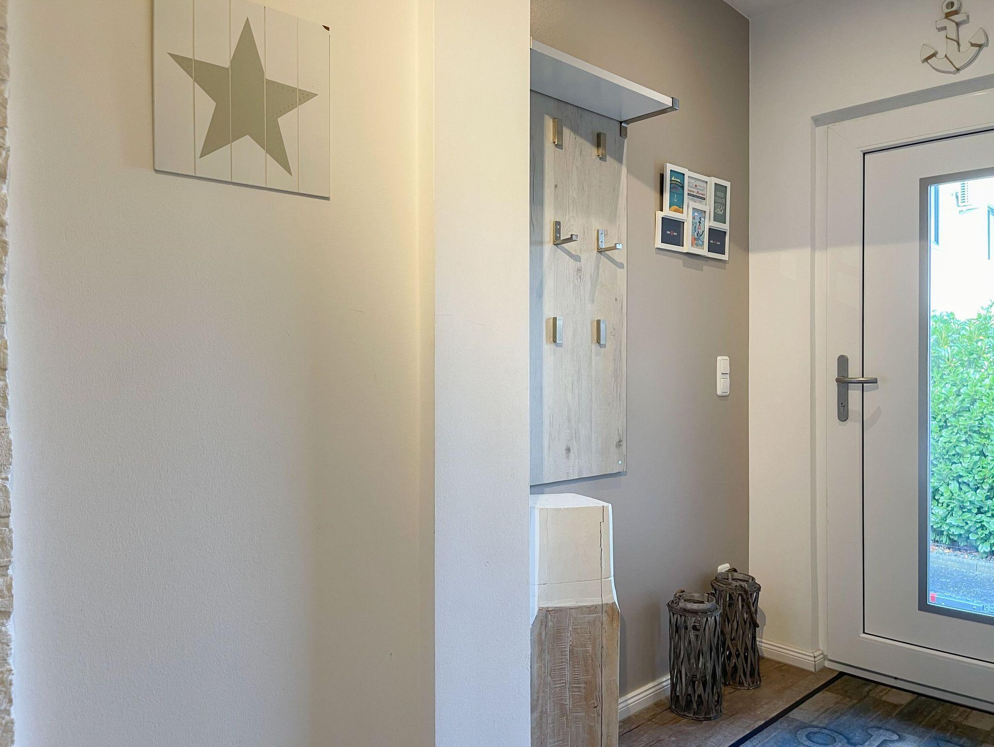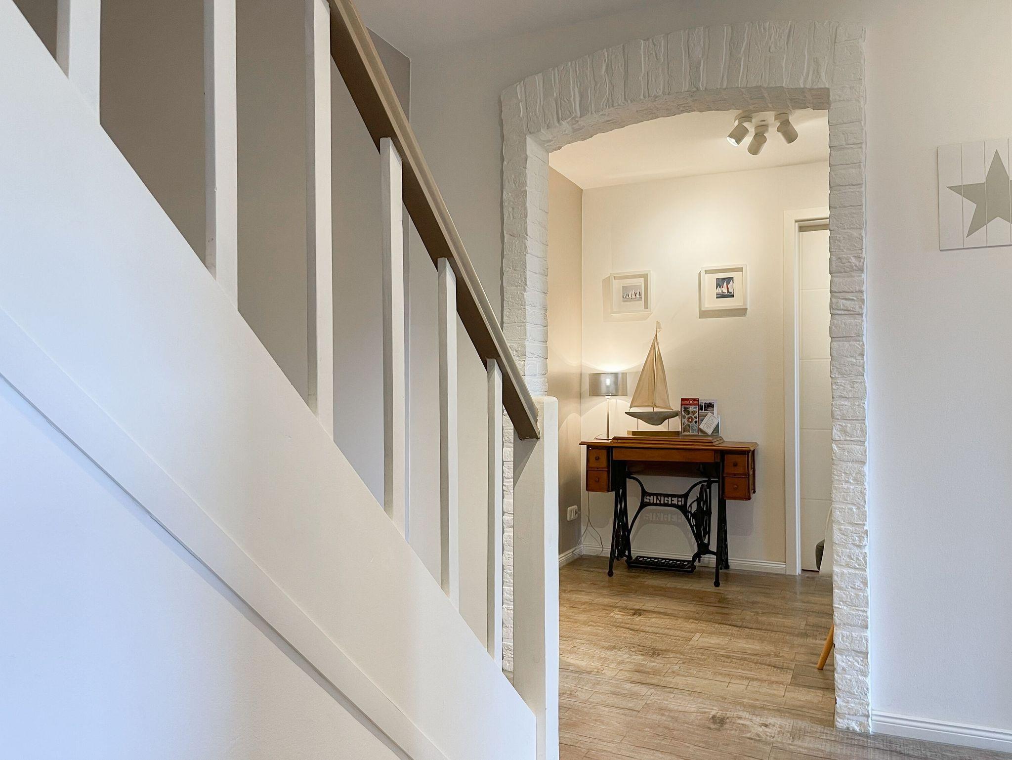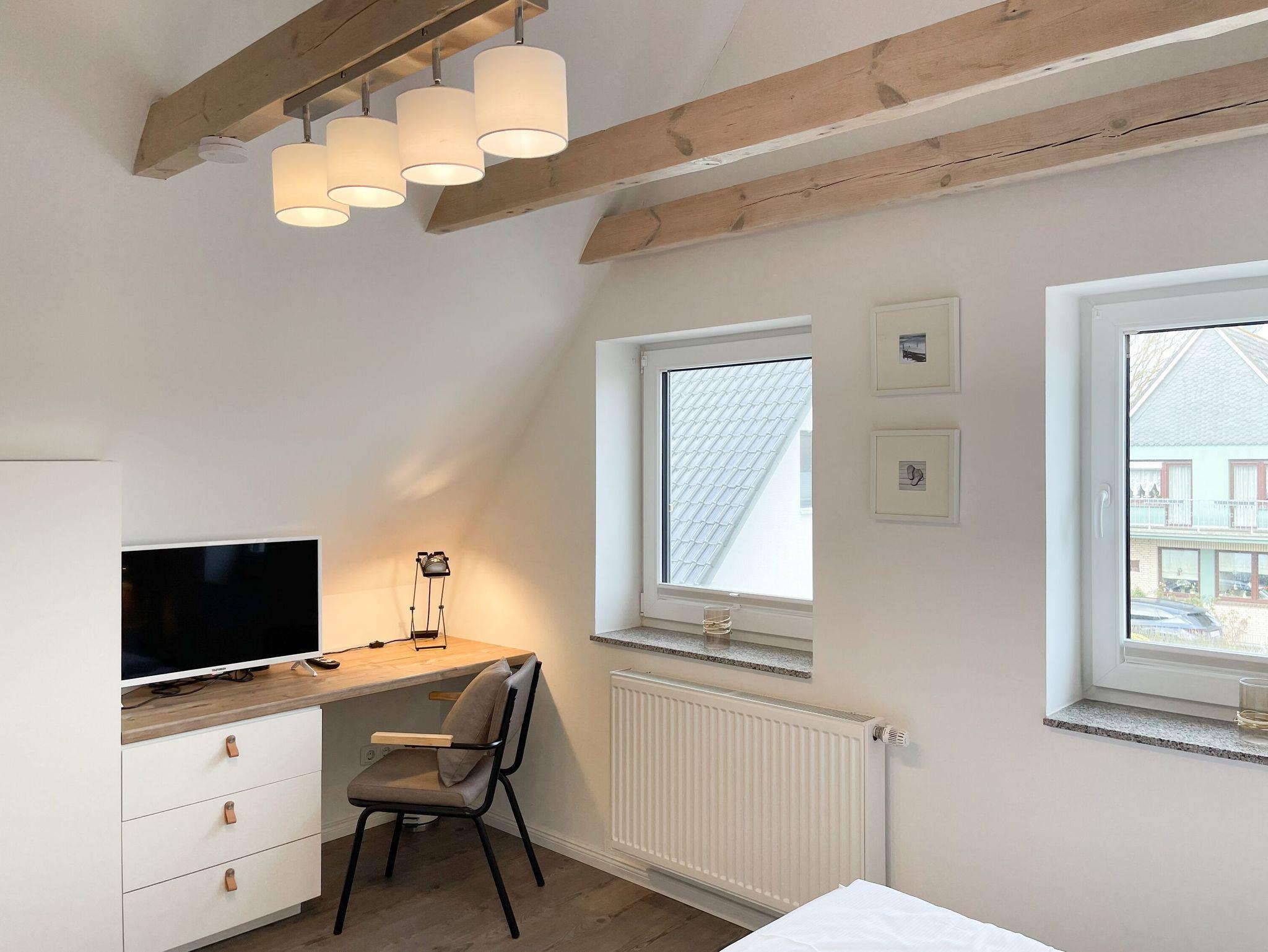 Mittelpunkt des Hauses bildet ein großzügig angelegter, heller Wohnbereich, hochwertig und geschmackvoll eingerichtet (TV, Hifi Anlage, WLAN) mit einem angrenzenden Essbereich, der ausreichend Platz für 6 Personen bietet. Die abgeschlossene Küche [nbsp]ist bestens ausgestattet. Der Bartresen mit zwei Barhockern ist als kleiner Frühstücksbereich oder Treffpunkt für gemeinsames Kochen gedacht. Ein hochwertiges Bad mit Dusche und Badewanne ist ebenfalls im Erdgeschoss untergebracht. Im Obergeschoss befindet sich ein Schlafzimmer mit zwei Einzelbetten (80x200) und ein modernes Duschbad en-suite sowie ein äußerst großzügiges Schlafzimmer mit einem Doppelbett (180x200), TV und Einbauschrank. Ein weiteres kleines Schlafzimmer ist mit einem Einzelbett, Sessel und Kommode eingerichtet.