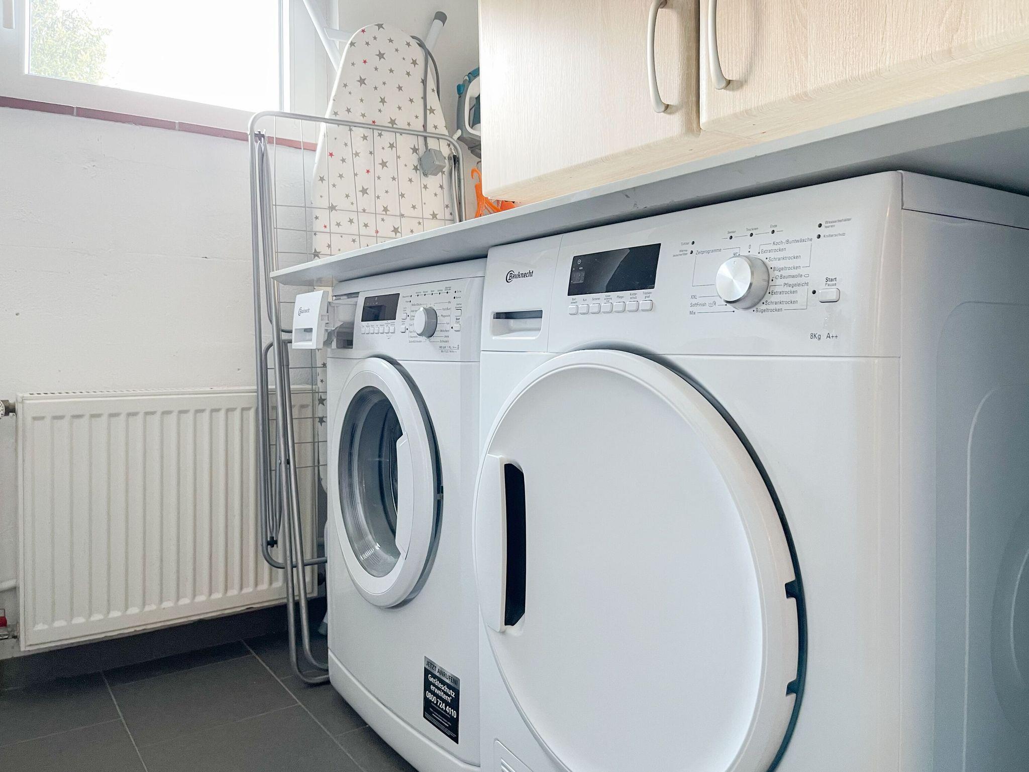 Waschmaschine und Trockner sind[nbsp] im Erdgeschoss untergebracht. Dort gibt es auch einem Abstellraum für Fahrräder. Pkw Stellplätze befinden sich auf dem Grundstück.