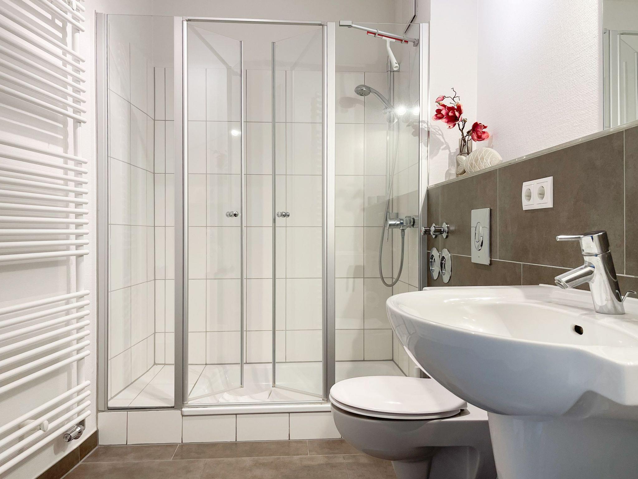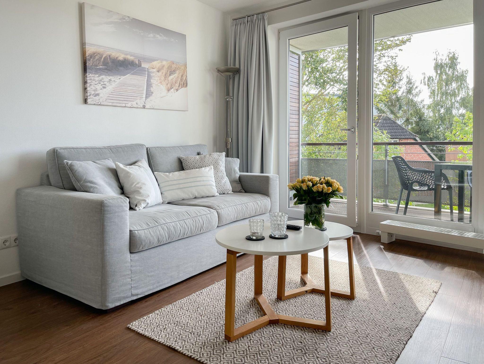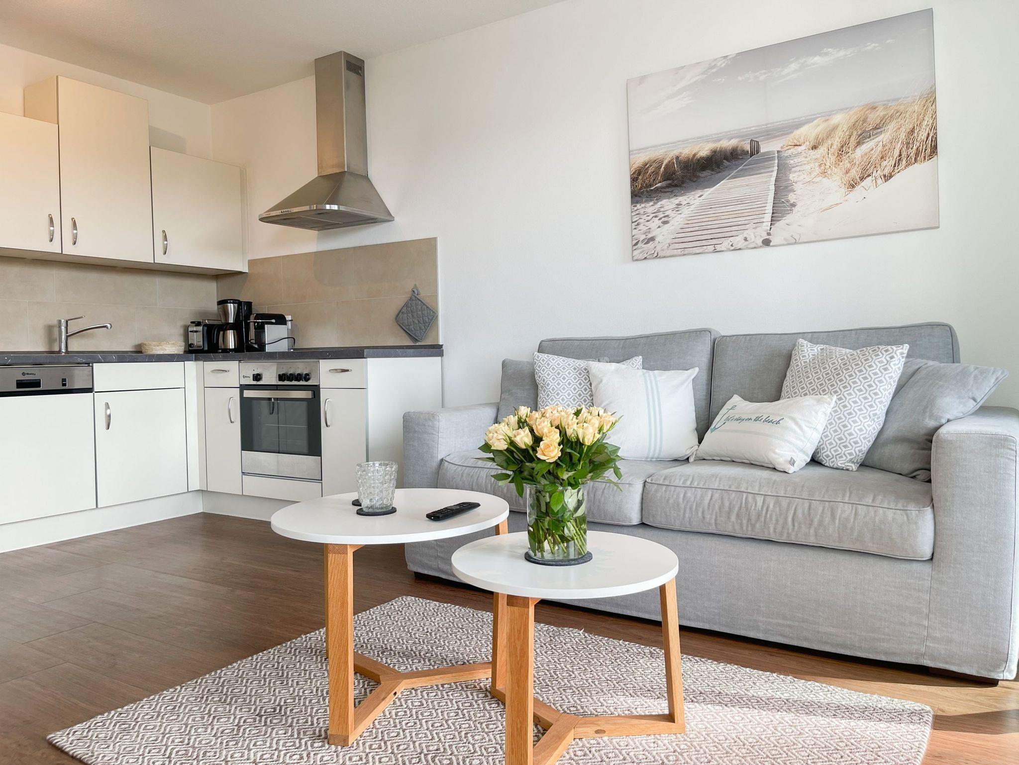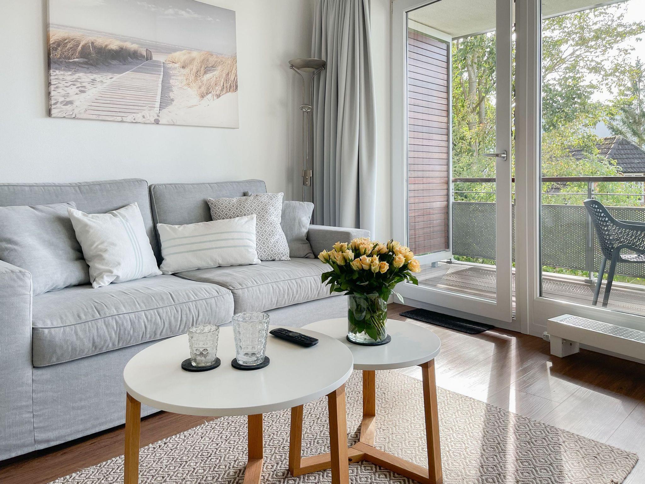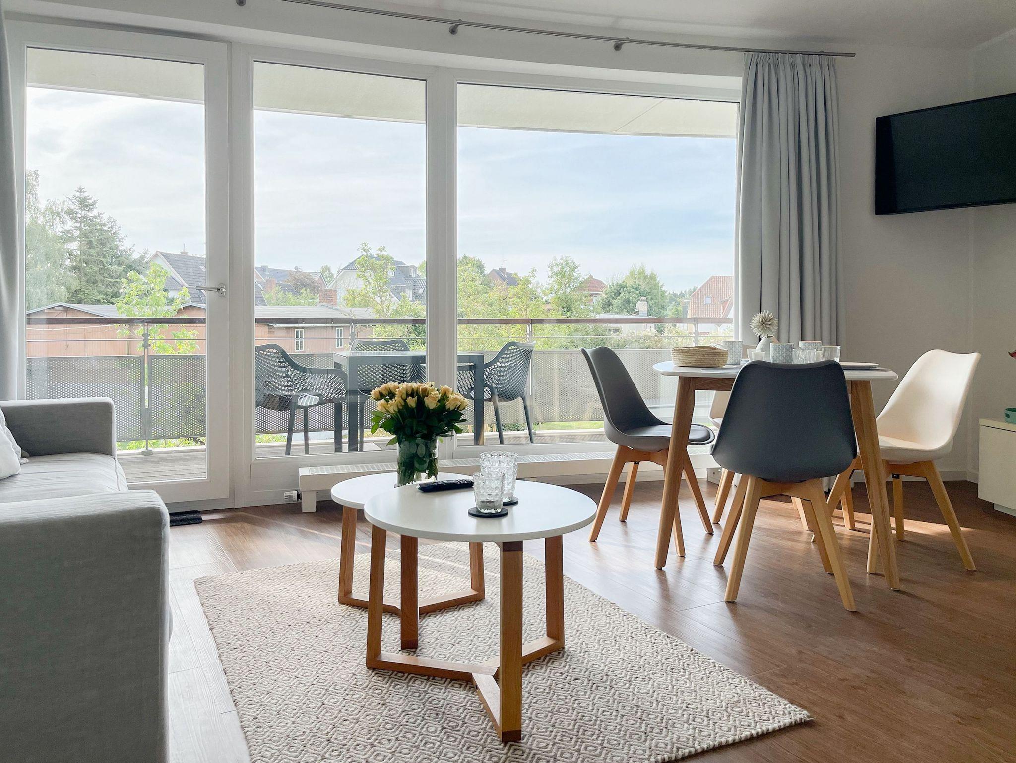 Es erwartet Sie eine geschmackvoll eingerichtete Ferienwohnung mit bodentief verglasten Fensterflächen, die für lichtdurchflutete Räumlichkeiten sorgen, um in einem schönen Ambiente einen entspannten Ostseeurlaub zu verleben. Der große überdachte[nbsp] Sonnenbalkon, der sich über die gesamte Breite der Wohnung erstreckt, ist mit Sonnenliegen, Tisch und Gartenstühlen ausgestattet. Ein herrlicher Rückzugsort zu jeder Tageszeit! Im Wohnbereich erwartet Sie ein hochwertiges Sofa mit Schlaffunktion, TV und Radio. WLAN steht selbstverständlich kostenlos zur Verfügung. Der anschließende Essbereich bietet ausreichend Platz für gemeinsame Mahlzeiten und gemütliches Beisammensein. Die integrierte Einbauküche verfügt über alle technischen Geräte und eine gute Ausstattung, um gemeinsam zu kochen. Das Schlafzimmer ist mit einem hochwertigen Boxspringbett(180x200), einen geräumigen Schrank für die Urlaubsgarderobe und einem zusätzlichen TV eingerichtet.[nbsp] Die gesamte Fensterfläche ist mit Verdunkelungsvorhängen versehen. Das großzügig geschnittene Bad verfügt über Dusche, Waschbecken, WC, Föhn und Handtuchtrockner.