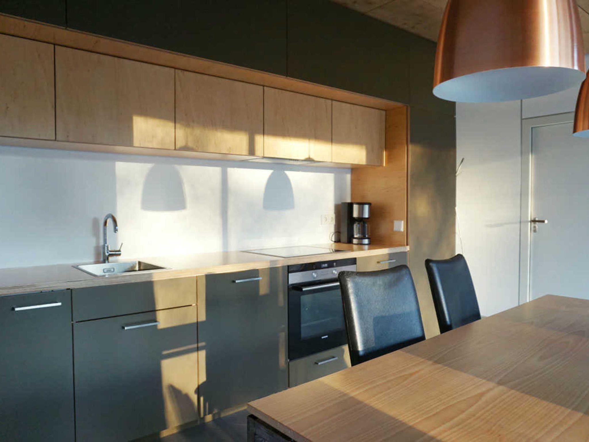 • Induktionskochfeld • Dunstabzugshaube • Kühlschrank mit Gefrierfach • Geschirrspüler • Backofen • Kaffeemaschine • Wasserkocher • Toaster • Geschirrtücher und -spülmittel