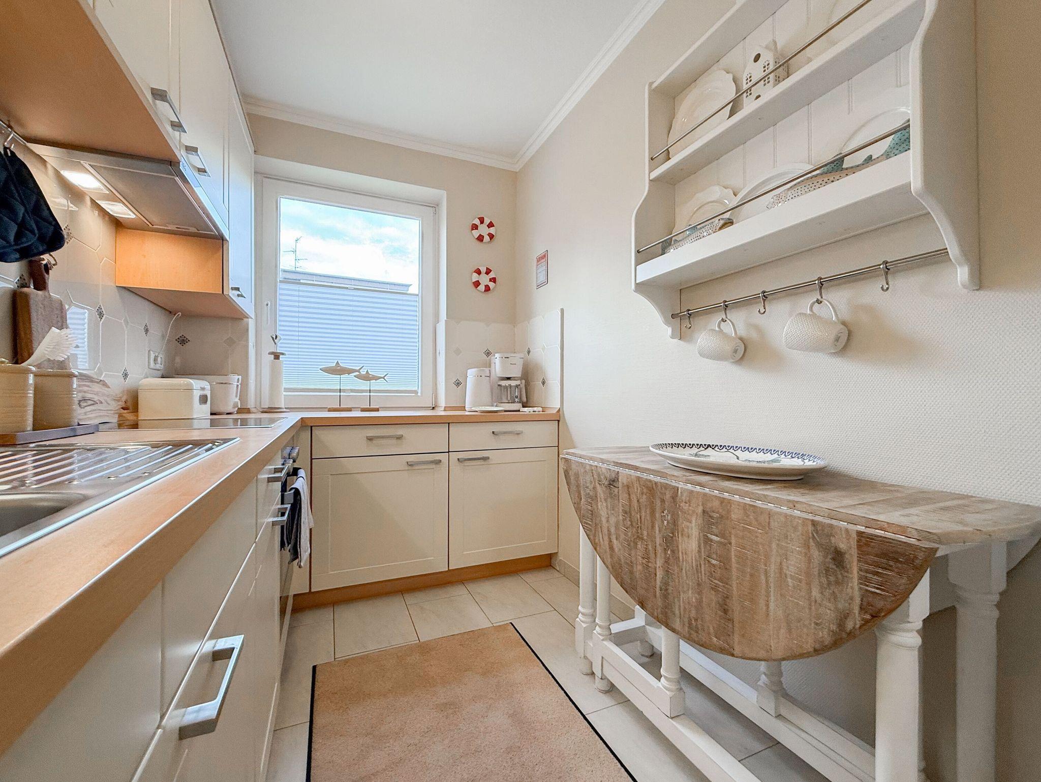 Die äußerst liebevoll und geschmackvoll gestaltete Ferienwohnung bietet Ihnen einen behaglichen Rückzugsort für entspannte Urlaubstage, ohne auf den typischen Charme und die lebendige Lebensart von Timmendorfer Strand zu verzichten. Dank durchdachter Raumaufteilung, hochwertiger Materialien und liebevoller Details entfaltet sich von der ersten Sekunde an eine warme, einladende Atmosphäre, in der Sie sich sofort wie zu Hause fühlen können. Es erwartet Sie ein schöner Wohnbereich, der mit einem Sofa, einem Sessel und TV ausgestattet ist. Der integrierte Essbereich ist großzügig und sehr gemütlich mit Korbsesseln eingerichtet. Genießen Sie sonnige Stunden auf der großzügigen Südwestterrasse, die mit einer Markise sowie Gartenmöbeln ausgestattet ist.[nbsp] Ob frühmorgendlicher Kaffee, ruhige Nachmittage mit einem guten Buch oder ein Glas Wein unter freiem Himmel hier finden Sie den perfekten Ort, um den Tag in der Sonne in vollen Zügen zu genießen. Die separate Küche ist bestens ausgestattet, damit Sie bequem kochen und genießen können hier finden Sie alles, was Sie brauchen. Das Schlafzimmer verfügt über ein Doppelbett (180x200), zwei große Kleiderschränke mit reichlich Stauraum, die Fenster lassen sich durch spezielle Vorhänge verdunkeln. Das Bad ist mit Waschtisch, Dusche, WC und Handtuchtrockner ausgestattet. Ein praktischer Abstellraum befindet sich im Flurbereich.