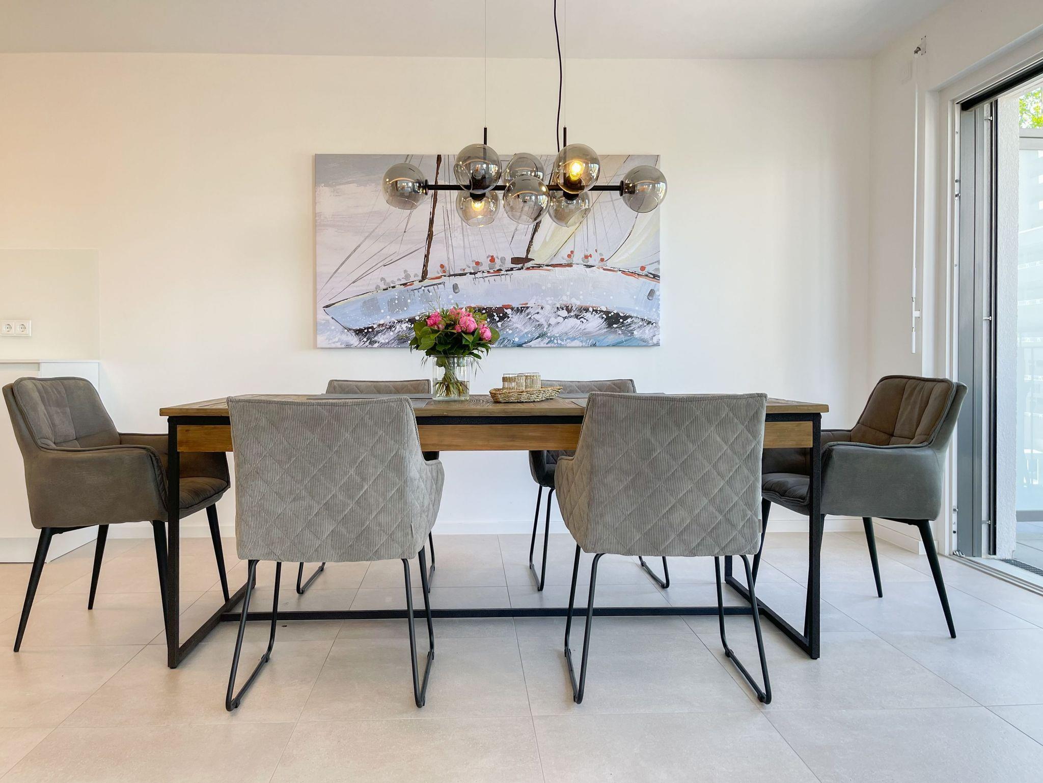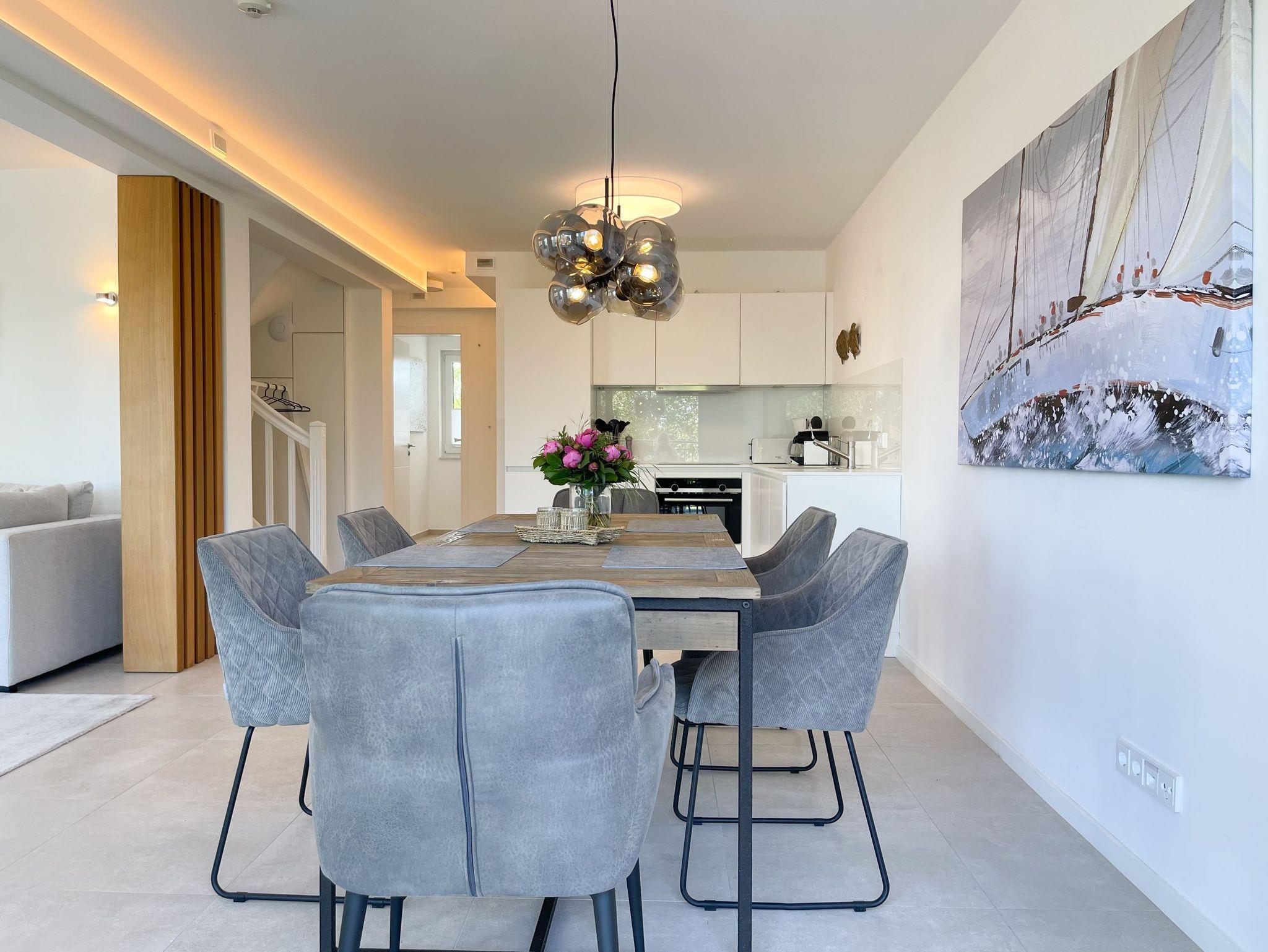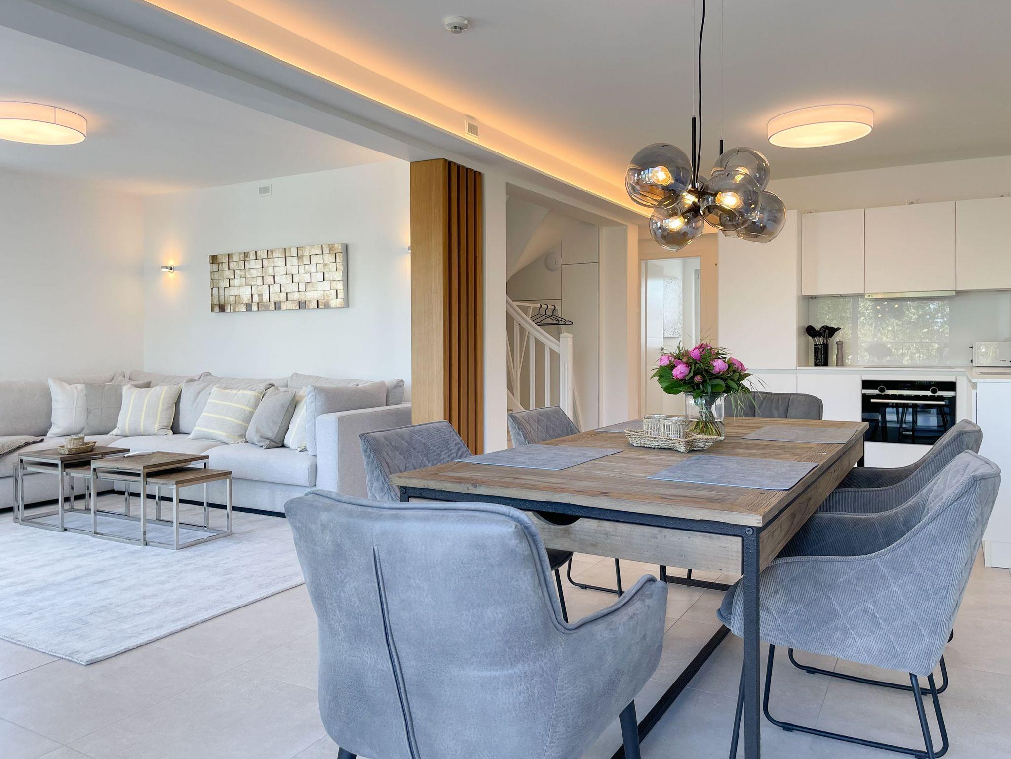 Das traumhafte Penthouse erstreckt sich über zwei großzügige Wohnebenen und bietet herrliche Ausblicke bis auf die Ostsee. Mit drei Schlafzimmern, zwei Bädern und einem separaten Gäste WC, ist es perfekt für sechs Personen geeignet, um einen entspannten Ostseeurlaub in absoluter Strandnähe zu verleben. Die[nbsp] geschmackvolle Einrichtung und hochwertige Ausstattung sorgt für höchsten Wohnstandard in bester Lage. Unten erwartet Sie ein lichtdurchfluteter Wohnbereich mit einem XL-Sofa; TV, Radio und WLAN sind selbstverständlich vorhanden. Die umlaufende Dachterrasse in Richtung Ost und Süd lockt mit traumhaftem Blick und frischer Seeluft ins Freie. Der großzügige Essbereich bietet ausreichend Raum für gemeinsame Mahlzeiten, Spieleabende oder gemütliches Beisammensein. Küche, Gäste WC und Bad 1 mit großer Walk In Dusche, Badewanne, Waschtisch[nbsp] Handtuchtrockner und Fenster befinden sich ebenfalls auf der unteren Wohnebene. Die Infrarotsauna, hervorragende Wirkung gegen Verspannungen und zur Entschlackung, befindet sich in einem hellen, abgeschlossen Raum, der über das Bad 1 zu erreichen ist. Auf der oberen Wohnebene gibt es drei Schlafzimmer, alle mit Boxspringbetten, Einbauschränken, Verdunkelungsplisses und TV eingerichtet sowie das 2. Bad, ebenfalls mit Walk In Dusche, Waschtisch und WC. In einem Schlafzimmer befindet sich zusätzlich ein Schreibtisch für das Homeoffice mit herrlichem Ostseeblick.
