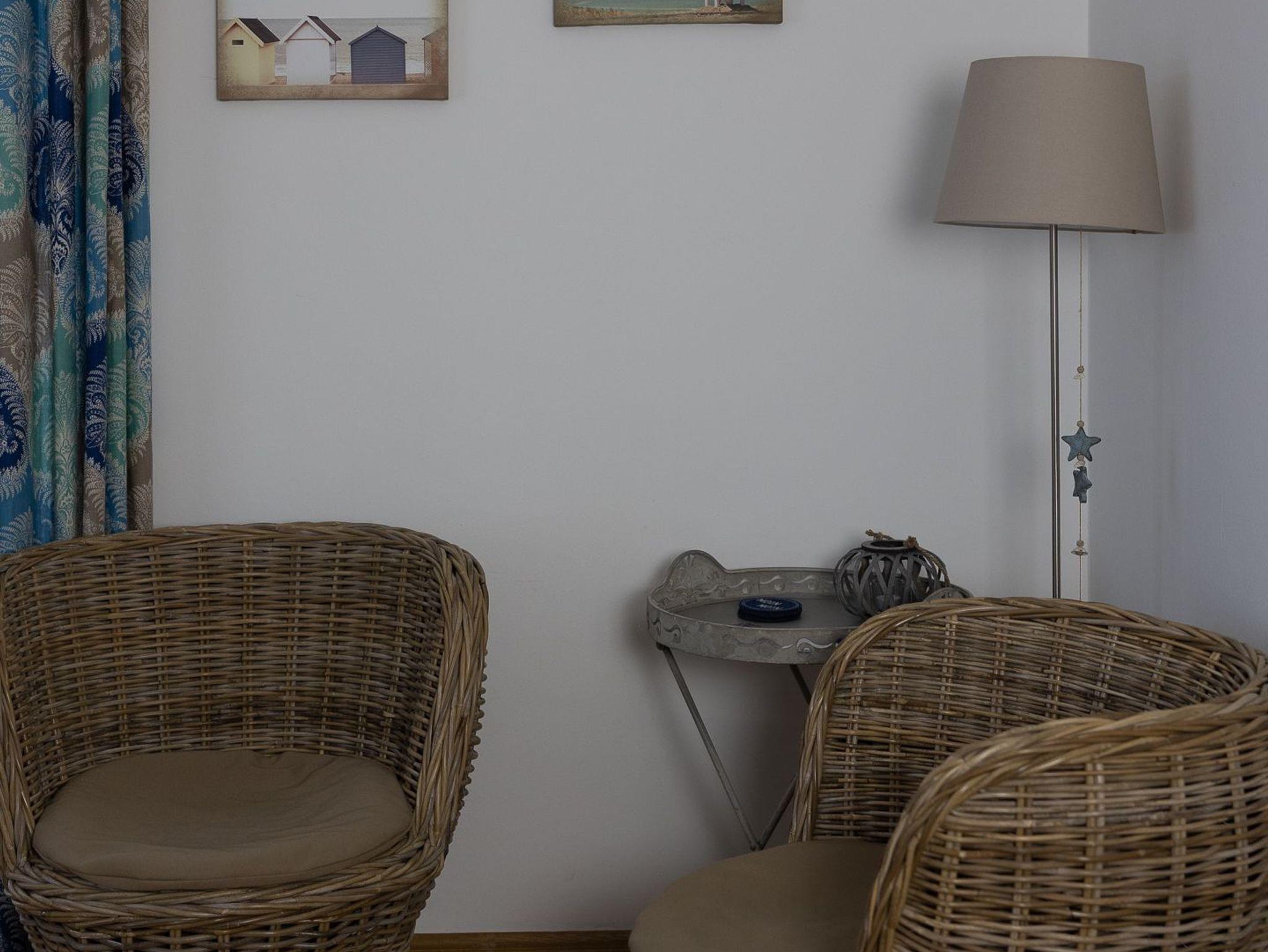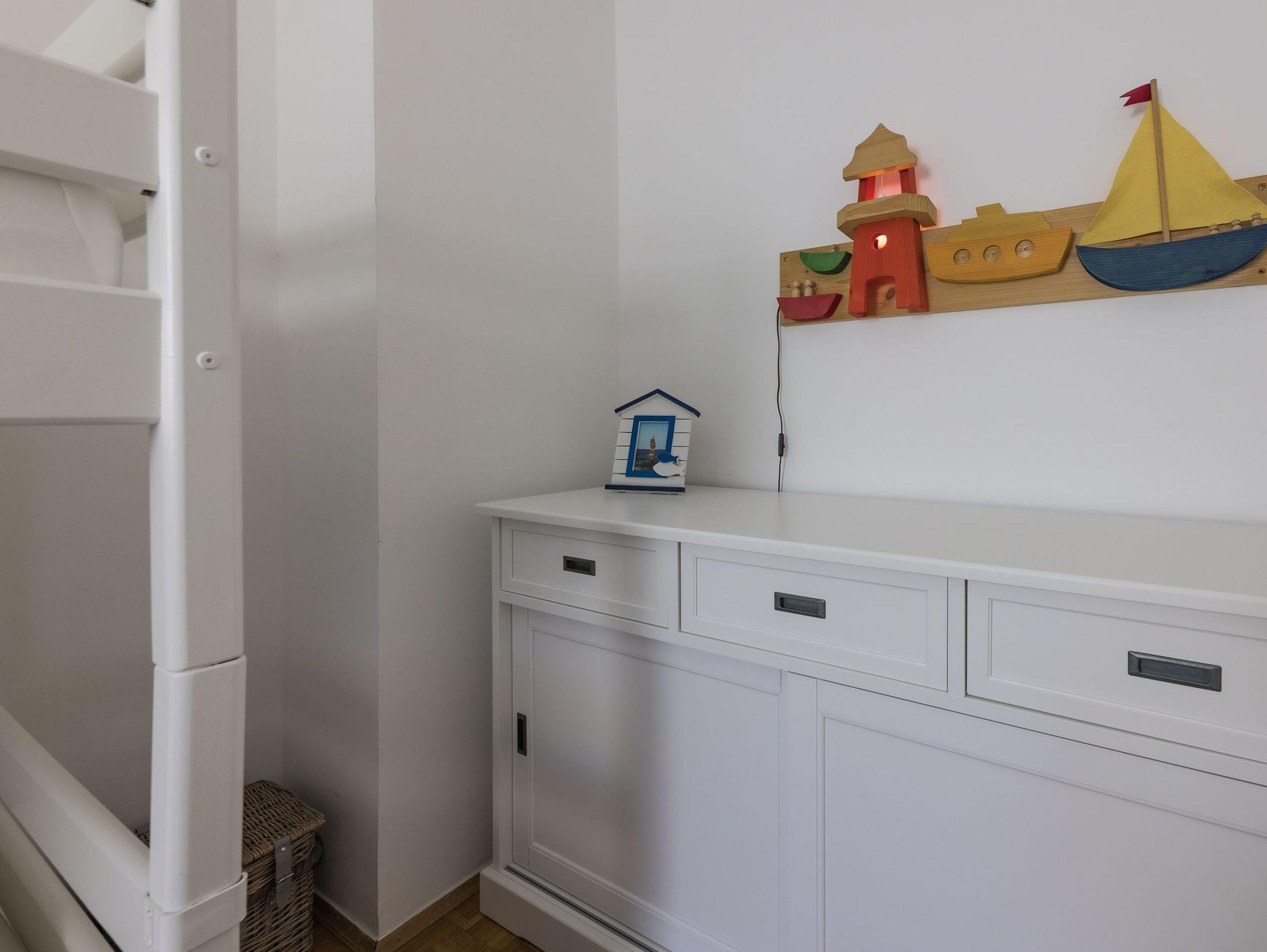 Großes Appartement mit Schlafzimmer und Doppelbett, Kinderzimmer mit Etagenbett. Wohnzimmer mit Sofa und Seeseln, Küche mit Sitzgelegenheit, Bad mit Fenster.