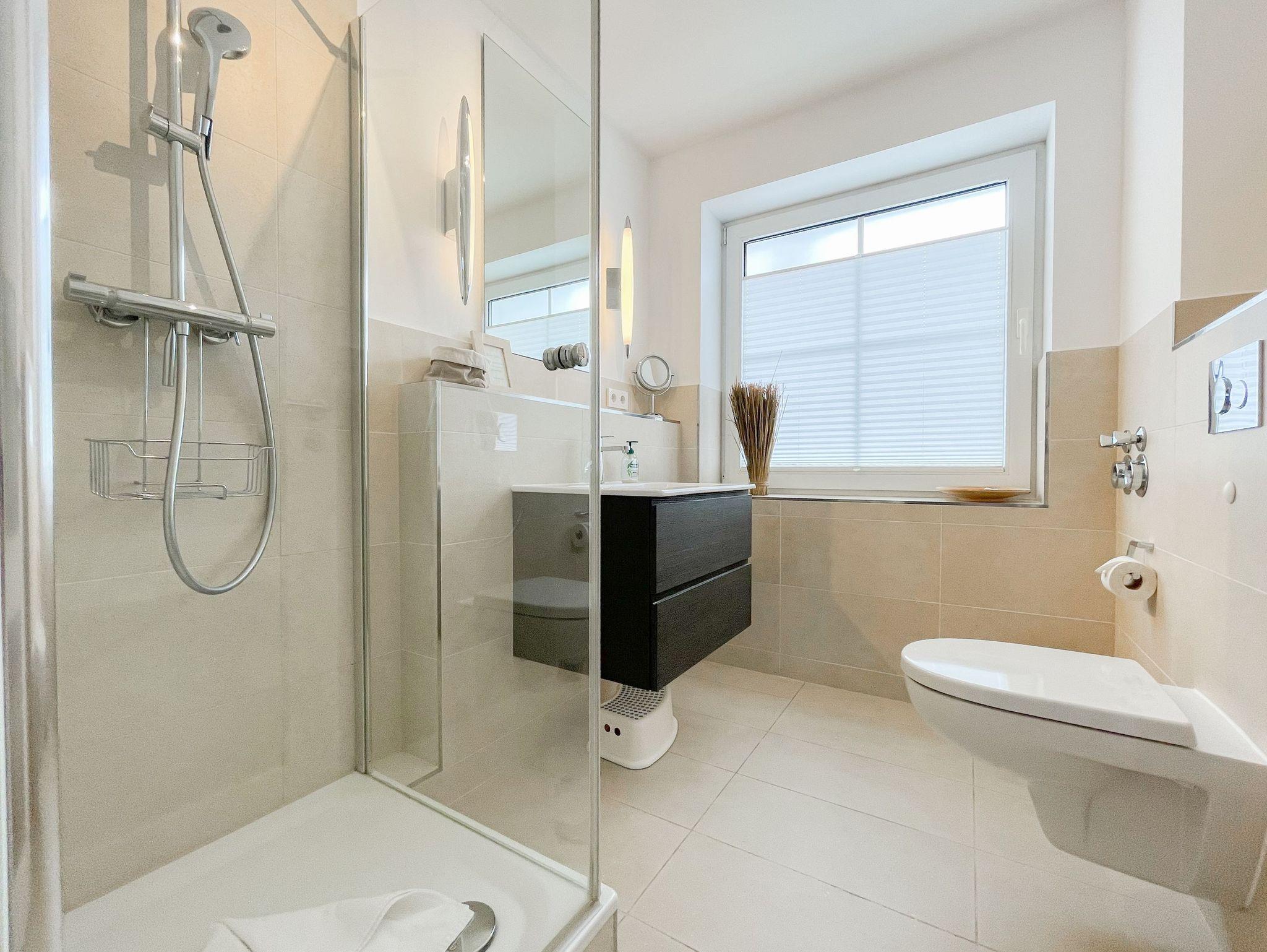 Bodentiefe Fensterelemente, Echtholzparkett und eine hochwertige Einrichtung schaffen eine helle und freundliche Wohnatmosphäre. Alle Fenster sind mit elektrischen Außenjalousien versehen. Es steht ein geschmackvoller, großzügiger Wohnbereich (Sofa mit Schlaffunktion 140x200) mit angrenzendem Essbereich zur Verfügung. TV, Radio, CD Player und kostenloser Internetzugang überWLAN sind vorhanden. Die moderne Küchenzeile ist bestens ausgestattet und verfügt über Geschirrspülmaschine und Mikrowelle mit Backfunktion. Das Schlafzimmer ist mit einem Doppelbett (180x200), Einbauschrank und einem zusätzlichen TV ausgestattet. Das moderne Bad mit großem Fenster verfügt über eine Dusche, Waschtisch, WC, Handtuchwärmer und Fön. Ein Pkw Stellplatz befindet sich in der Tiefgarage (Einfahrtshöhe 1,75 m), Aufzug, Fahrradkeller (eine Platzgarantie für Ihre Fahrräder besteht nicht) sowie Waschmaschine und Trockner (Münzgeräte) sind vorhanden.
