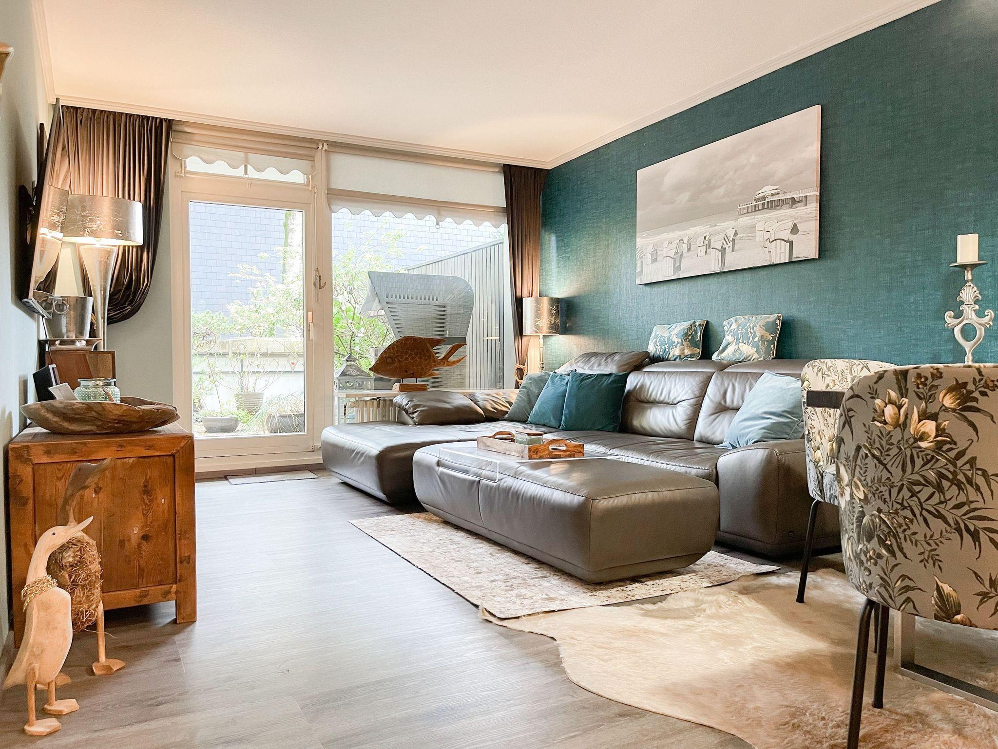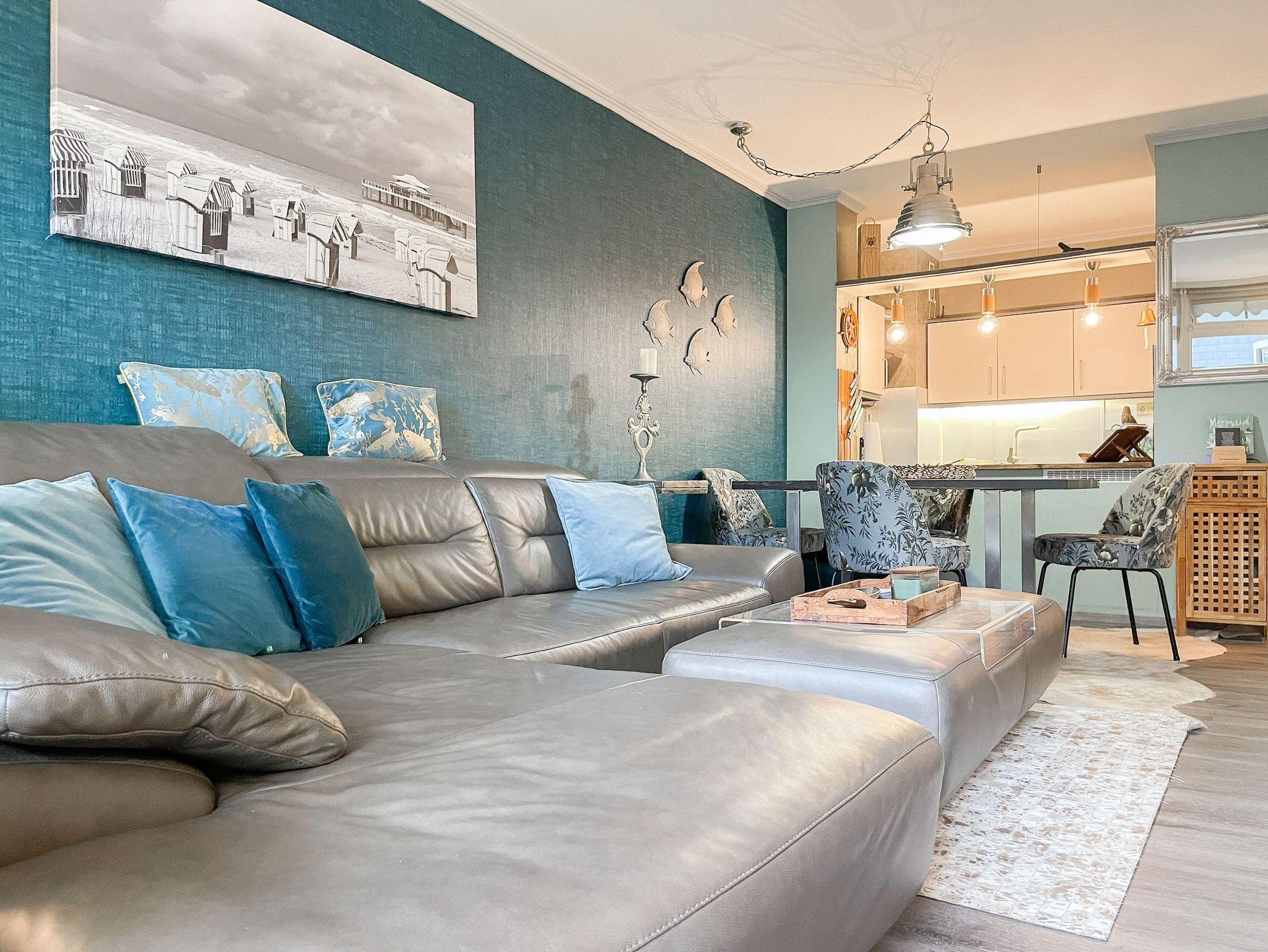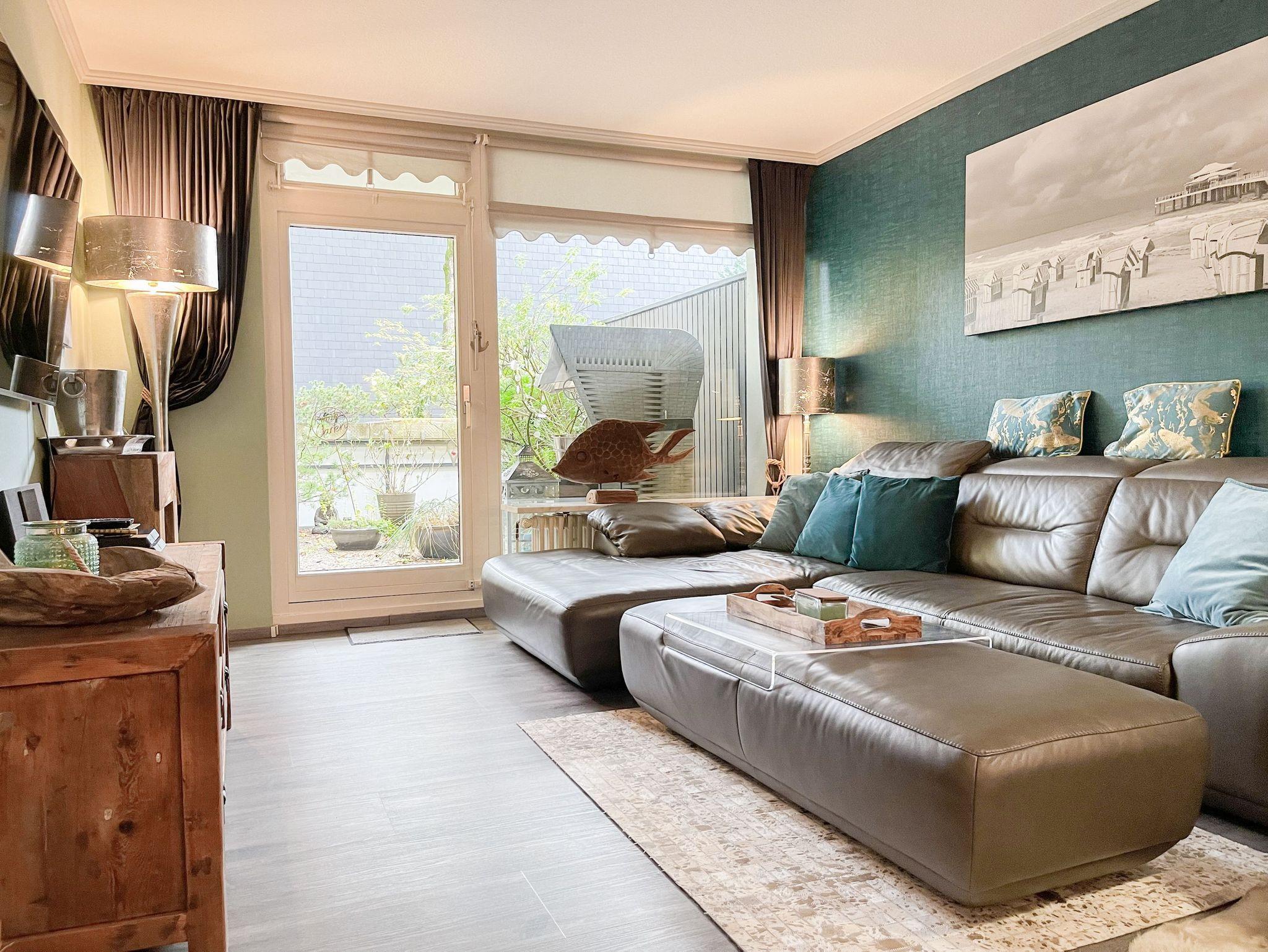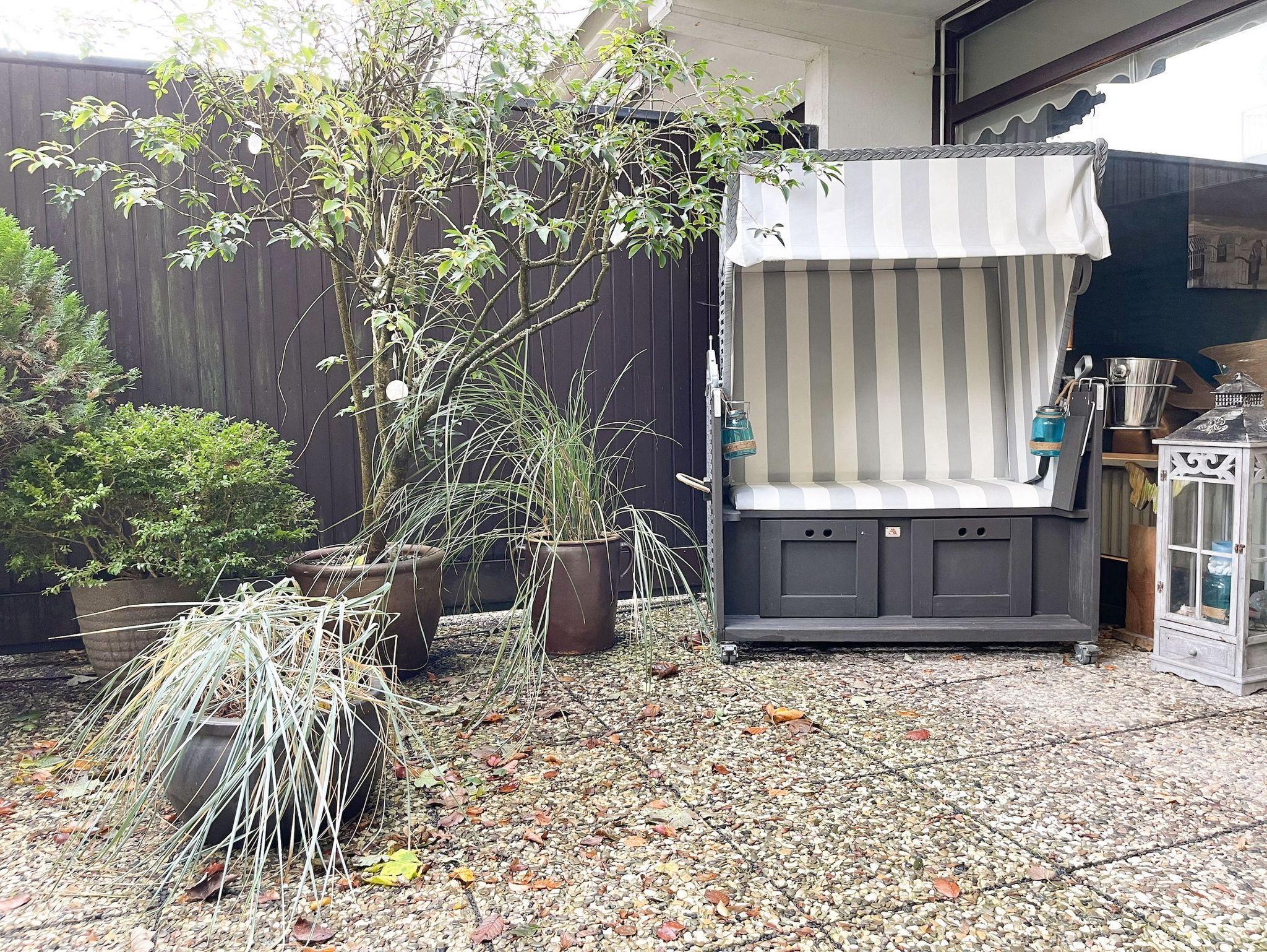 Es erwartet Sie eine gemütlich eingerichtete Ferienwohnung mit ausreichen Raum für 2 Personen, um einen entspannten Urlaub in Strandnähe zu verleben. Highlight ist die riesige, liebevoll bepflanzte Terrasse von 70 qm, die sich über die gesamte Breite der Wohnung erstreckt und mit Gartenmöbeln und einem Strandkorb ausgestattet ist. Ein herrlicher Rückzugsort zu jeder Tageszeit. Der Wohnbereich ist mit einem XL Sofa plus Recamiere und TV ausgestattet, der anschließende Essbereich bietet ausreichend Platz für 4 Personen für gemeinsame Mahlzeiten und gemütliches Beisammensein. Die integrierte Küche ist gut ausgestattet und durch einen Tresen vom Wohnbereich getrennt. Das Schlafzimmer ist mit einem Doppelbett (180x200), einem Kleiderschrank mit ausreichend Stauraum. Die Fenster sind mit vertikal Lamellen versehen, die etwas Licht nehmen, jedoch nicht vollständig verdunkeln. Das Bad verfügt über einen Waschtisch, Föhn, WC und eine Badewanne kombiniert mit einer Dusche.