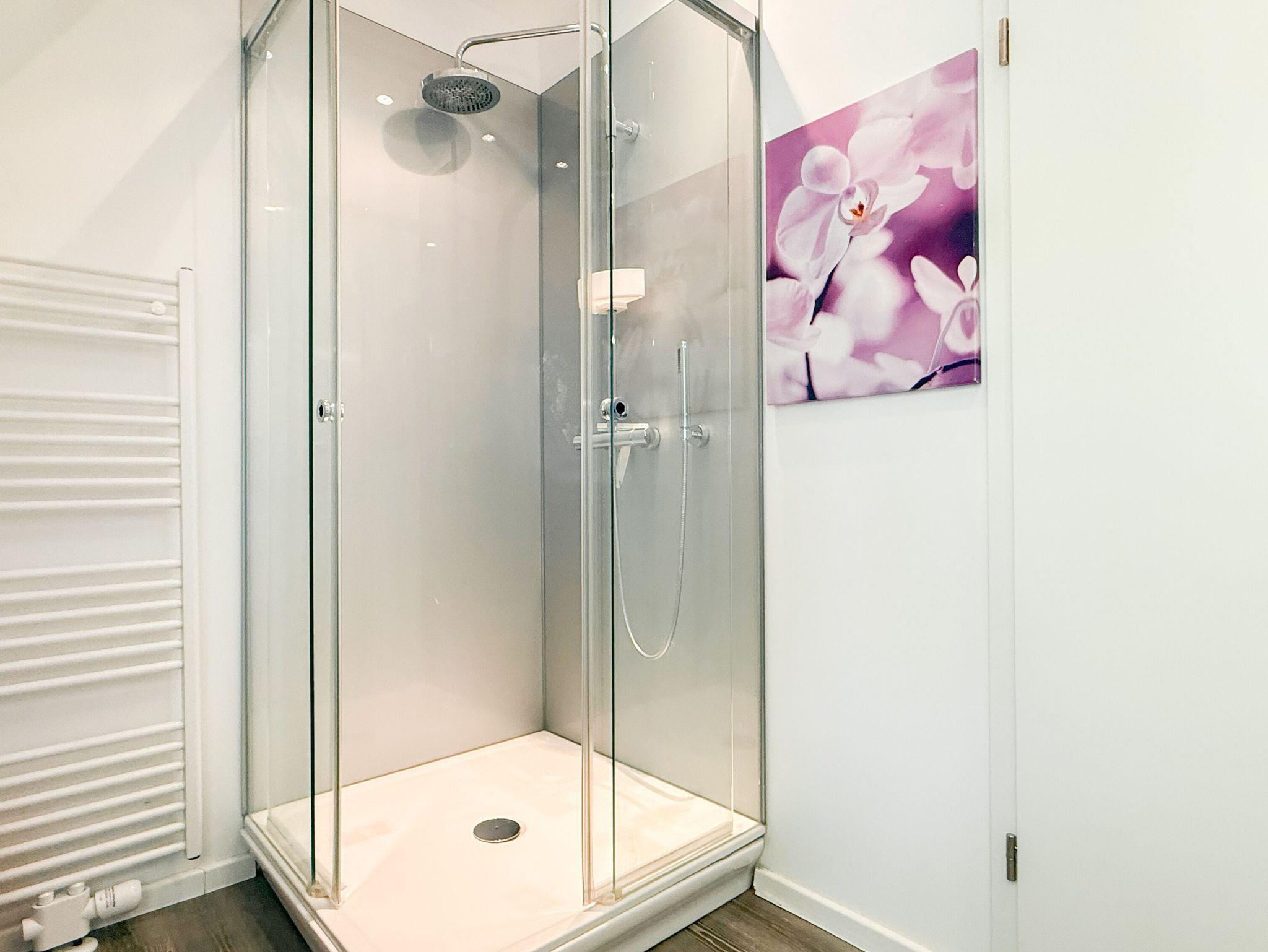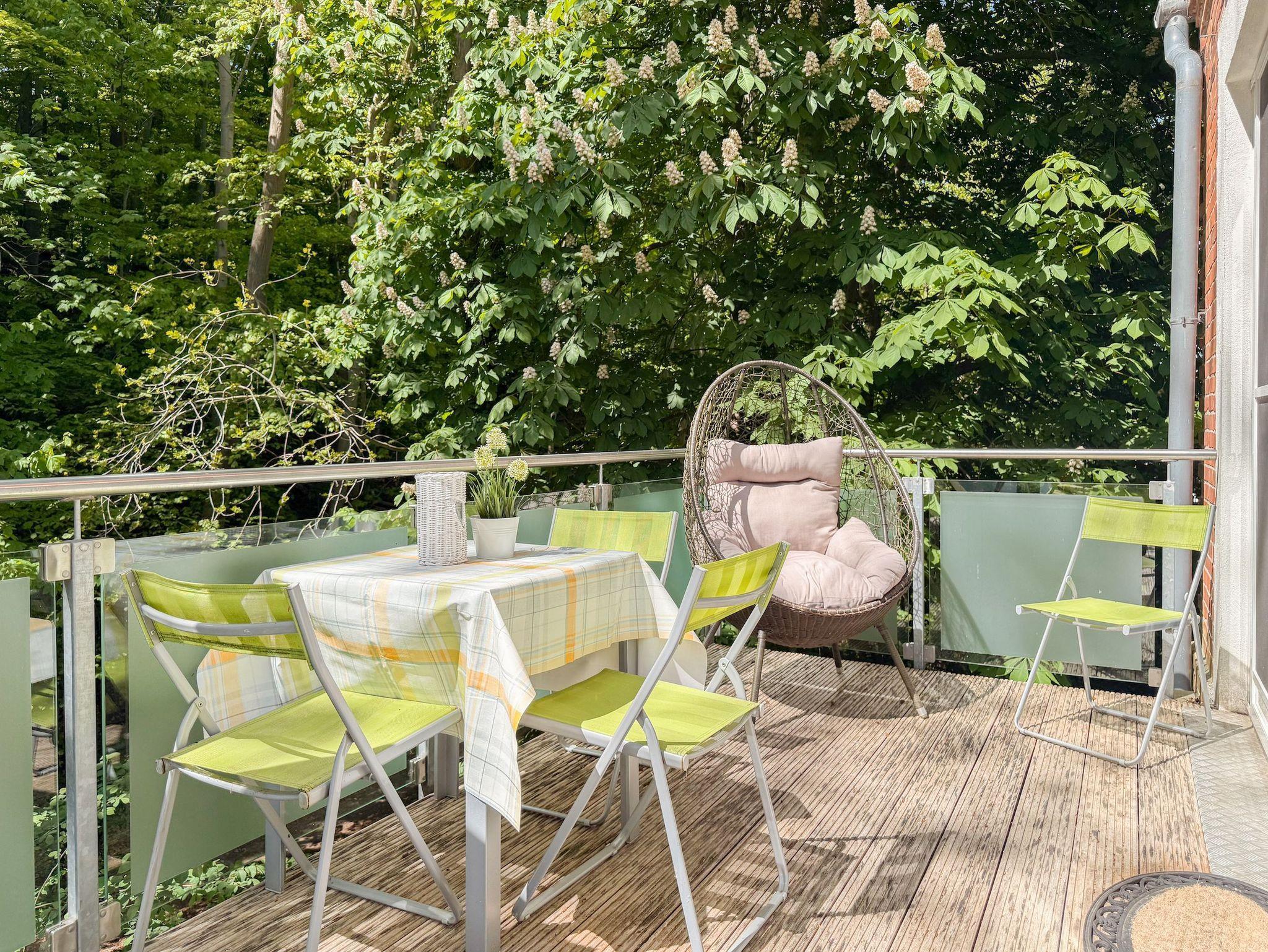 Diese Wohnung erstreckt sich über zwei Ebenen. Im unteren Bereich finden Sie einen gemütlichen Wohnbereich mit einem hochwertigen Schlafsofa, einen Essbereich sowie eine gut ausgestattete Küche. Durch eine praktische Schiebetür lässt sich der Bereich bei Bedarf verstecken. Der großzügige Balkon bietet absolute Privatsphäre und besticht durch einen herrlichen Blick ins Grüne perfekt für entspannte Stunden im Freien. Eine Garderobe und ein separates Gäste WC sind ebenfalls auf der unteren Wohnebene unterbracht. Das Dachgeschoss ist über eine Wendeltreppe zu erreichen. Dort gibt es eine kleine Galerie mit einem Schreibtisch perfekt für Workation oder kreative Pausen. Das großzügige Schlafzimmer ist mit einer Klimaanlage, einem zusätzlichen TV und Verdunkelungsvorhängen ausgestattet. Das exklusive Duschbad mit Tageslichtfenster sorgt für ein angenehmes und helles Ambiente.