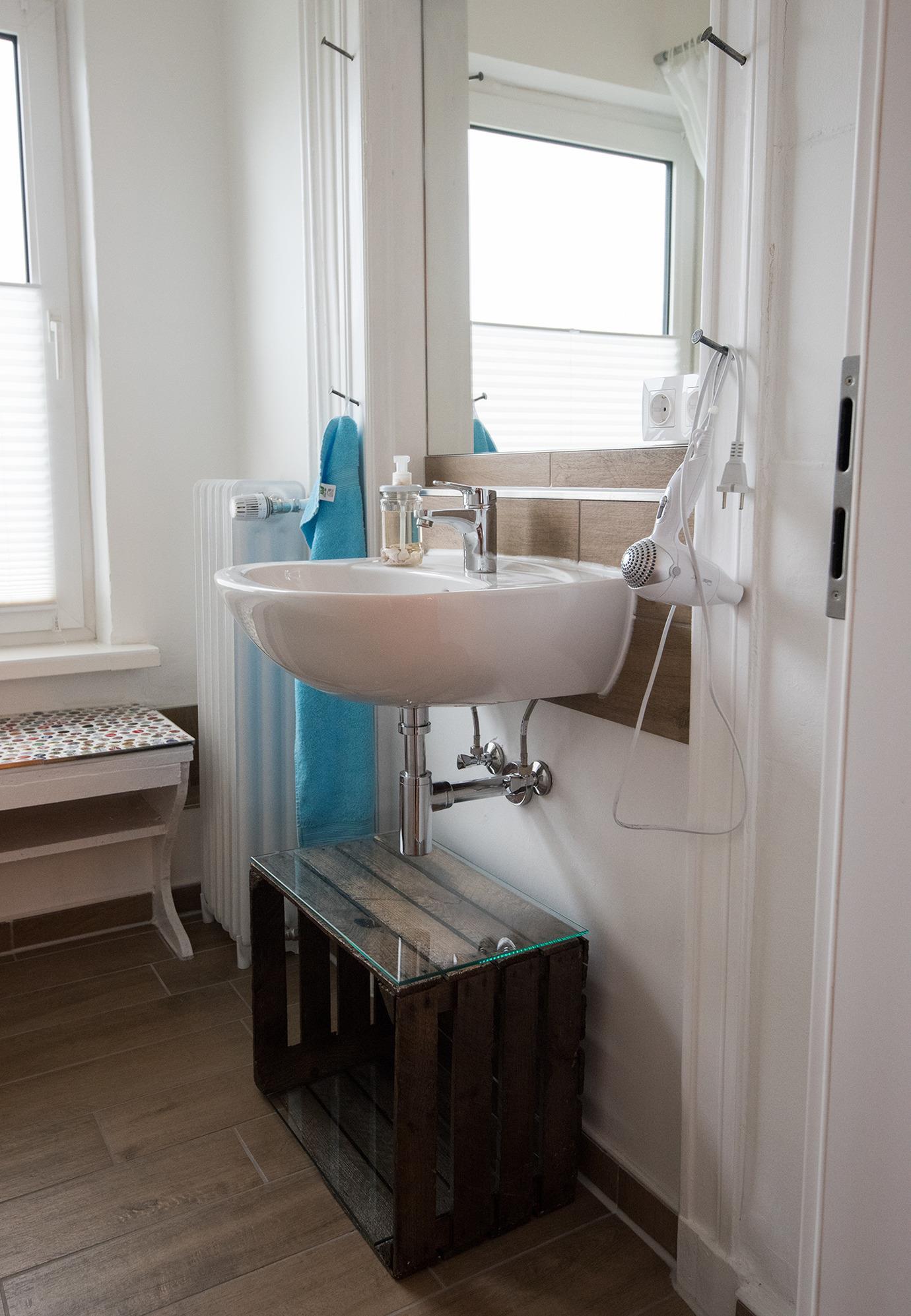 Genießen Sie Ihre Ferien in vollen Zügen, bei schönem Wetter auch gerne draußen auf der Gemeinschaftsterrasse. Das Badezimmer ist ausgestattet mit einer modernen Duschbadewanne und einem Haartrockner.
