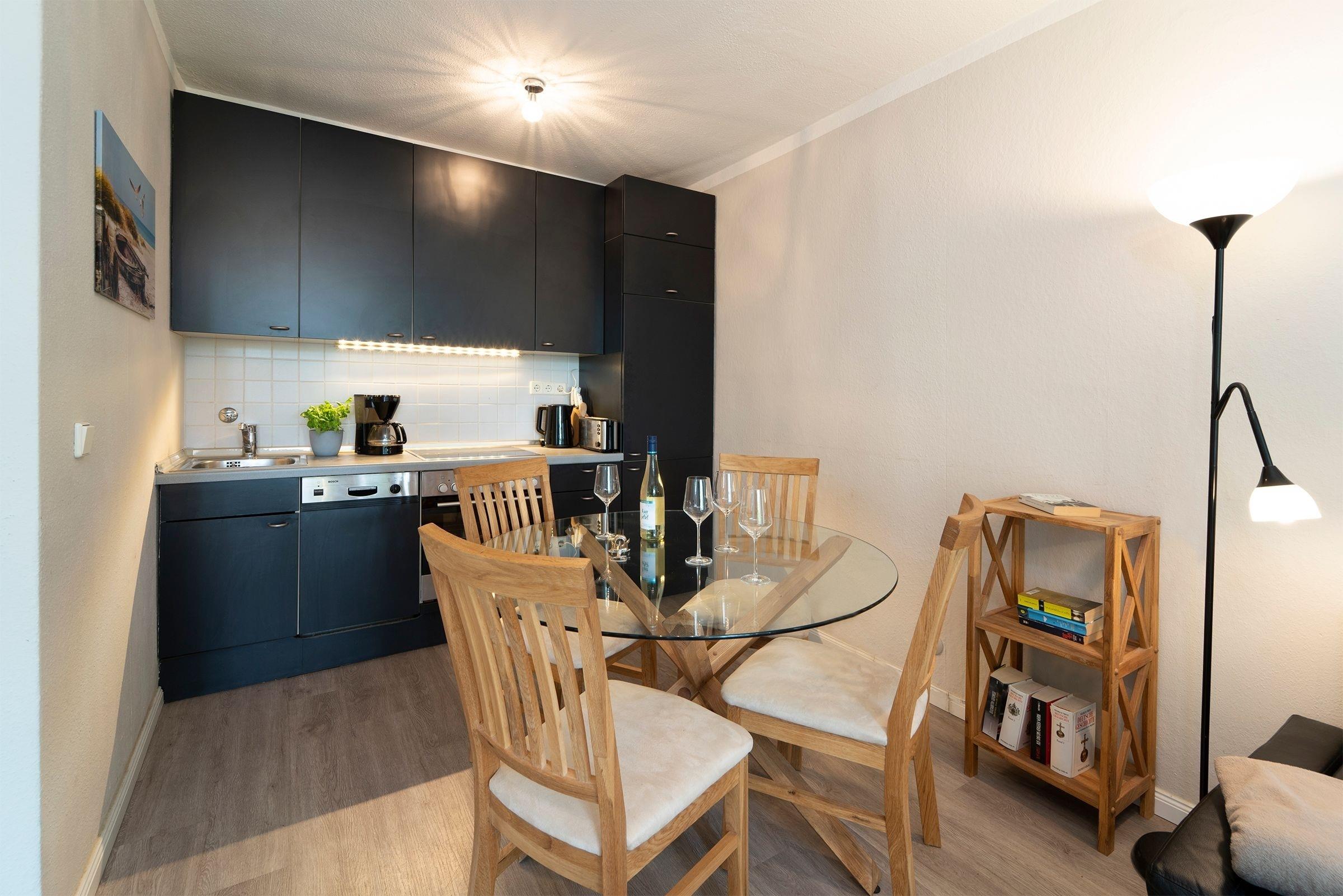 Vom Eingang des Wohnhauses sind es nur noch wenige Treppenstufen bis zu Ihrem Feriendomizil. Ein heller Flur mit Einbauschränken auf der linken Seite empfängt Sie. Rechts daneben das schöne renovierte Duschbad mit ebenerdiger Dusche, Handtuchwärmer, Spiegelschrank und Föhn. Geradeaus vom Flur ist das helle Wohnzimmer mit integrierter vollausgestatteter Küchenzeile und Essplatz. Entspannen Sie sich am Abend bei einem guten Film auf dem gemütlichen Eckledersofa oder auf dem großen Balkon bei einem guten Tropfen. Charmant abgetrennt durch eine dekorative Schiebetür ist das Schlafzimmer vom Wohnzimmer. Ein kuscheliger Raum mit Boxspringbett (160x200 cm) und Schiebetürenkleiderschrank. Im Schlafzimmer und Wohnzimmer sind Verdunkelungsgardinen angebracht. Kostenfreies WLAN gehört natürlich auch zur Ausstattung.