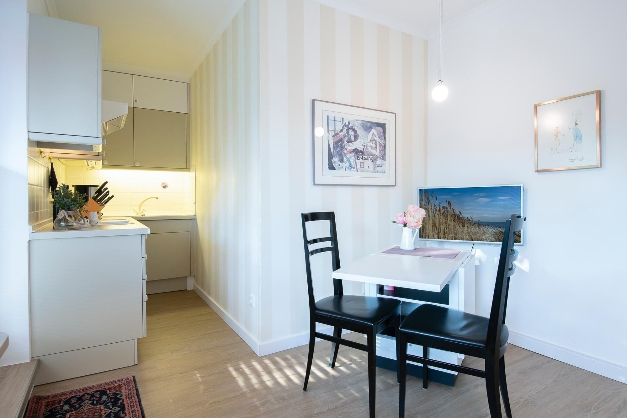 Das kleine, gemütliche Appartement begrüßt Sie mit einem offenen Wohn-/Schlaf- und Kochbereich. Auf dem behaglichen Sofa können Sie tagsüber kuscheln und fernsehen und zur Nacht verwandeln Sie es in einen komfortablen Schlafplatz (Liegefläche 160x200 cm). Die in den Raum integrierte Küche ist gut ausgestattet und Sie können mühelos schmackhafte Mahlzeiten zubereiten. Über den kostenlosen WLAN-Anschluss können Sie Ihre Lieblingsmusik streamen. An der frischen Ostseeluft wartet auf Sie ein echtes Sonnenplätzchen - der großzügige, möblierte Balkon wird Ihnen viele unvergessliche Urlaubsstunden bescheren. Eine Markise spendet bei Bedarf Schatten, wenn Sie auf der Sonnenliege in einem guten Buch schmökern. Das neuwertige Badezimmer mit Dusche, beheizbarem Handtuchhalter und Fön rundet die Ausstattung dieser niedlichen Ferienwohnung ab.