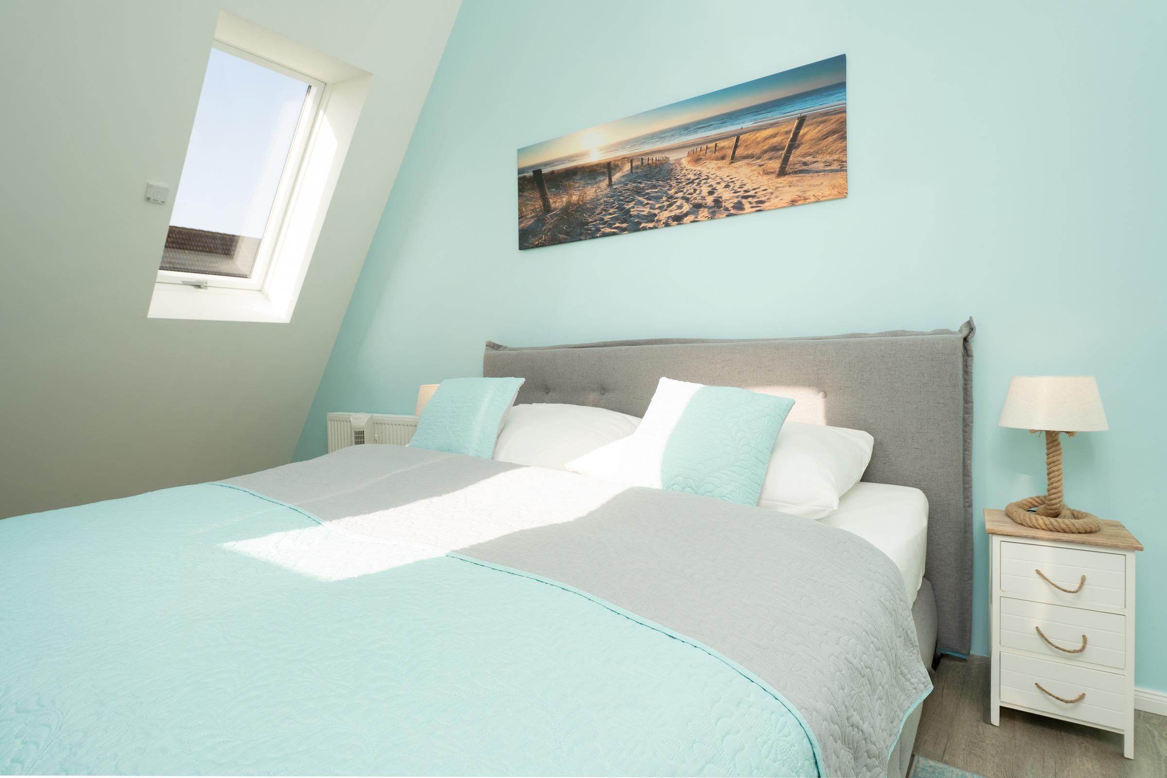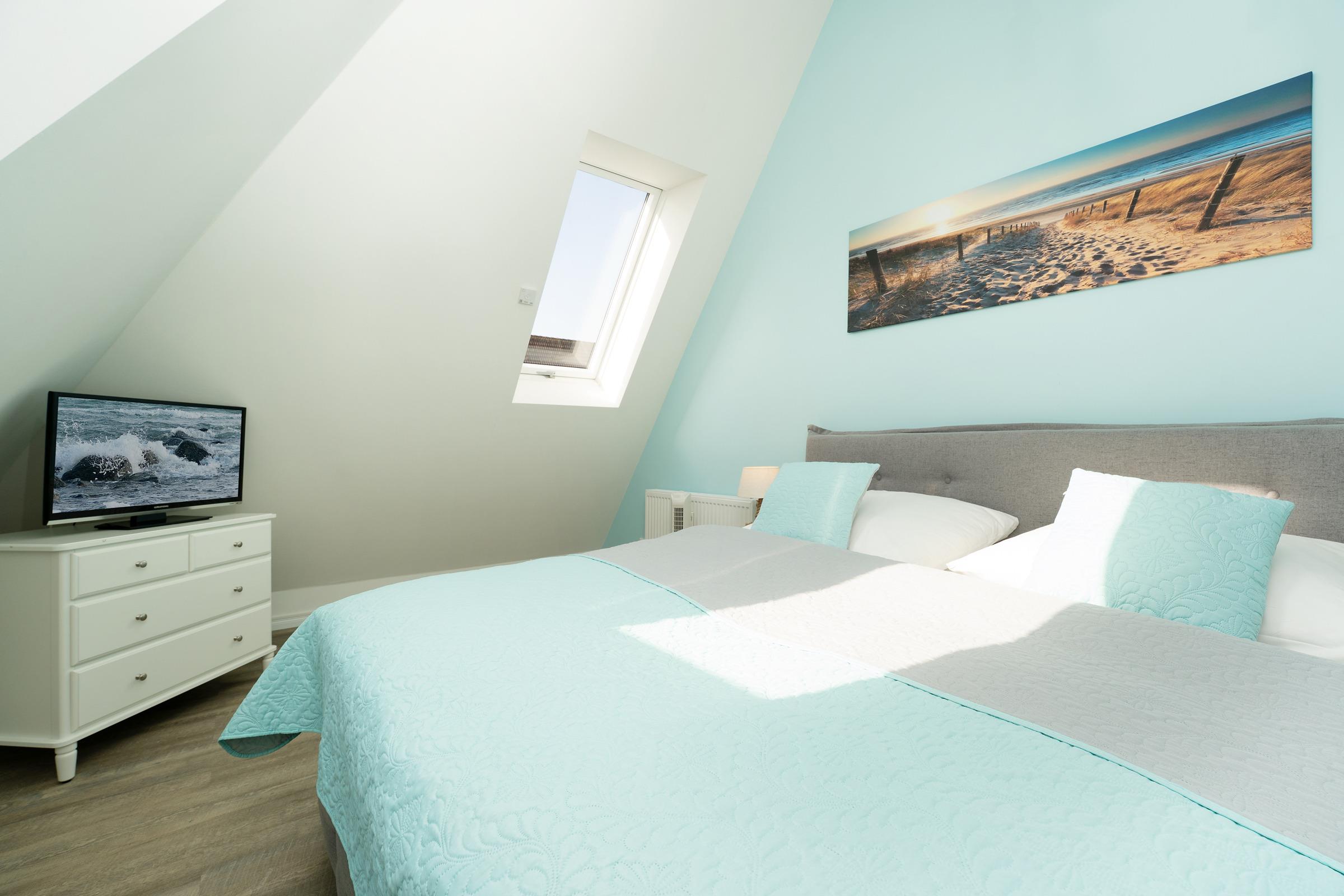 Schlafzimmer: 1 Doppelboxspringbett (180x200 cm), Kleiderschrank, TV, Verdunkelung: Rollläden, Platz für ein Babybett vorhanden