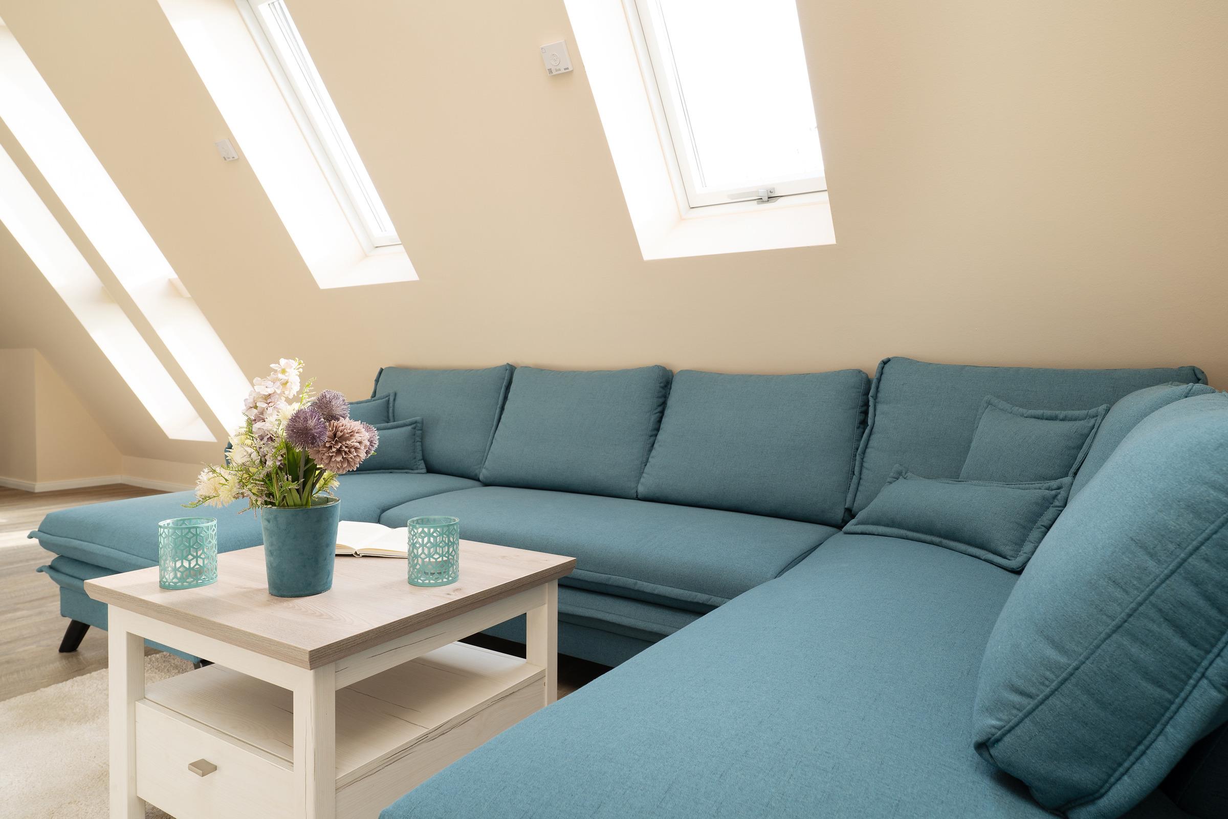 Der lichtdurchflutete Wohnbereich überzeugt mit einem gemütlichen Sofa, TV und Radio. Große Fenster sorgen für ein angenehmes Raumgefühl und Sichtschutz für Privatsphäre. Der offene Küchen- und Essbereich grenzt direkt an das Wohnzimmer und ist mit Induktionsherd, Backofen, Kühlschrank mit Gefrierfach, Mikrowelle, Spülmaschine, Toaster, Wasserkocher und Senseo-Kapselmaschine umfassend ausgestattet.