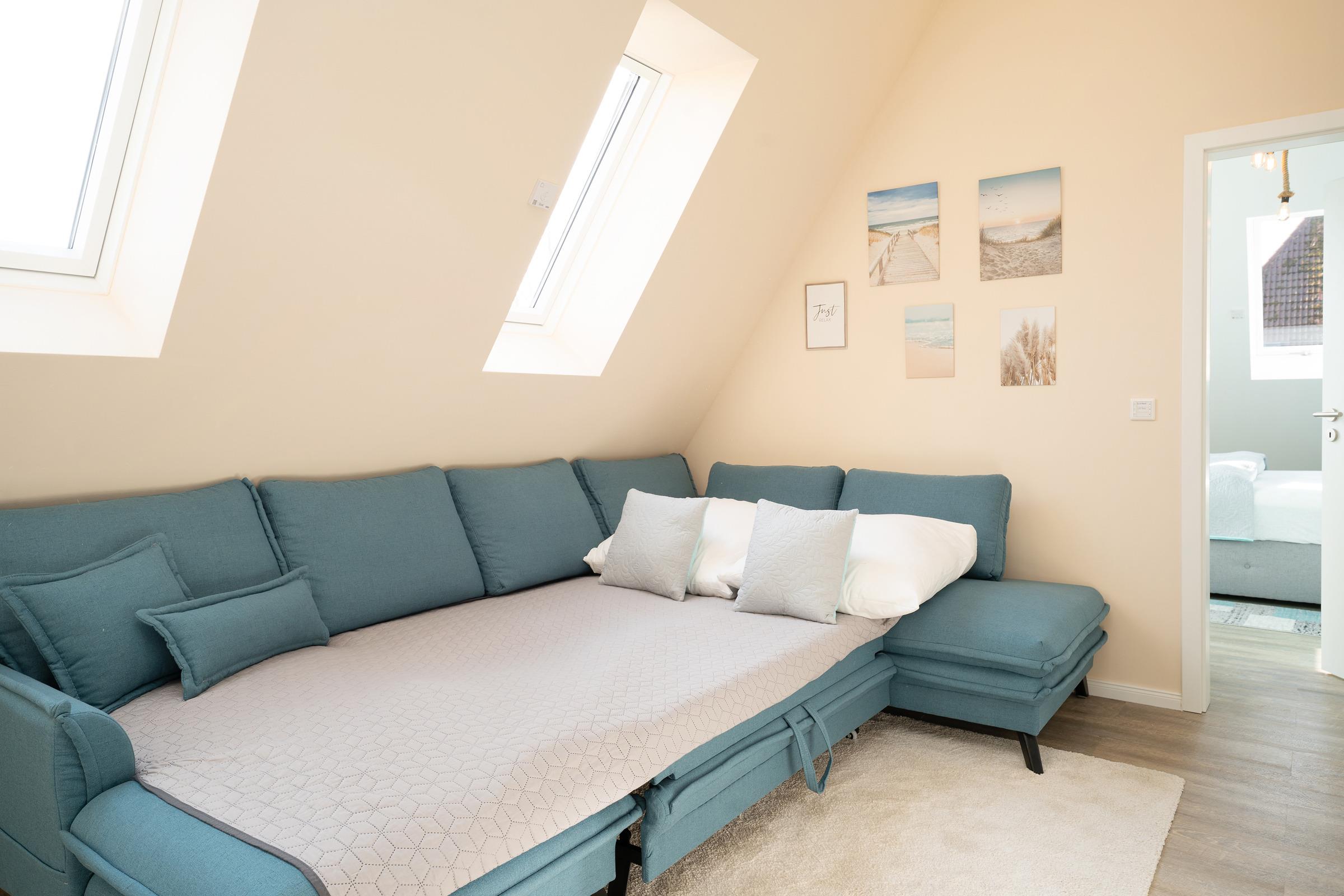 Wohnzimmer: 1 Schlafsofa (130x270 cm), TV, Verdunkelung: Rollläden, Platz für ein Babybett vorhanden