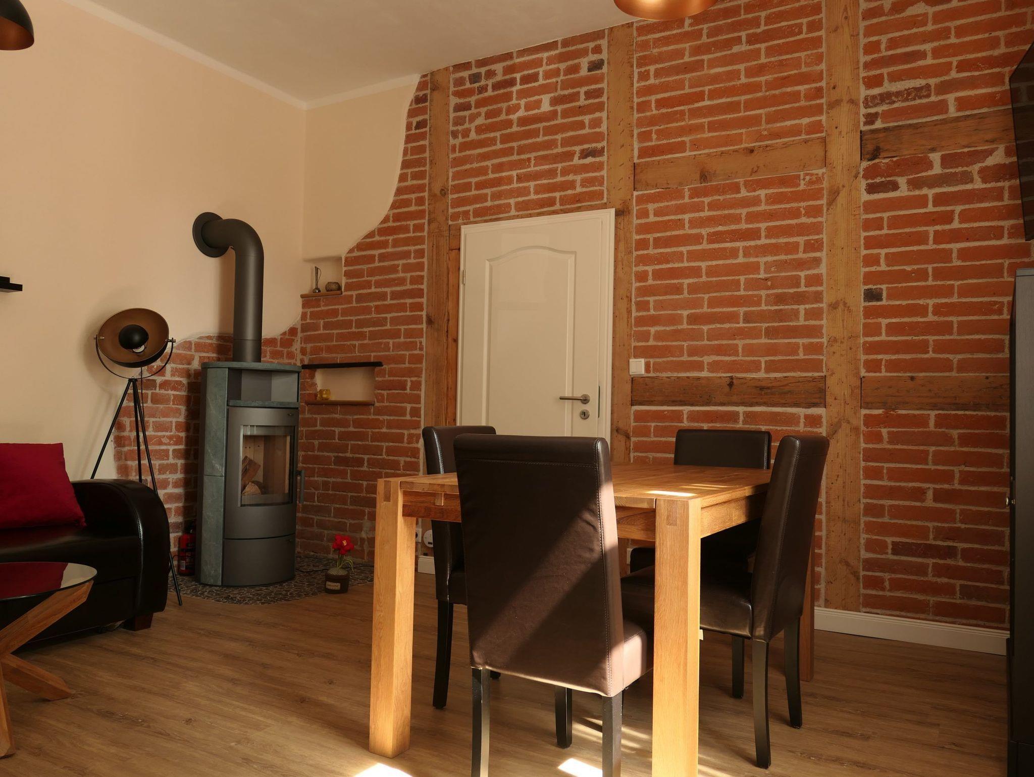 Die Ferienwohnung wurde Anfang 2022 fertiggestellt. Dabei wurde mit den verwendeten Materialien, wie Kalkputzen oder Holzfaserdämmung besonderer Wert auf ein gesundes Wohnklima gelegt. Die freigelegten historischen Fachwerkwände harmonieren mit der stilvollen Einrichtung aus Echtholzmöbeln und Leder. Besondere Akzente setzen handgefertigte Details aus schwarzem, mehrere tausend Jahre altem, Mooreichenholz aus der Elbe.