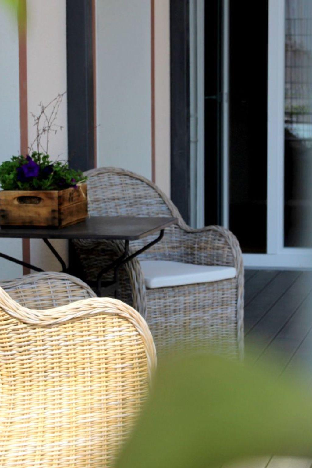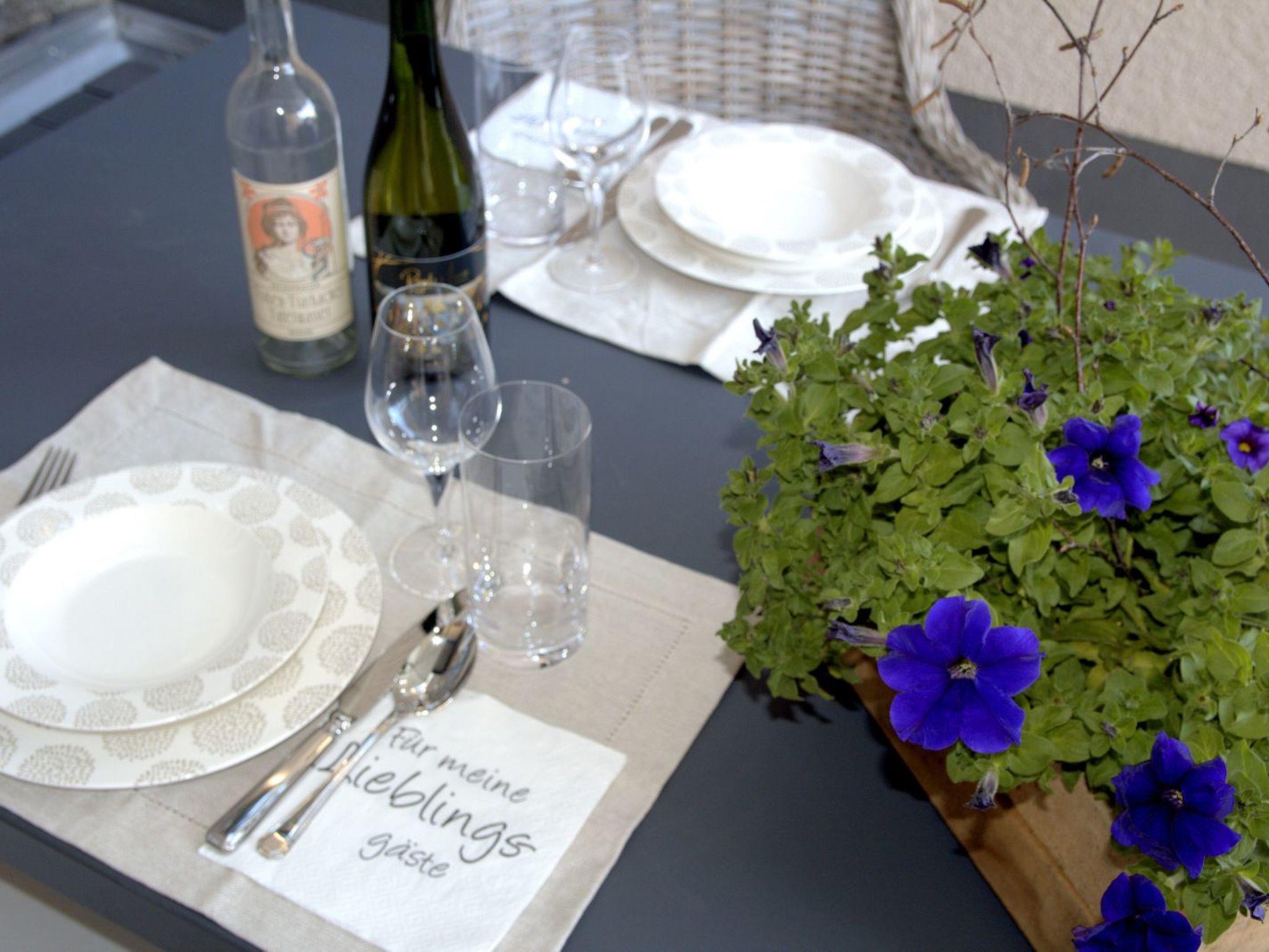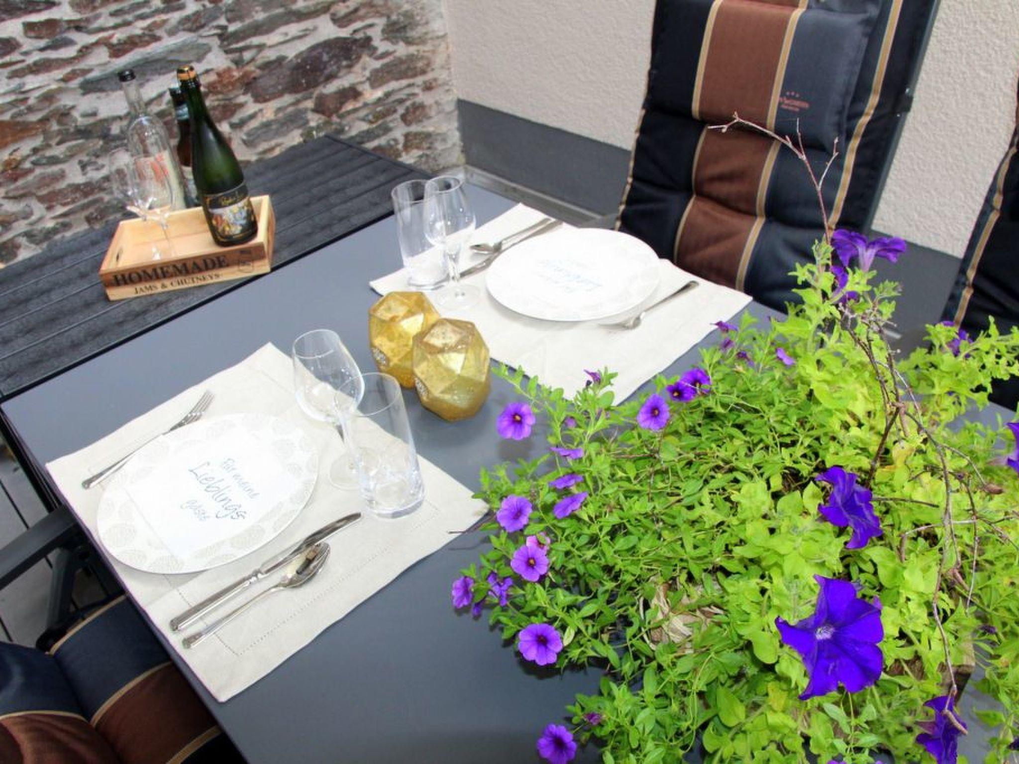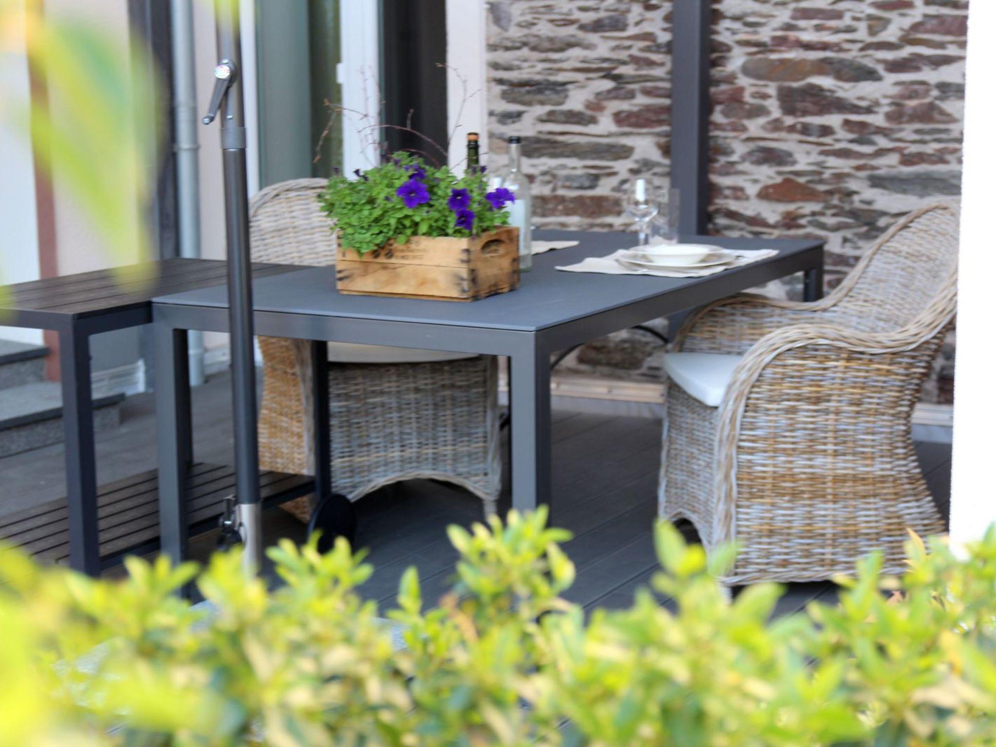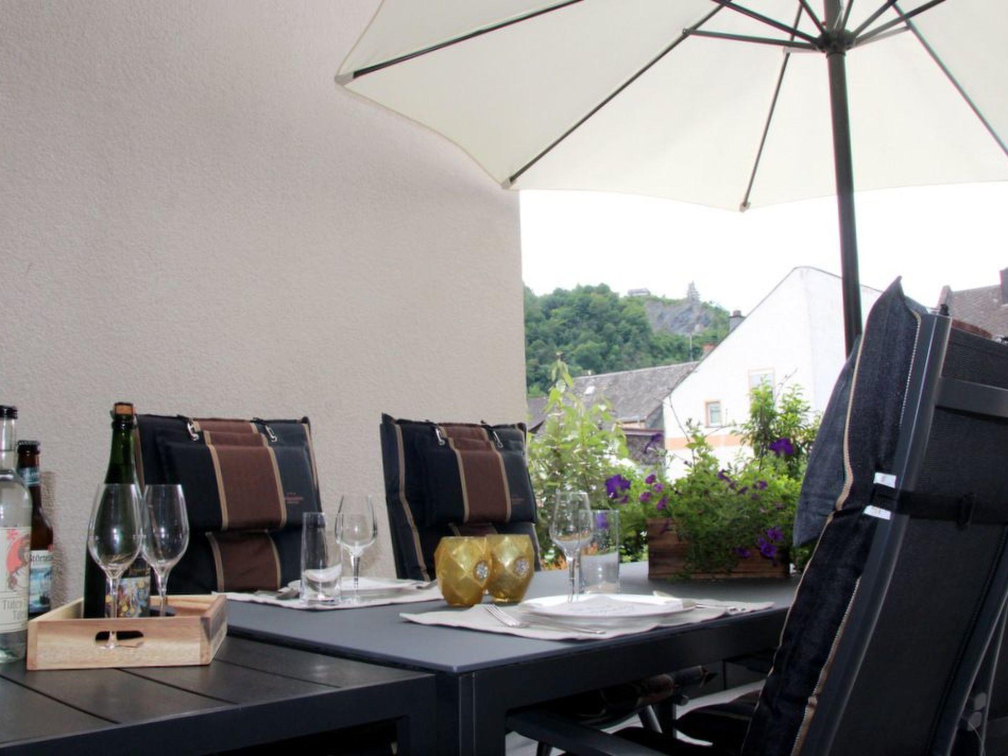 An approx. 35 square metre sun terrace awaits you with greenery, 2 sun loungers, patio table with 4 high-back chairs and side table. There is also a parasol and the terrace is partially covered with a view of the Grevenburg.