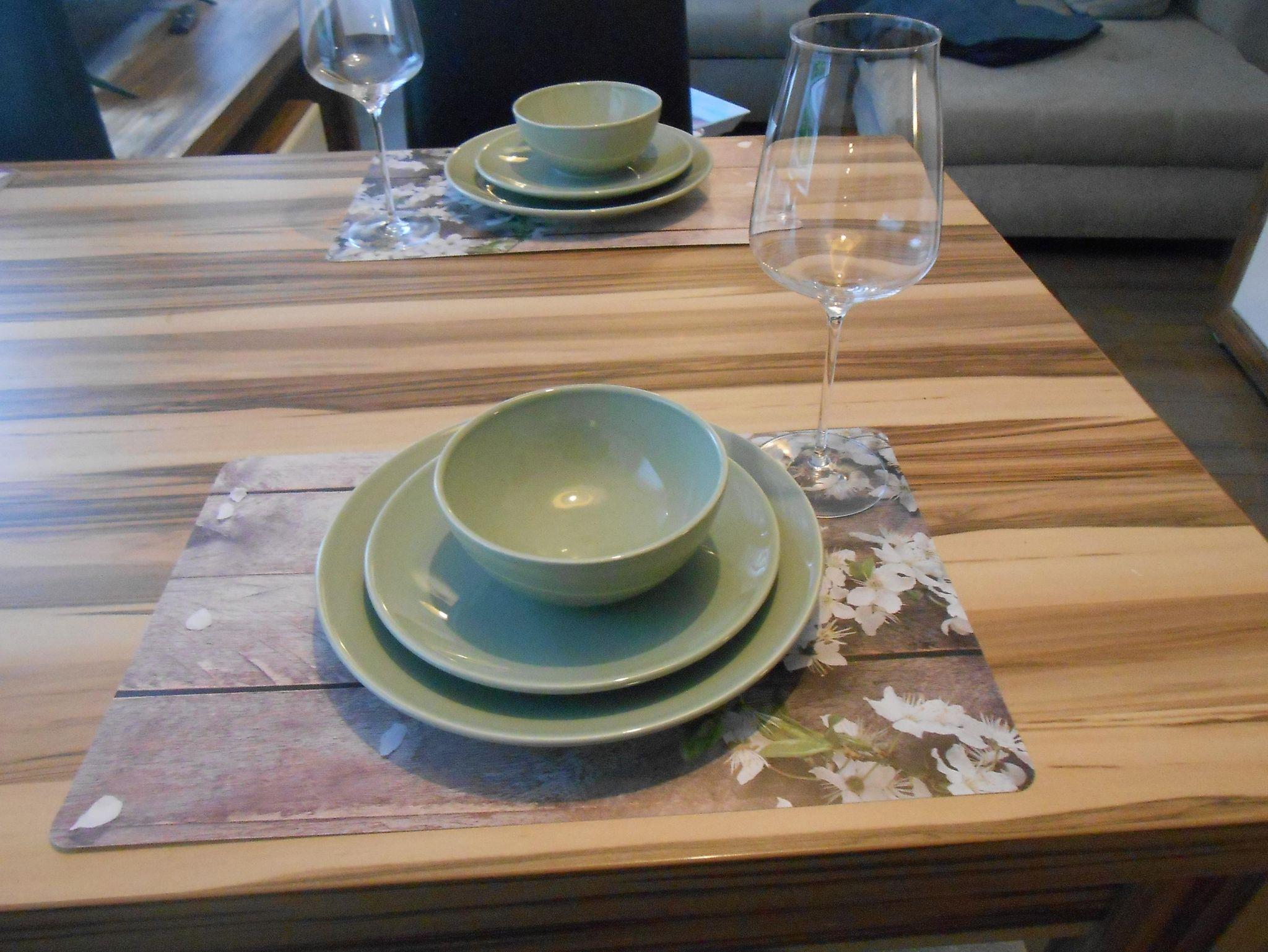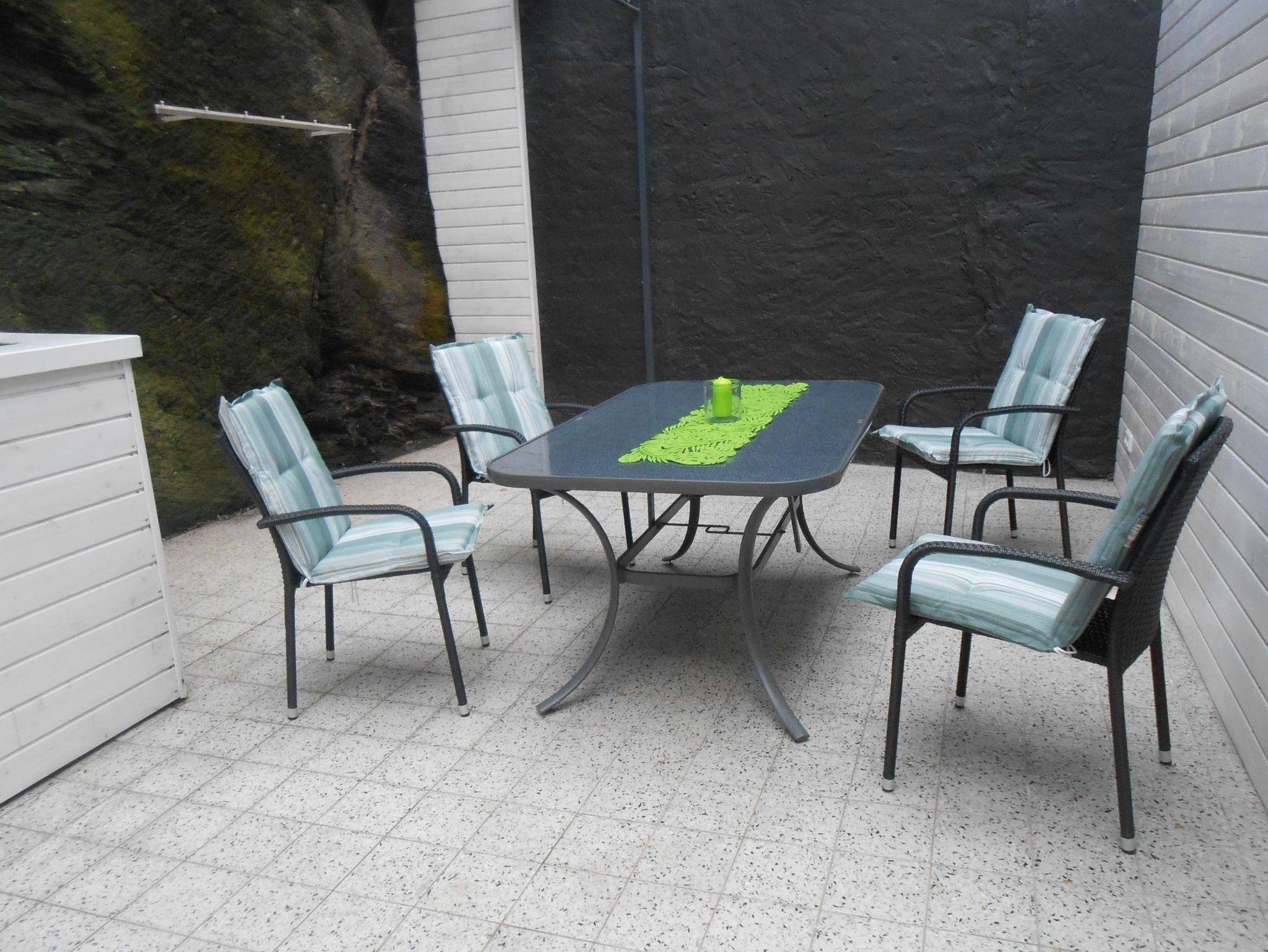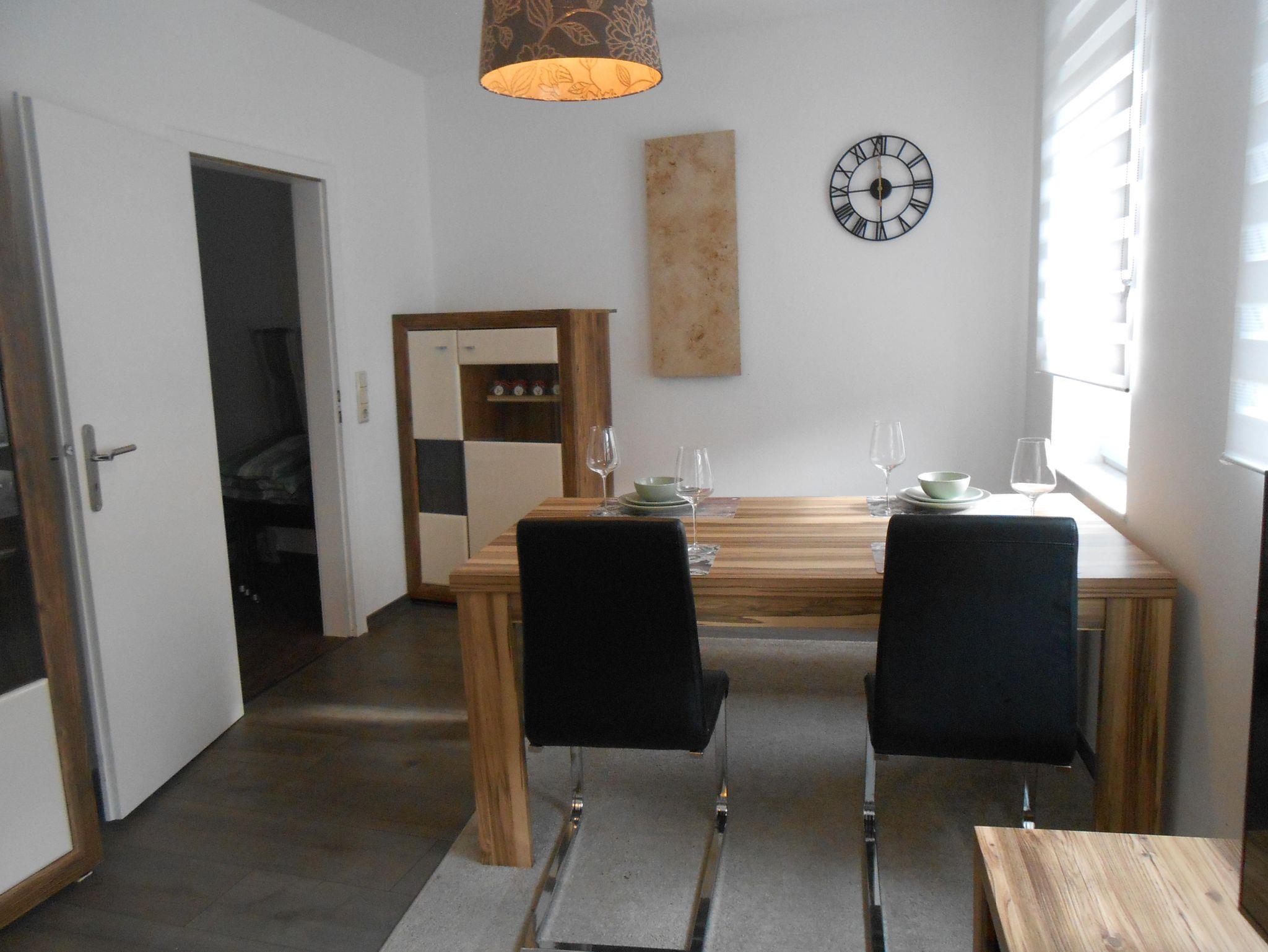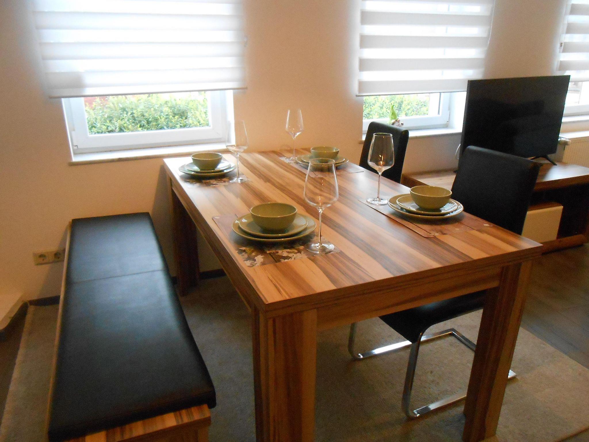 Das Ferienhaus hat im ersten Stock einen Wohnraum mit einer gemütlichen (Schlaf-) Couch und einem Flachbildfernseher. Dort lädt ein Essbereich, mit Tisch und Stühlen, zum gemeinsamen Genießen ein. Auf diesem Stockwerk befindet sich auch die voll ausgestattete Küche. Diese verfügt über eine moderne Kochzeile mit Elektroherd, Backofen, Geschirrspüler, Kühlschrank, Kaffeemaschine, Wasserkocher, Toaster sowie Geschirr und Besteck. Auf dieser Etage kann sich ihr gesamter Tagesablauf abspielen. An die Küche angeschlossen ist die Gästetoilette zu finden. Ebenso kann von der Küche aus, die Terrasse am Weinbergfels betreten werden. Diese lädt mit einer bequemen Sitz- und Essgelegenheit zur gemeinsamen Entspannung ein.