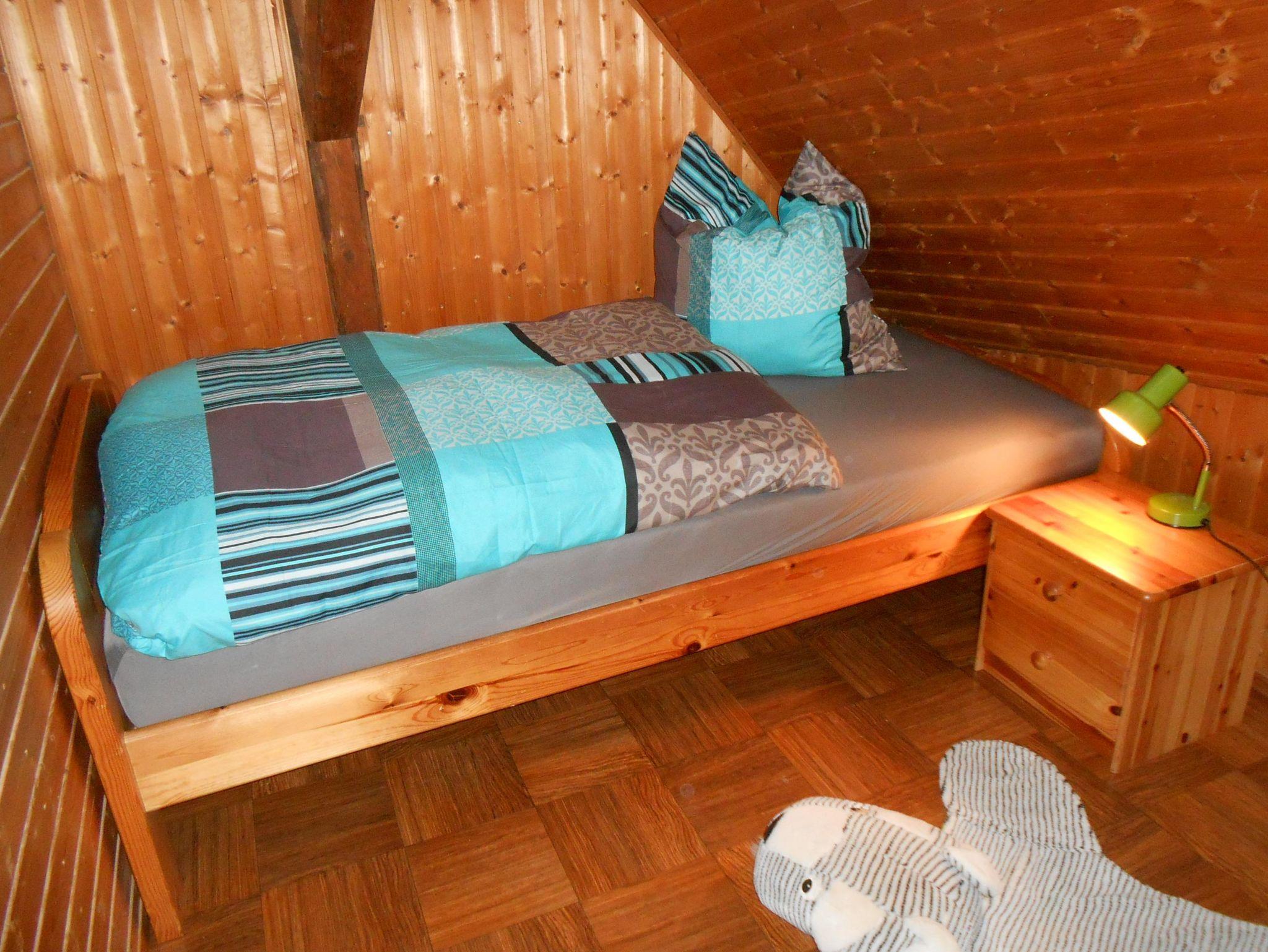 Im Schlafzimmer (2. Stock) finden Sie ein Doppelbett, sowie eine Kommode und Garderobe für die Aufbewahrung ihrer Reisekleidung. Auf der gleichen Etage finden Sie auch einen weiteren Schlafbereich mit einem Einzelbett (90x200 cm). Dieser eignet sich besonders gut für ein älteres Kind.