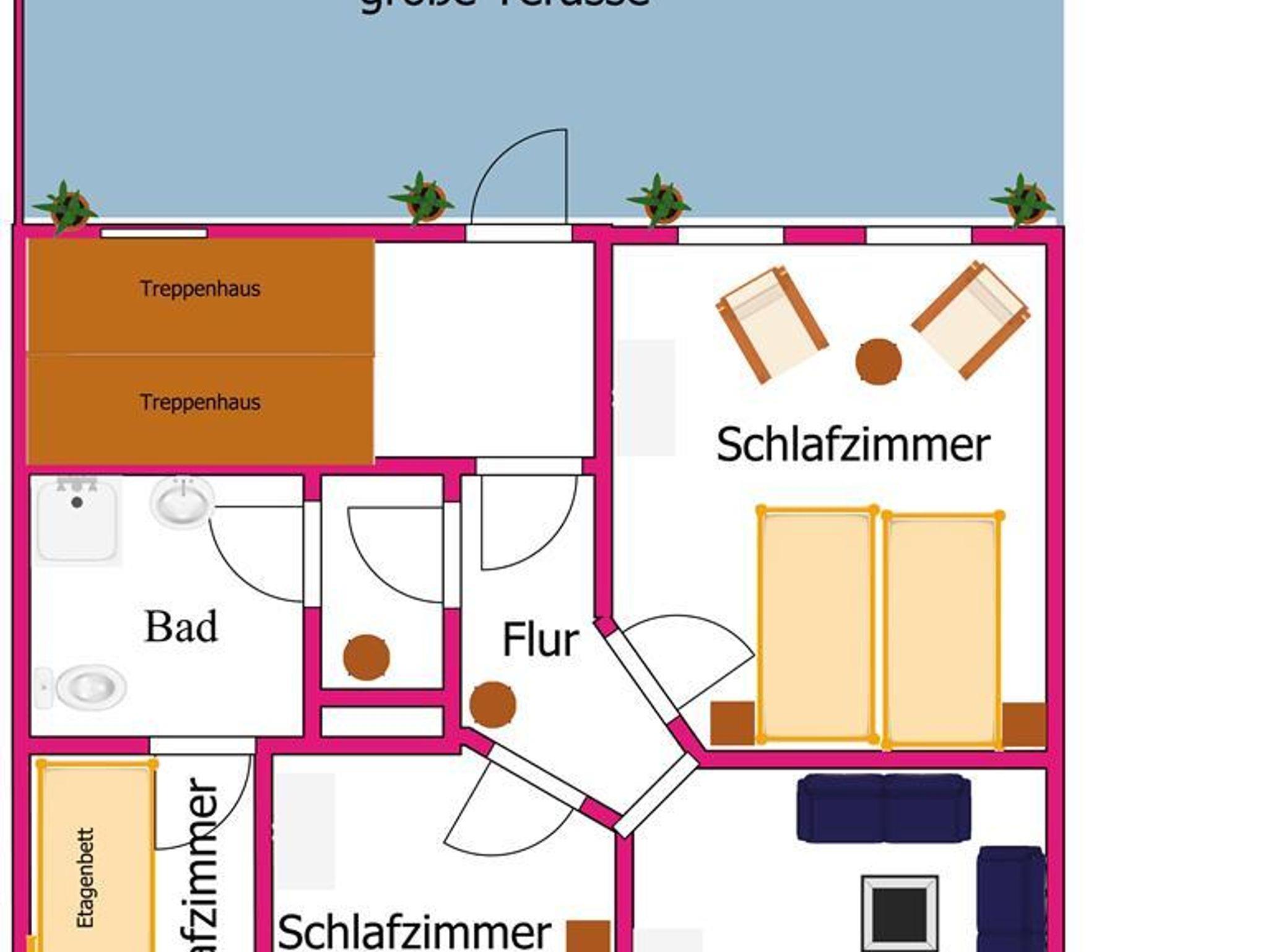 70m² große Wohnung für 4 Personen (5 Personen) mit 2 Schlafzimmern, seperater Eingang, große Terrasse zum ruhigen Innenhof.