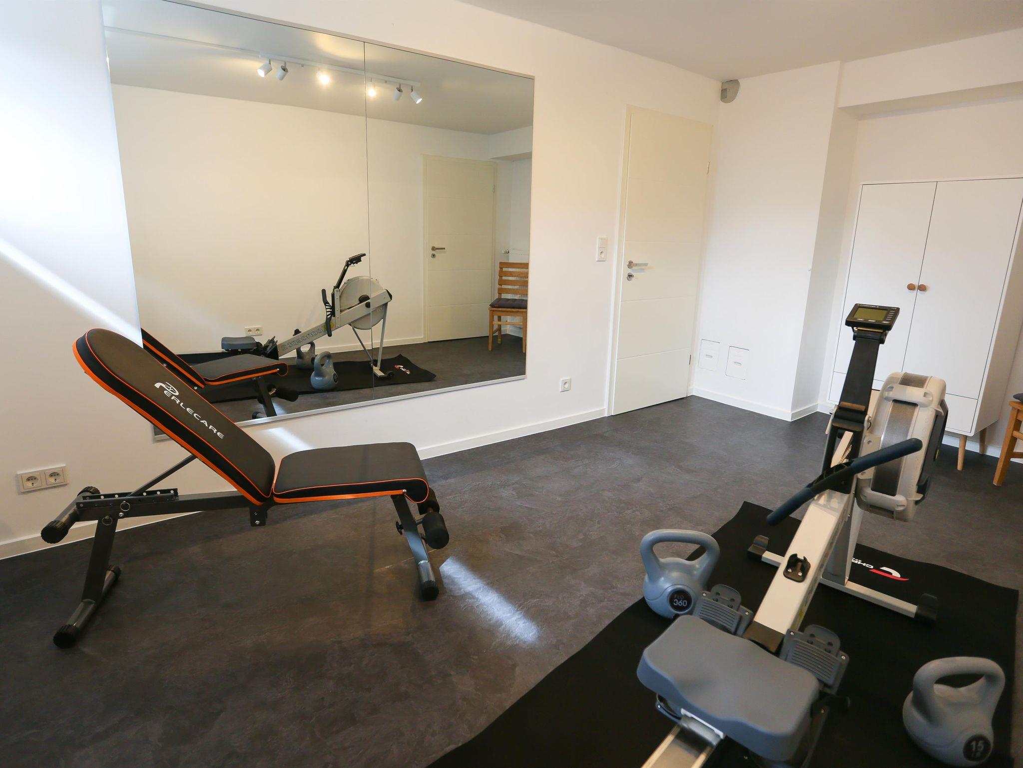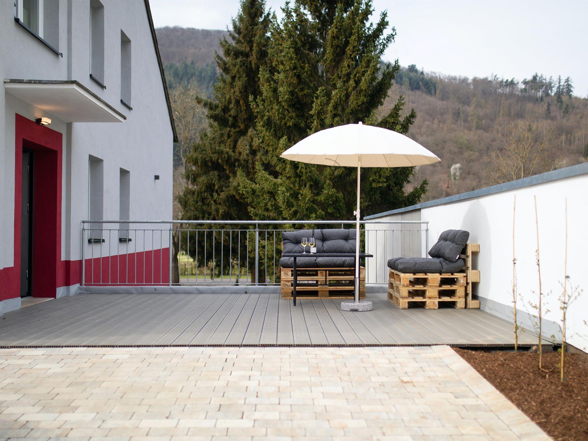 Rattanmöbel Lounges und Liegen laden zum chillen und sonnenbaden ein. Der große Weinkühlschrank ist stets mit den Spitzenweinen unseres Weingutes Römerhof gefüllt. 24/7 Fitnessraum ebenfalls im Untergeschoss.