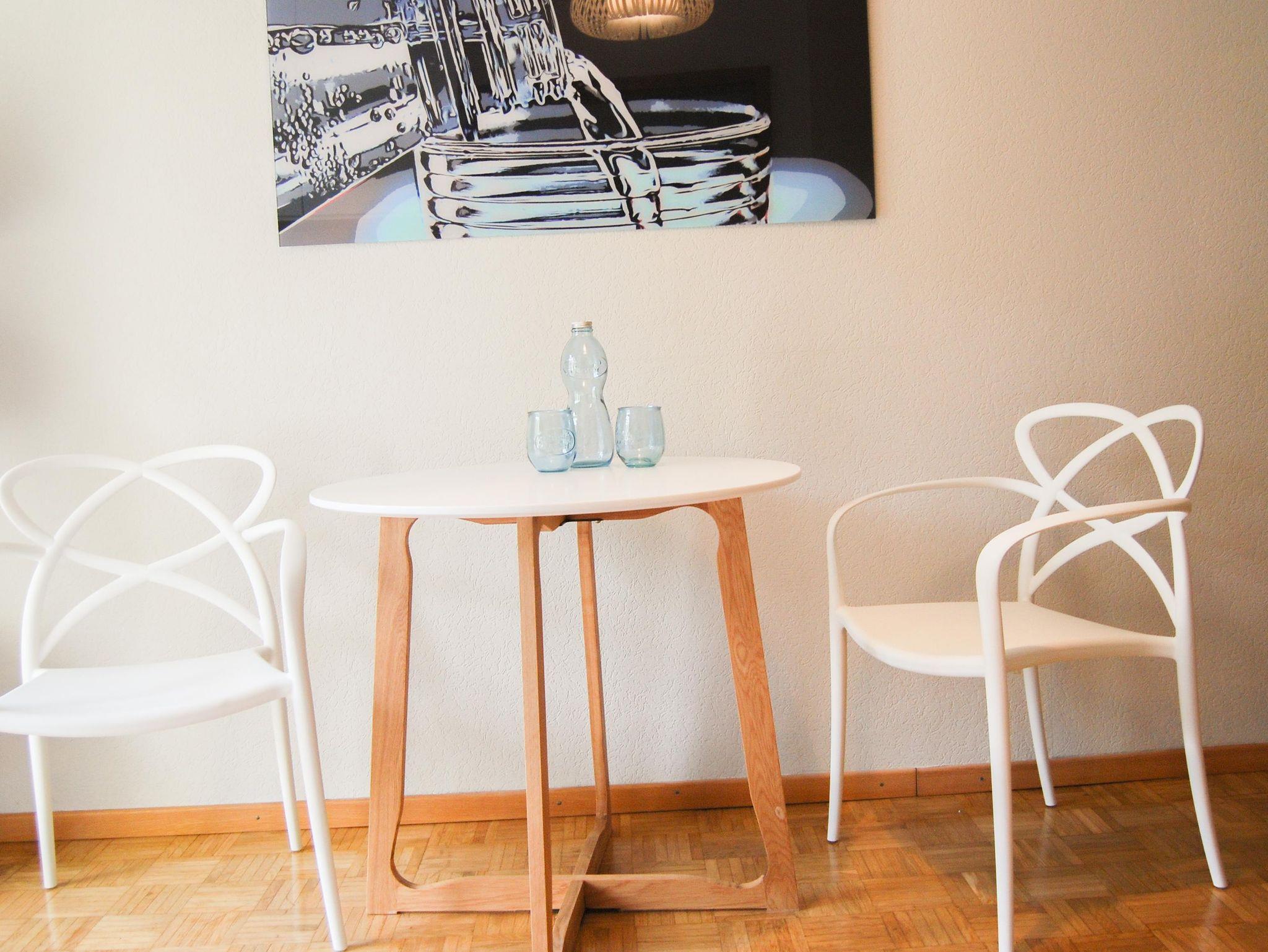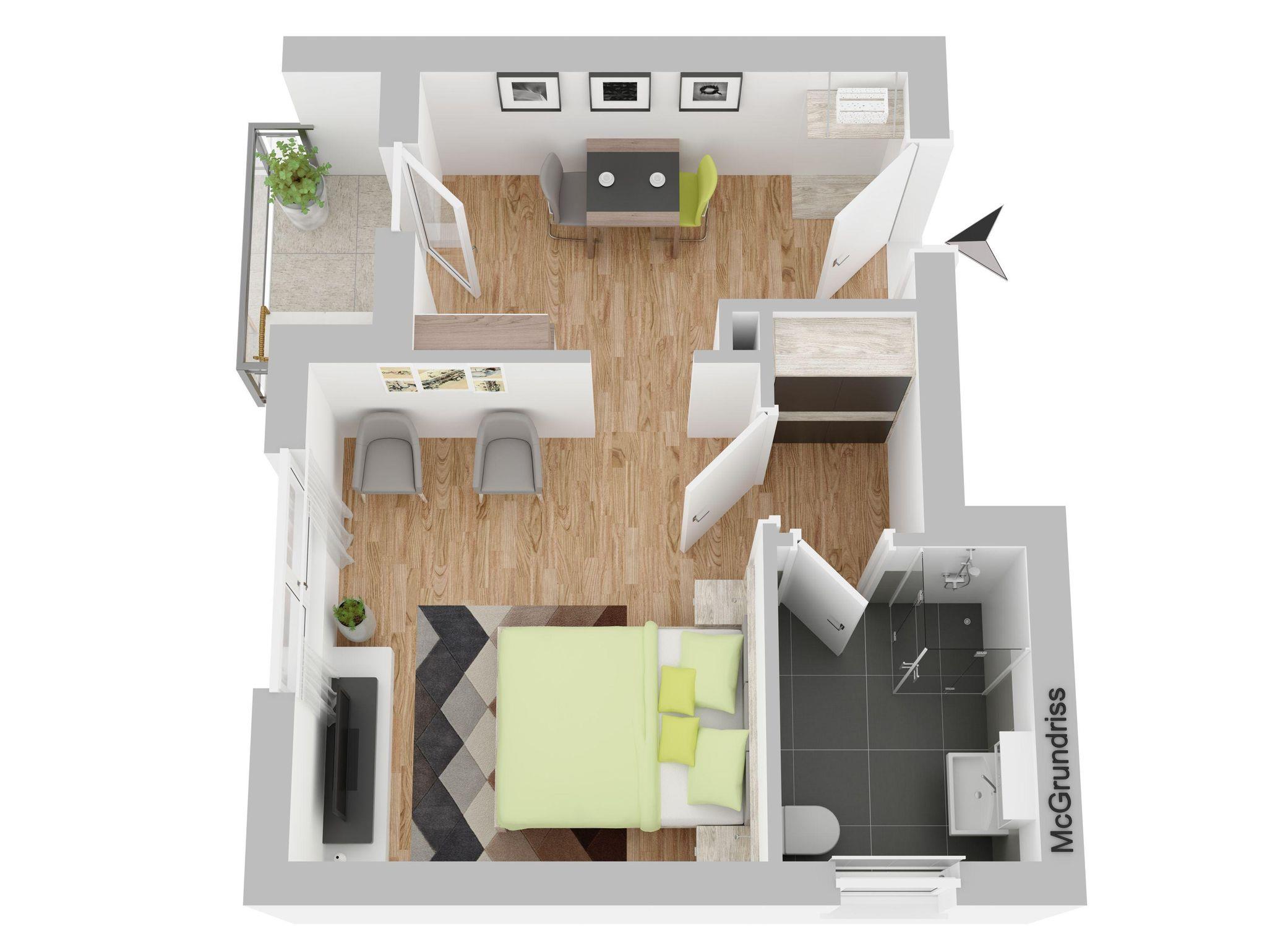 Das Apartment verfügt über einen offenen Grundriss mit einem kleinen, aber gut ausgestatteten Kochbereich mit 2 Kochfeldern, Kühlschrank, Mikrowelle, Minibackofen und einem Essbereich sowie einem Balkon nach vorne mit Blick auf den Park. Im angrenzenden Raum befindet sich das komfortable Bett (160x200) und eine Sitzecke, die zum Entspannen einlädt. Im Flurbereich vor dem Bad mit Quellwasserdusche ist ein eingebauter Kleiderschrank untergebracht.