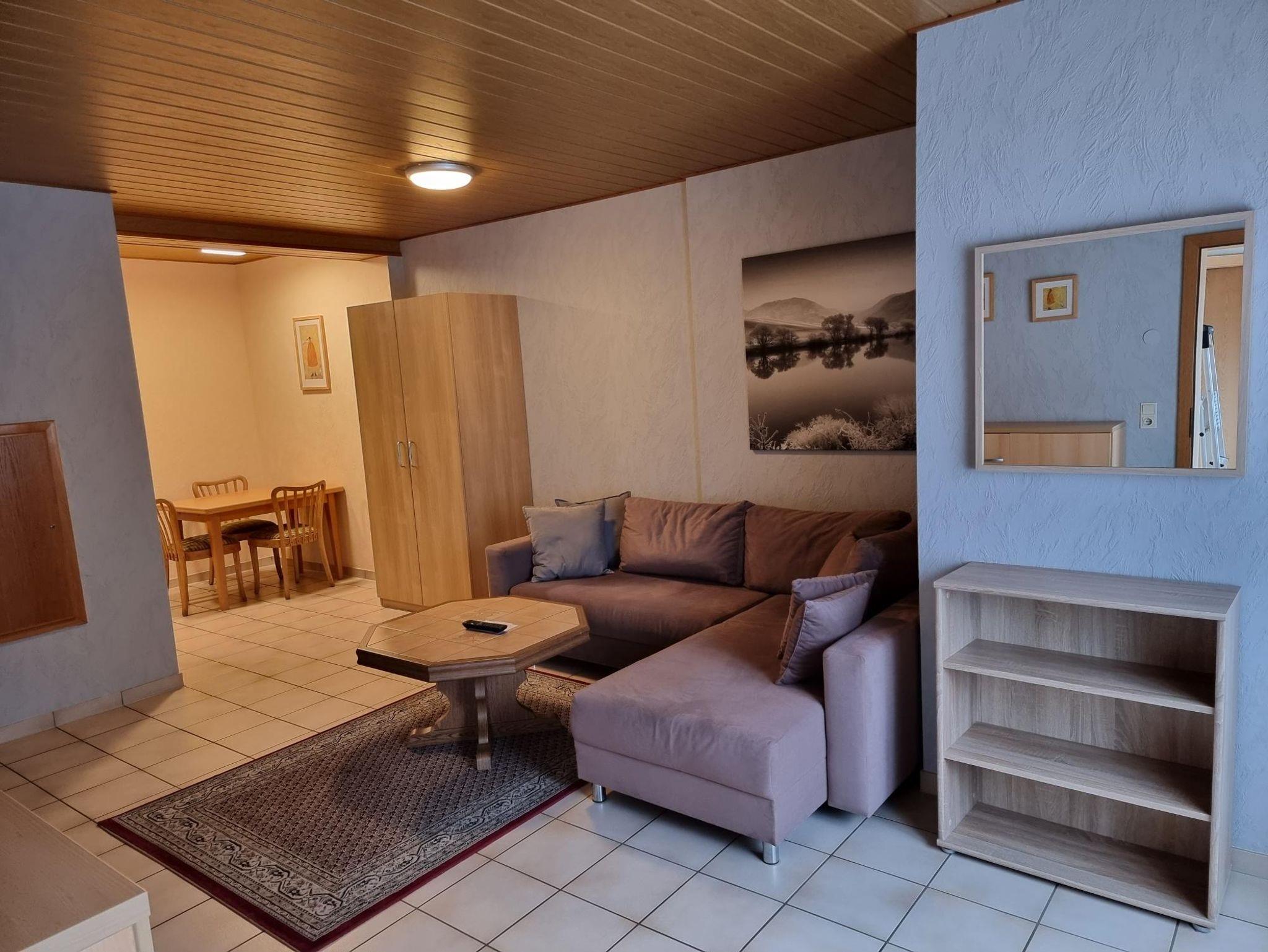 Wohnbereich mit TV, Essecke, neu renoviertes ebenerdiges Bad.