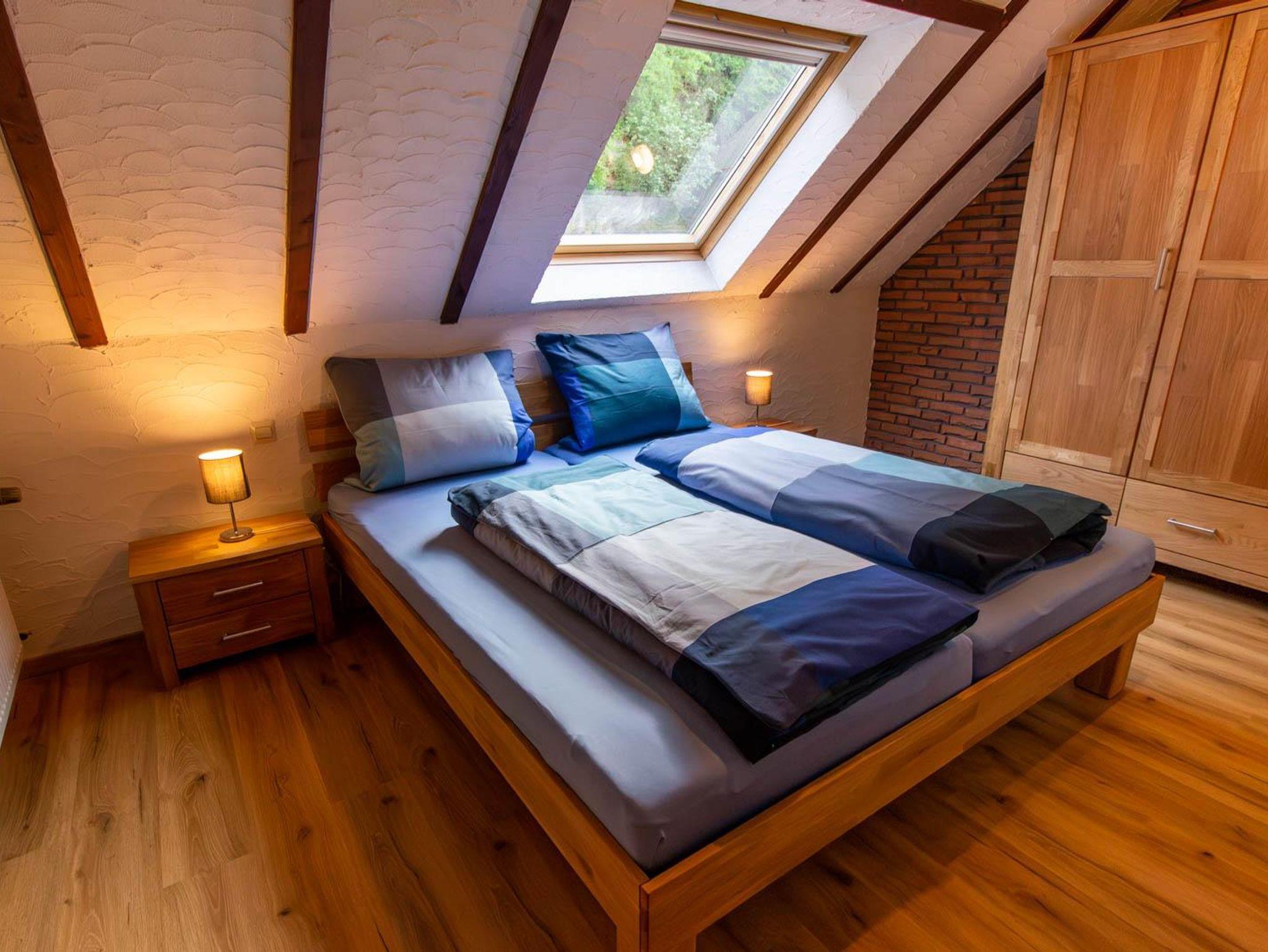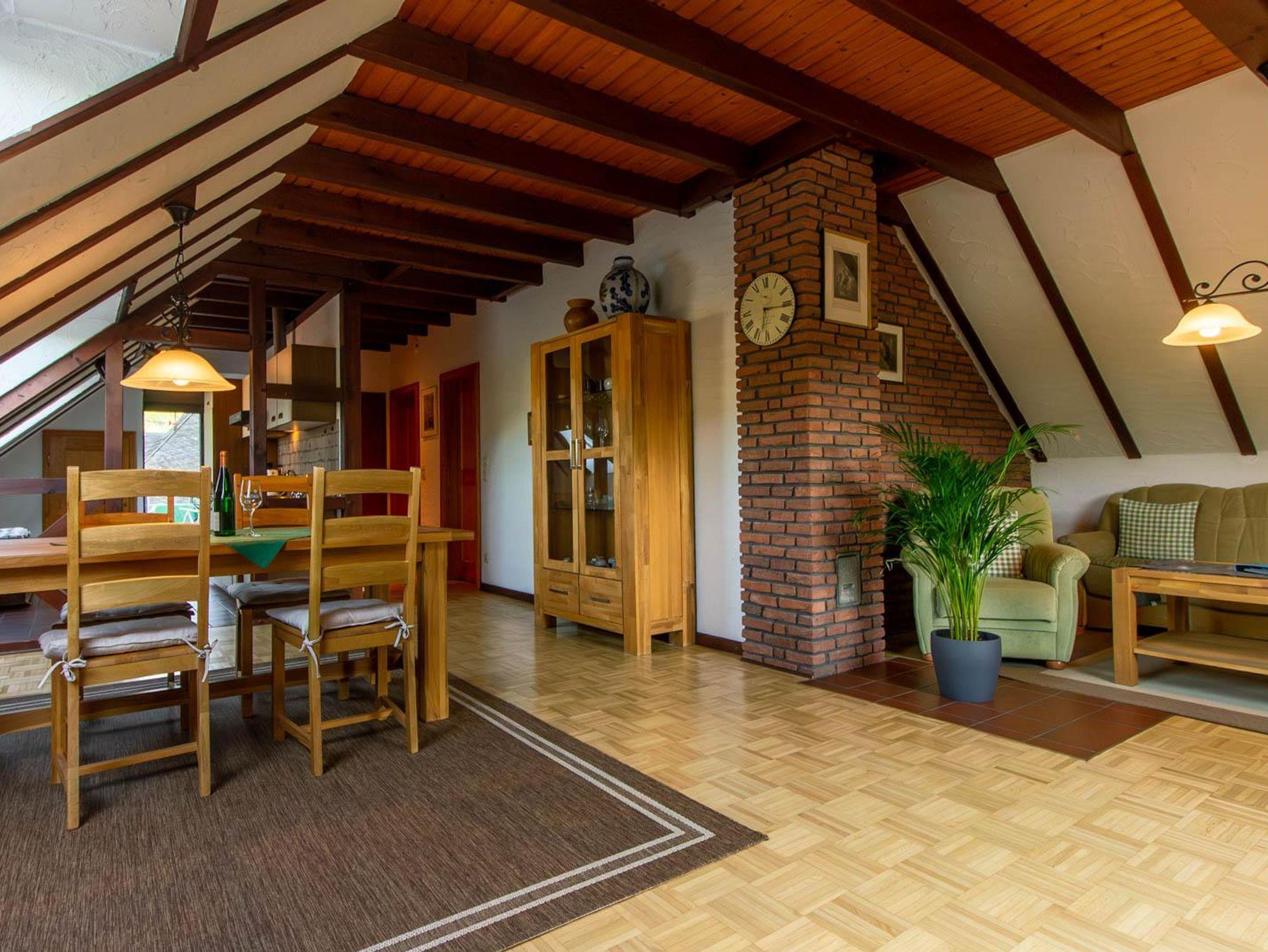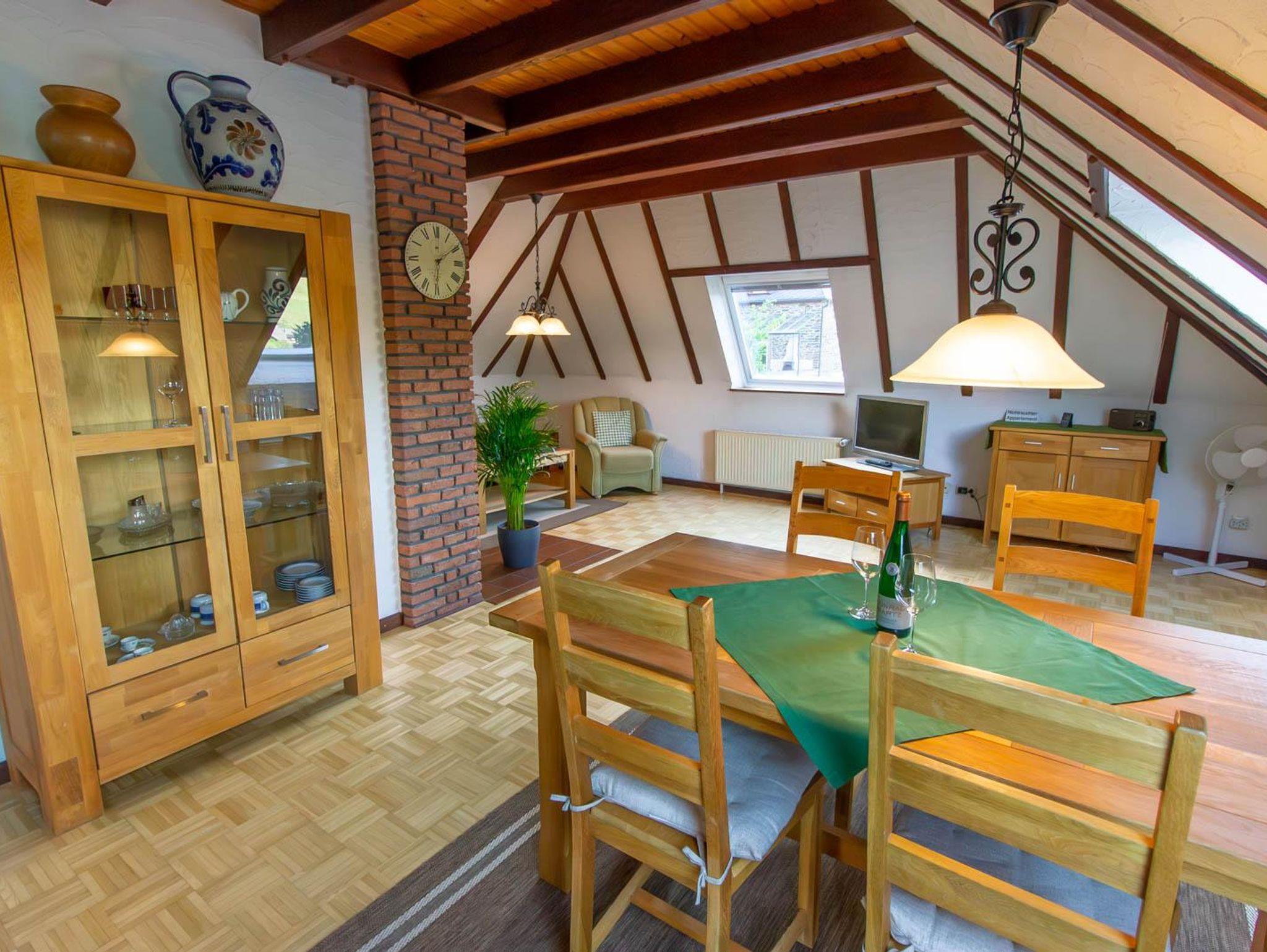 65 m² große Dachwohnung mit großer Dachterrasse, Moselblick, Grillmöglichkeit. Großer Wohnraum mit Sofabett, SAT-TV, Radio. Küche, 1 Doppelschlafzimmer, Badezimmer mit Bad/Dusche/WC.